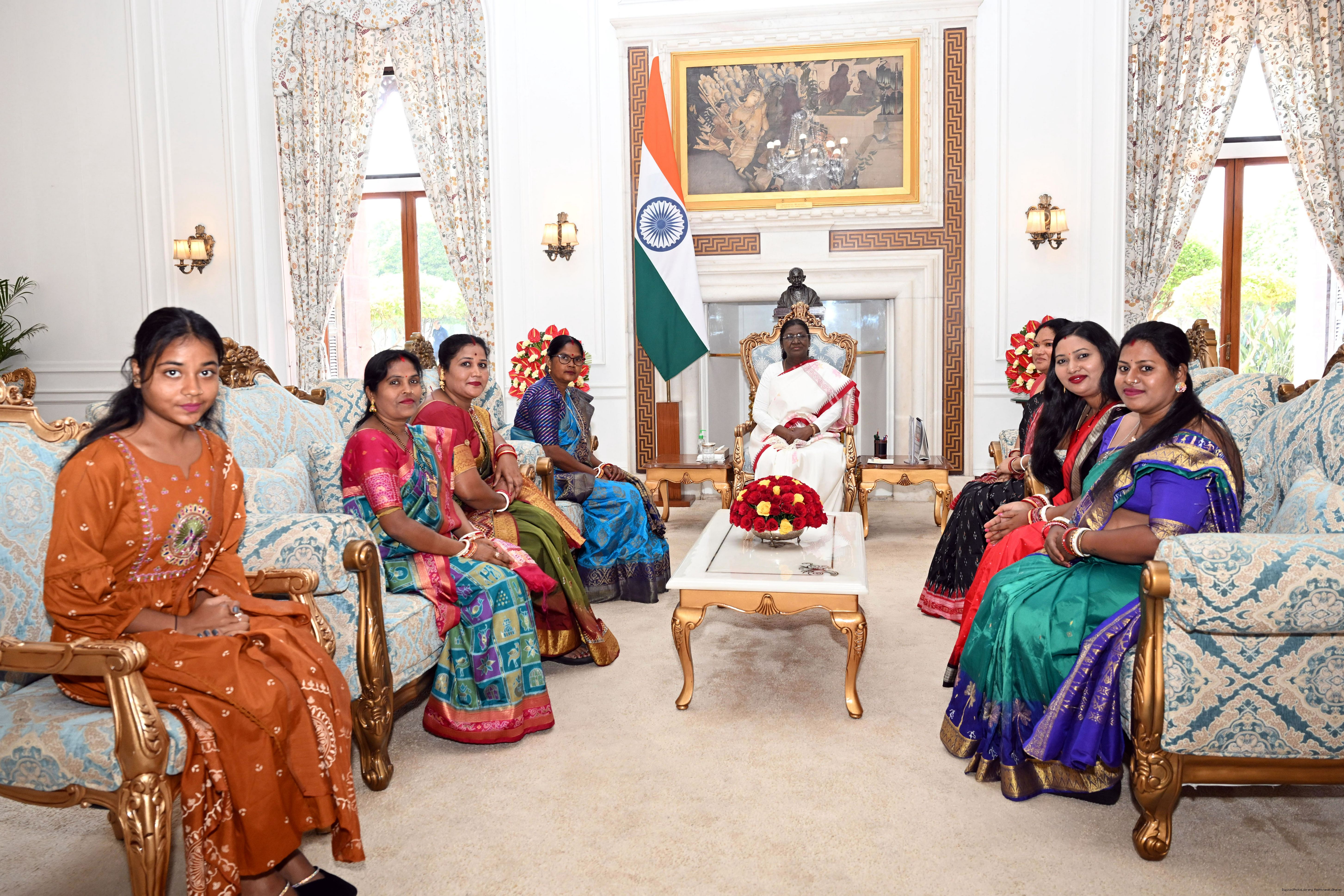 | Caption: | Ms. Nirupama Soren from Rairangpur along with Ms. Rani Mandal and others meeting with the President of India Smt. Droupadi Murmu at Rashtrapati Bhavan on March 2, 2026. |