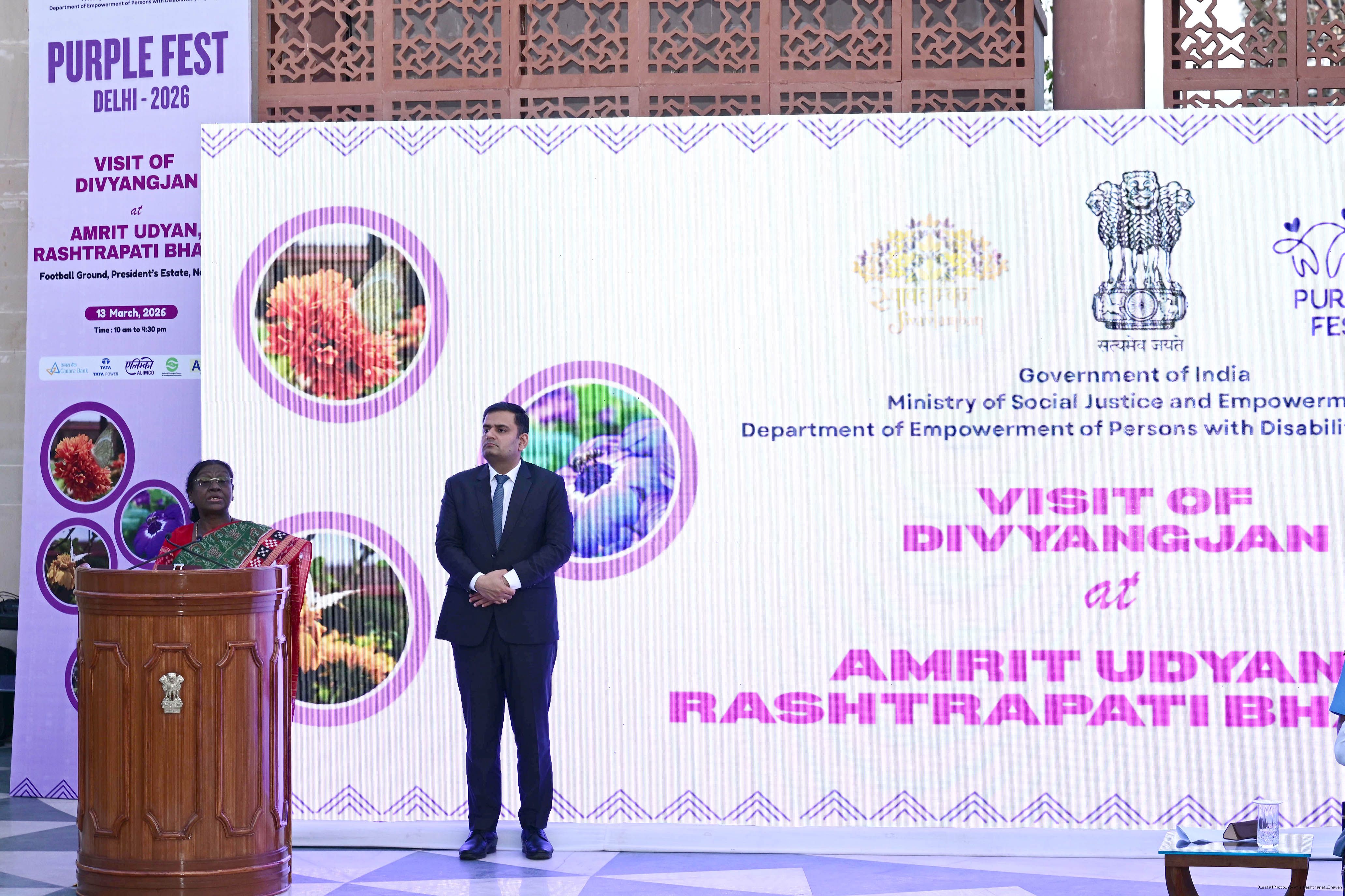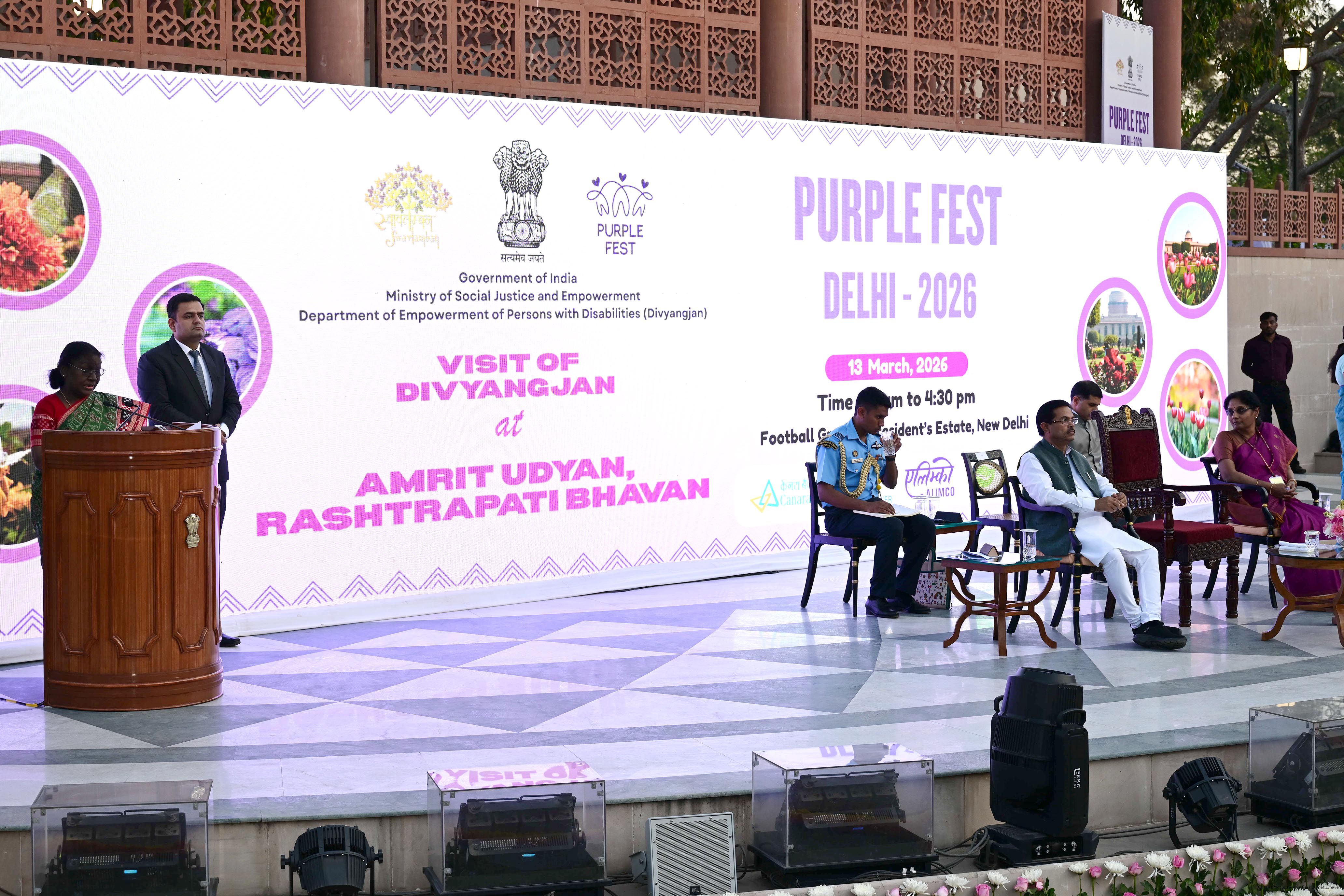 | Caption: | The President of India, Smt Droupadi Murmu witnessed the cultural performances by Divyangjan organised as part of the 'Purple Fest’, Celebration organized by the Ministry of Social Justice Empowerment, GOI at Rashtrapati Bhavan on March 13, 2026. |