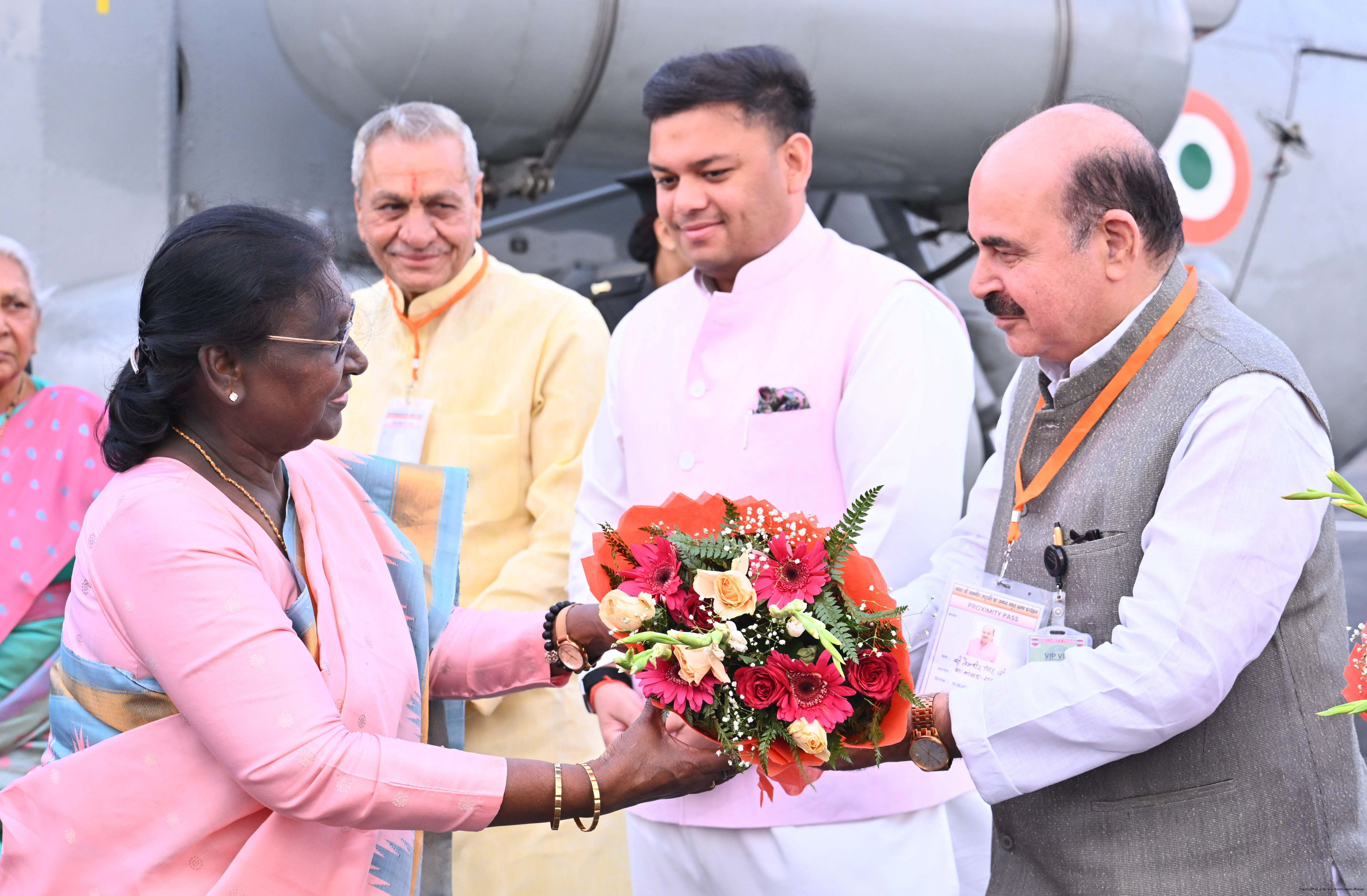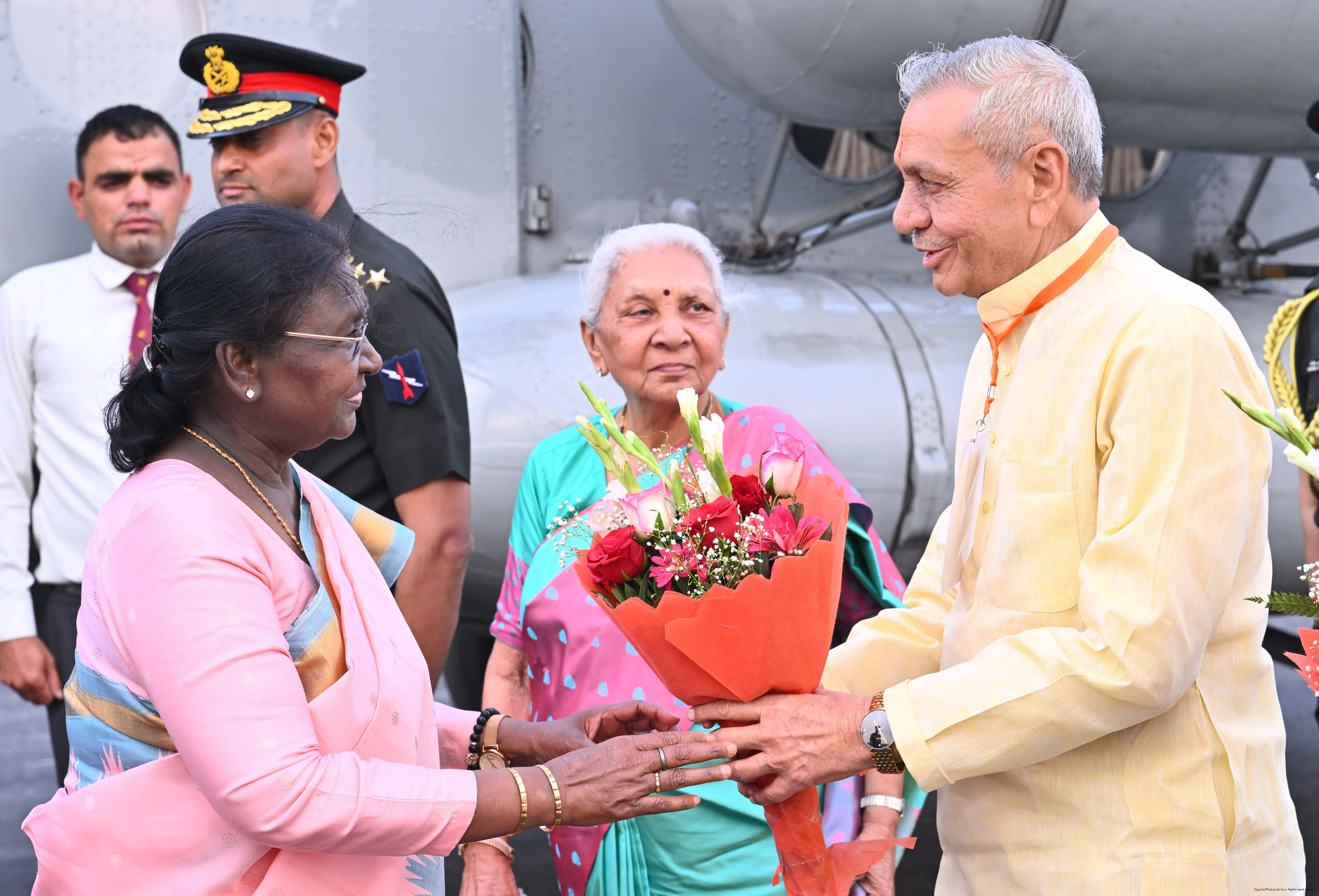 | Caption: | The Governor of Uttar Pradesh, Smt Anandiben Patel and along with others received the President of India, Smt Droupadi Murmu on her arrival at Army Area Helipad, Mathura Cantt on March 19, 2026. |