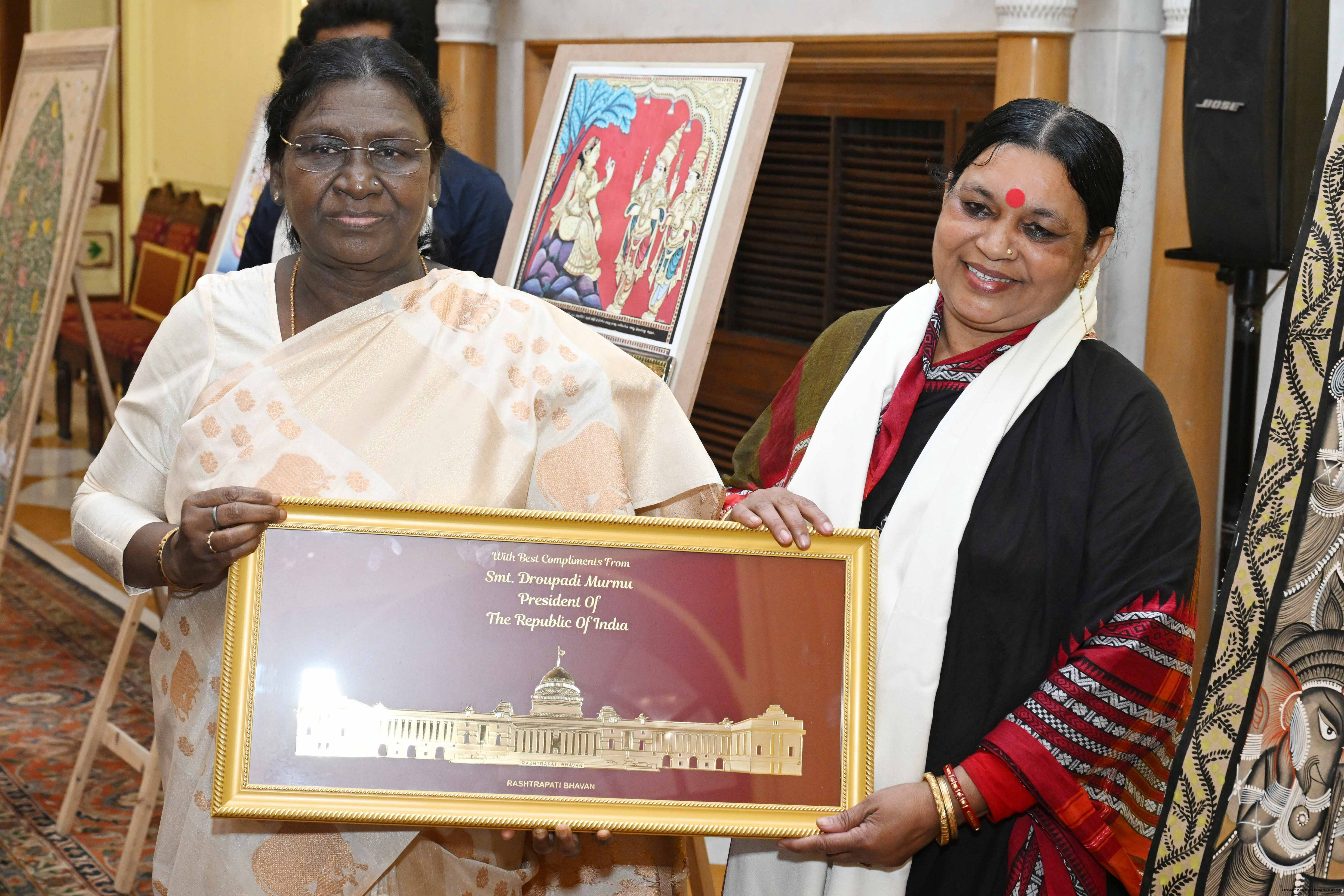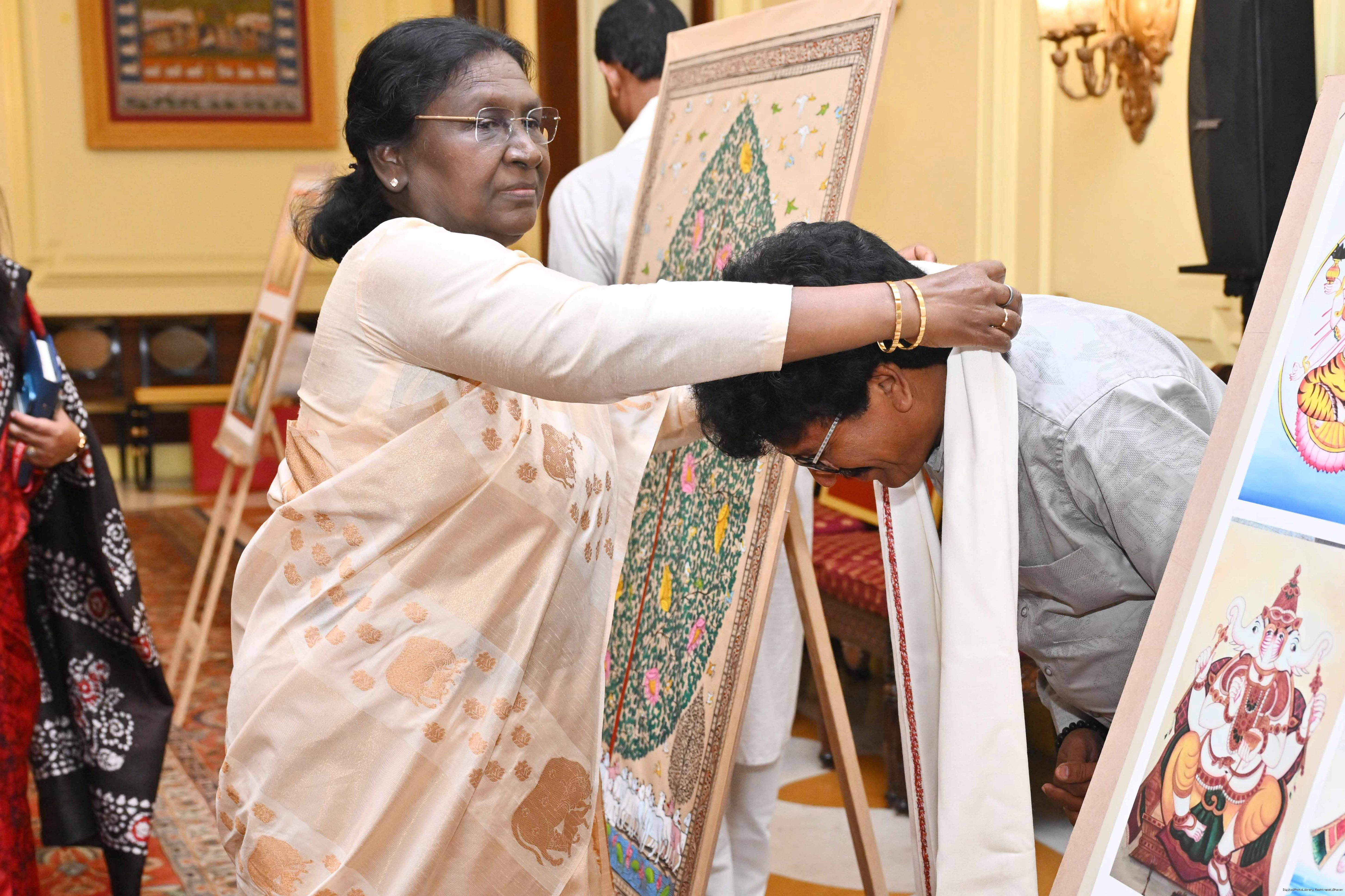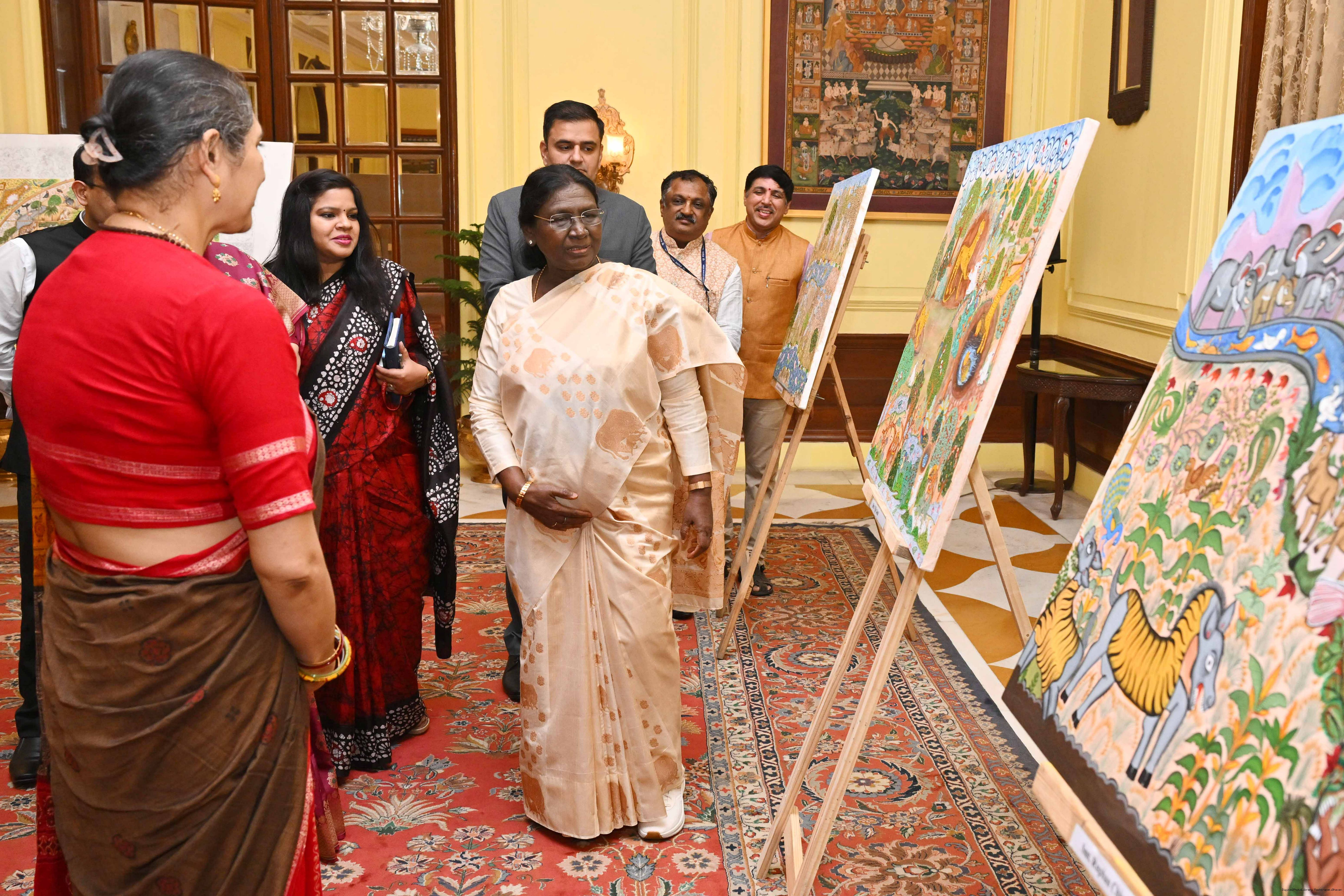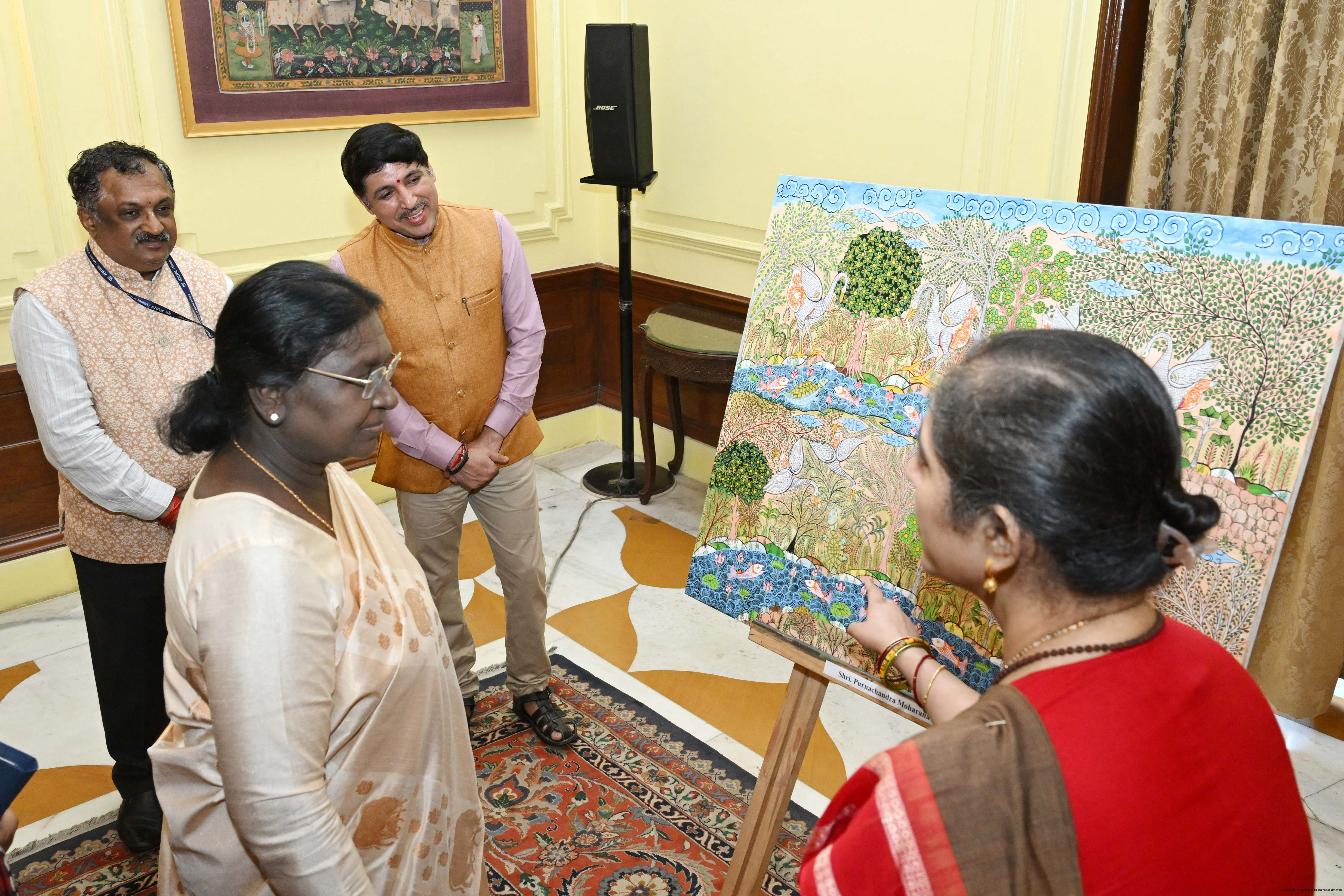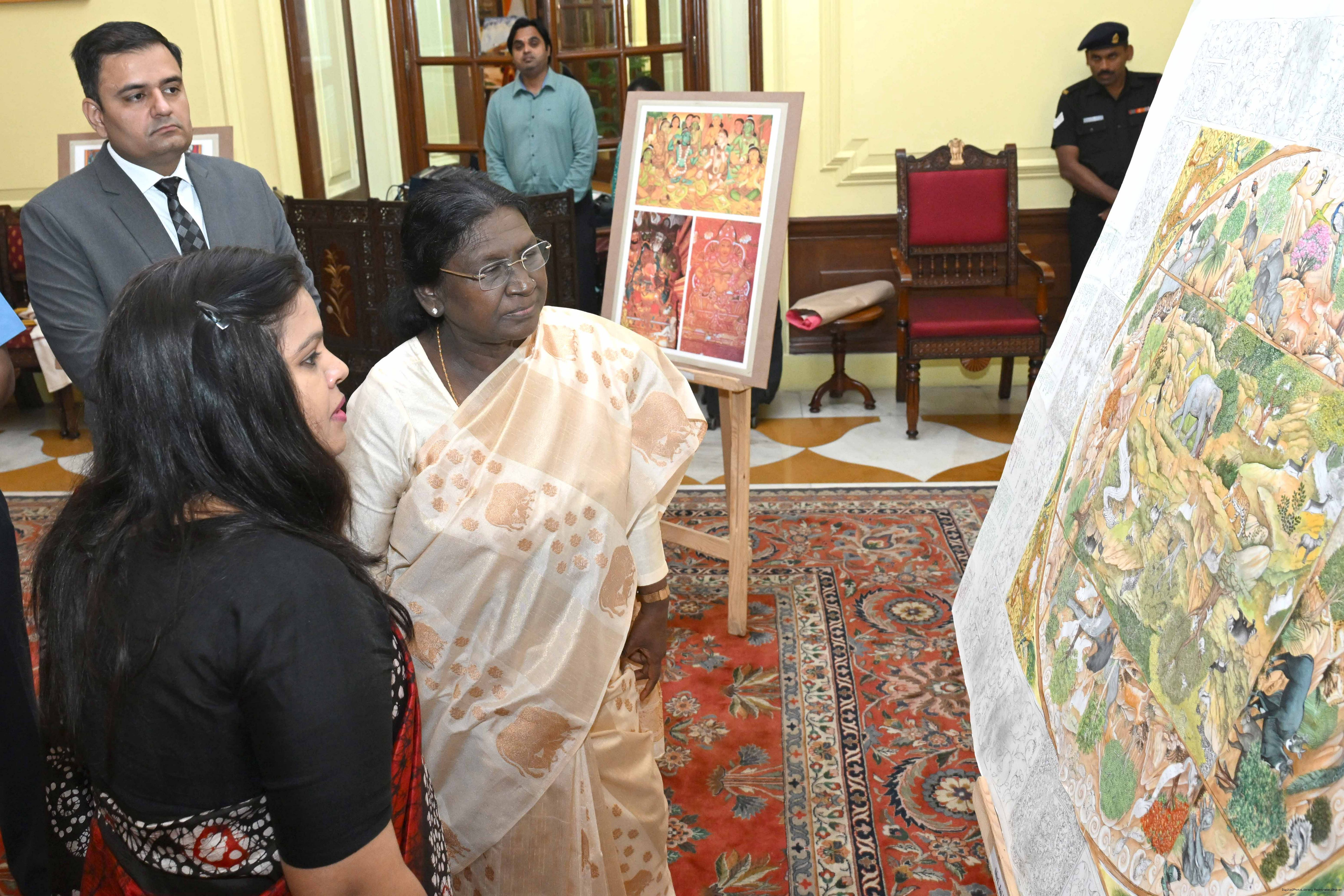 | Caption: | The President of India, Smt Droupadi Murmu met a group of artists of traditional paintings and mural art forms and witnessed their artworks at Rashtrapati Bhavan on March 24, 2026. |