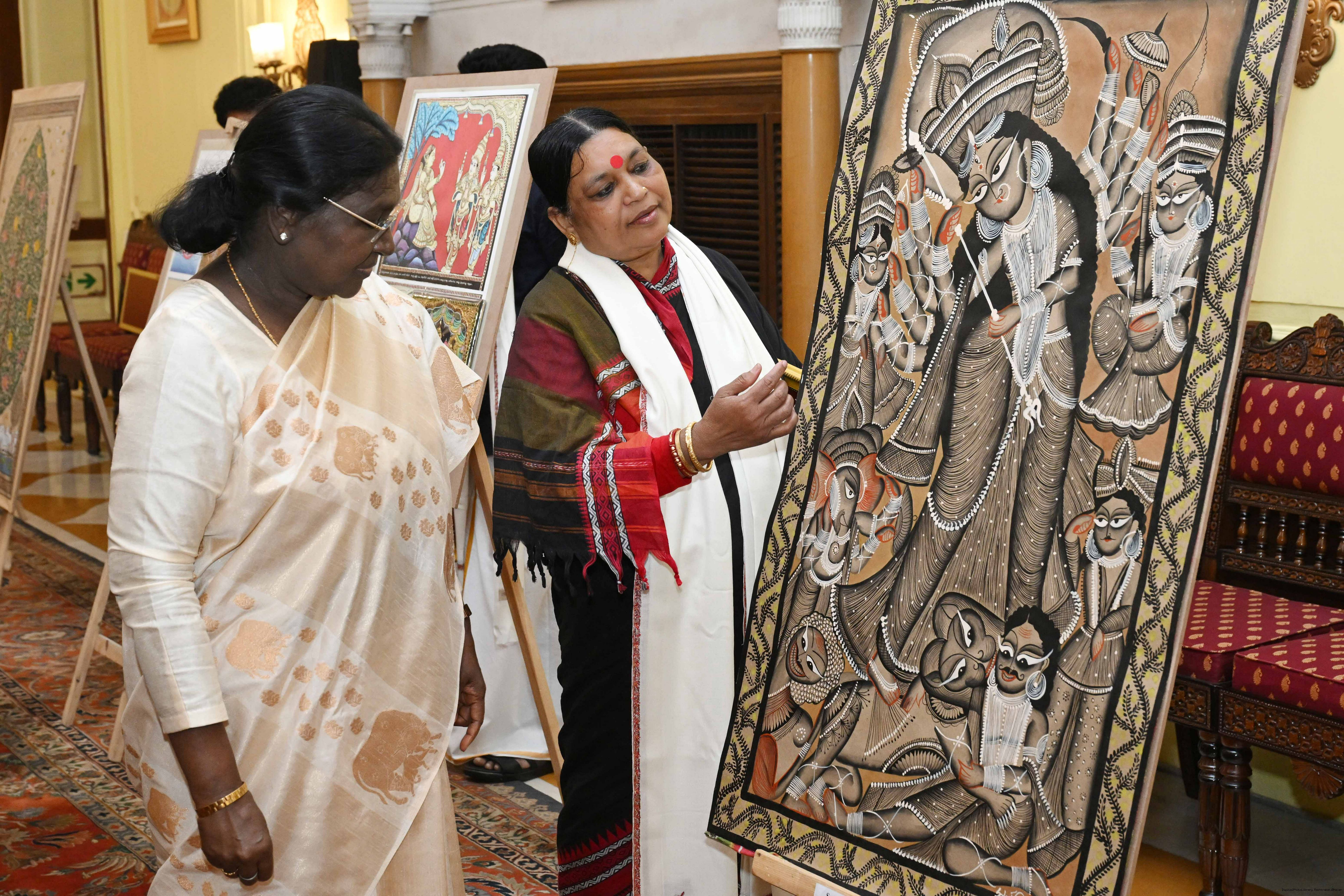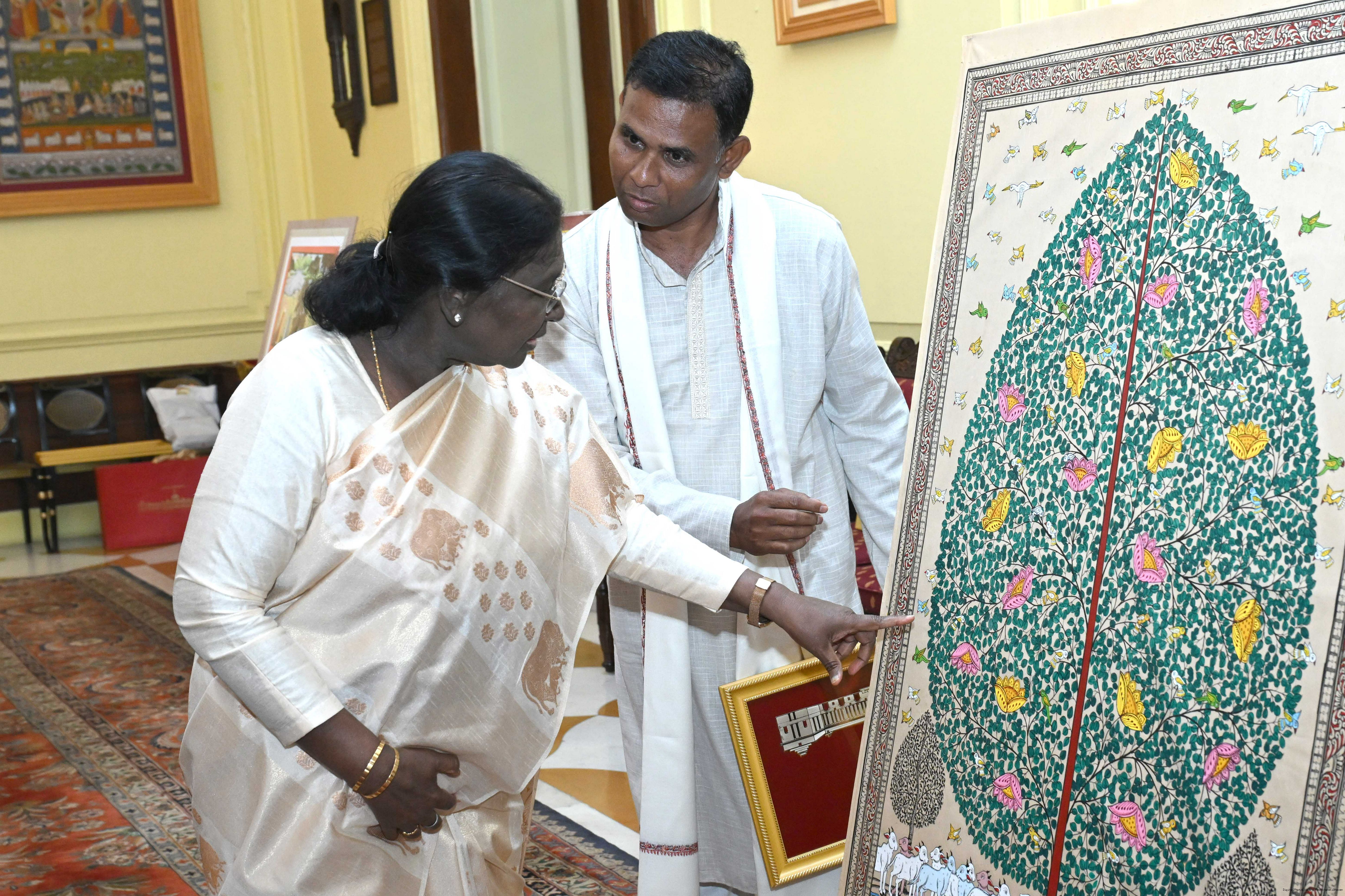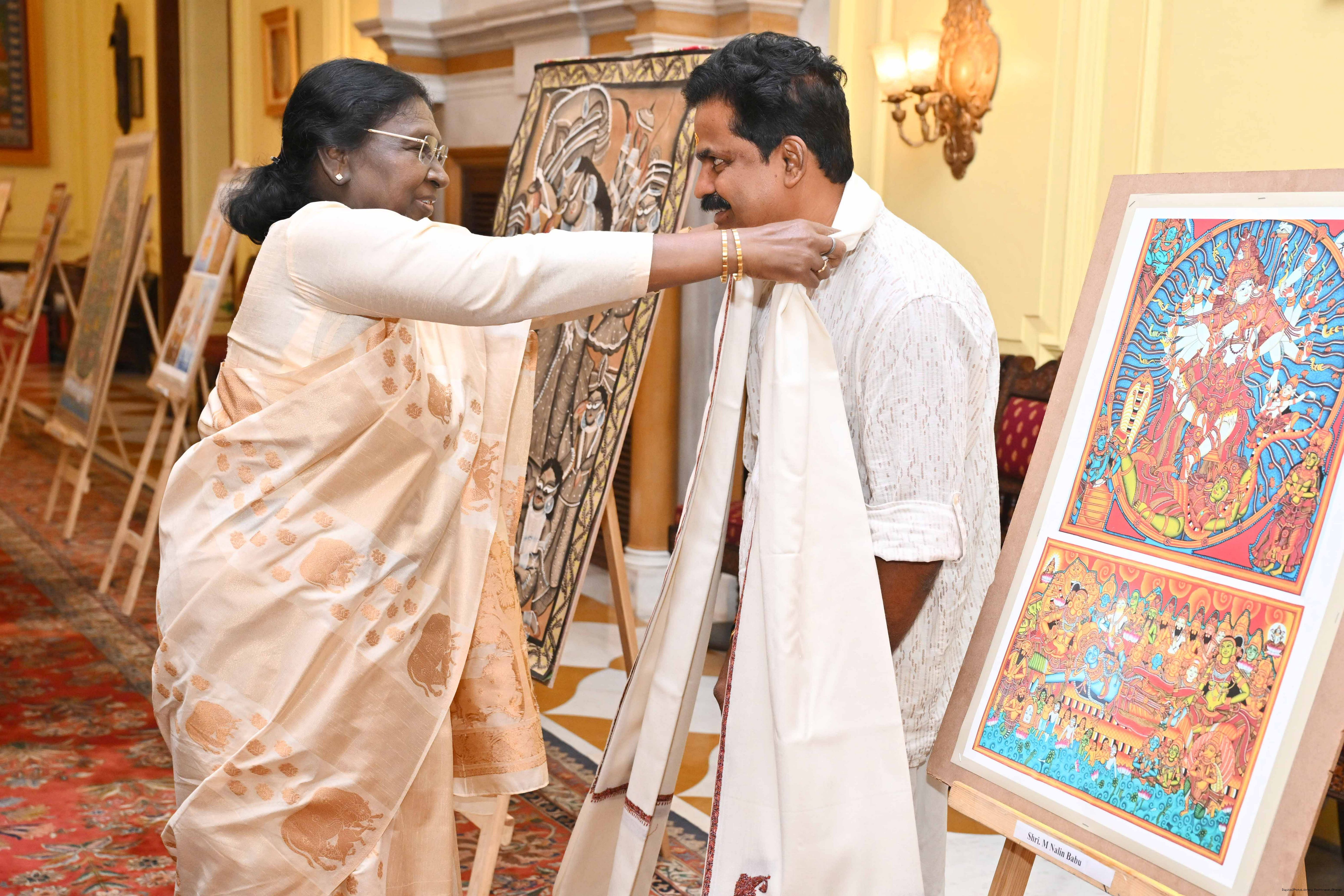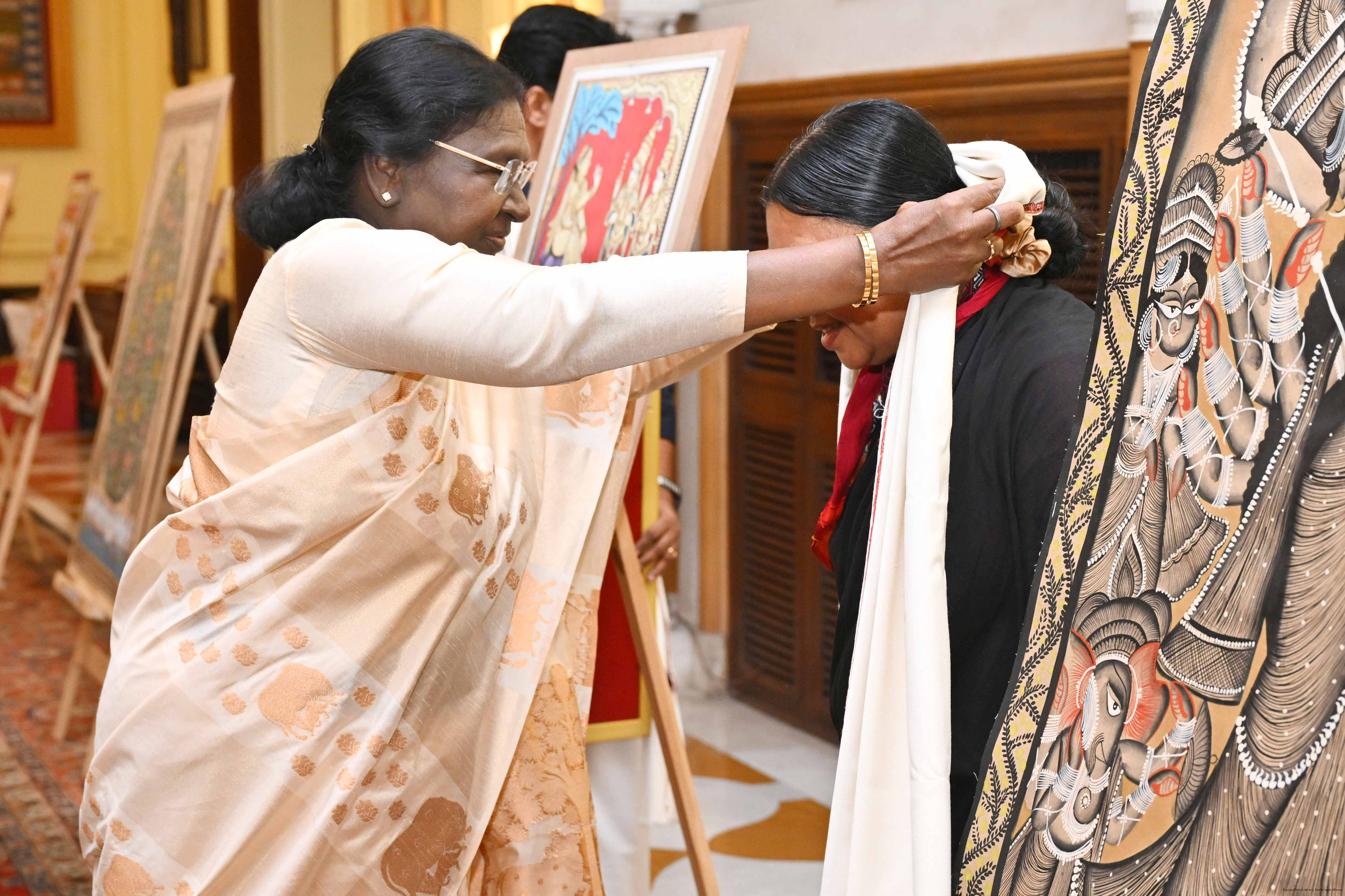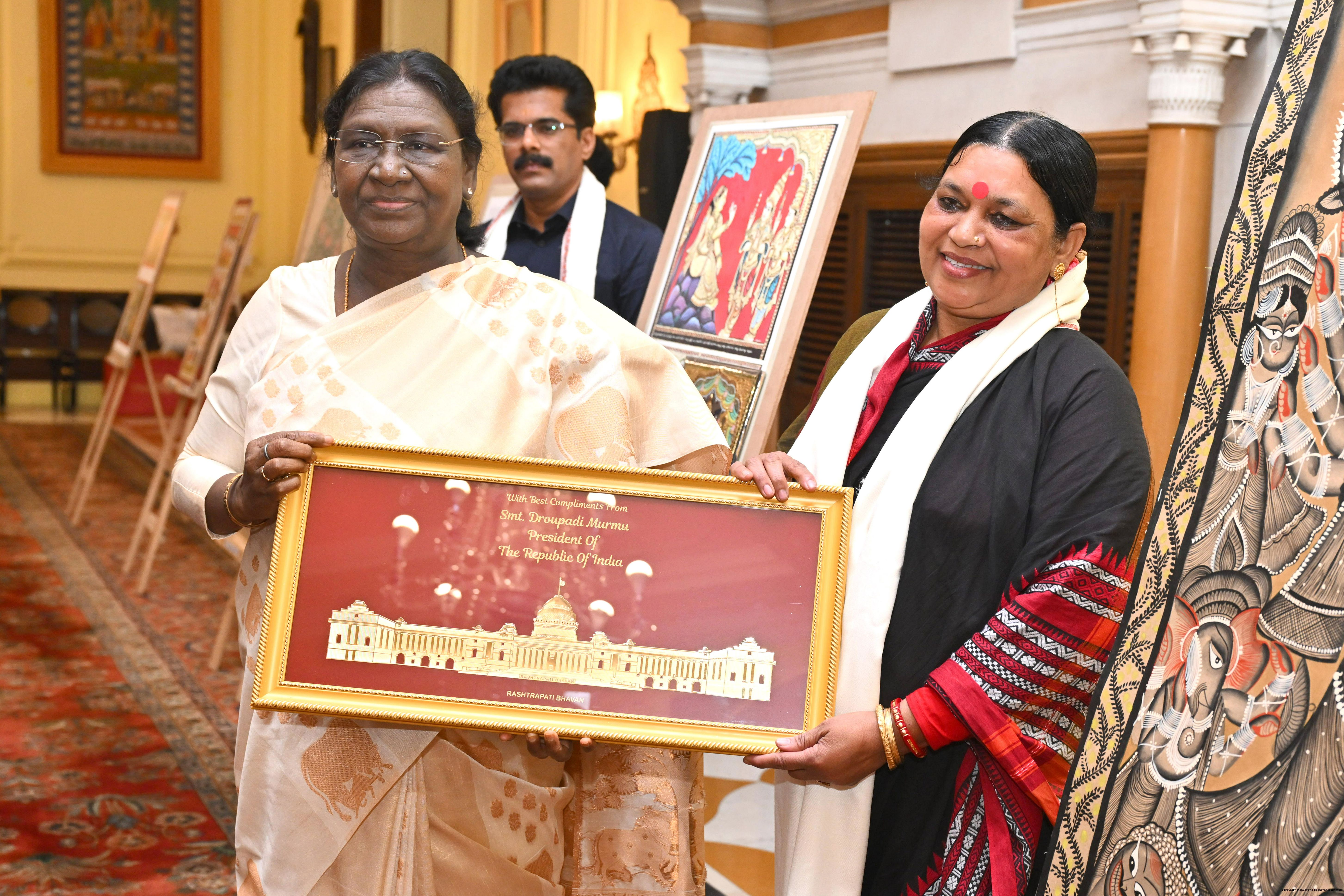 | Caption: | The President of India, Smt Droupadi Murmu met a group of artists of traditional paintings and mural art forms and witnessed their artworks at Rashtrapati Bhavan on March 24, 2026. |