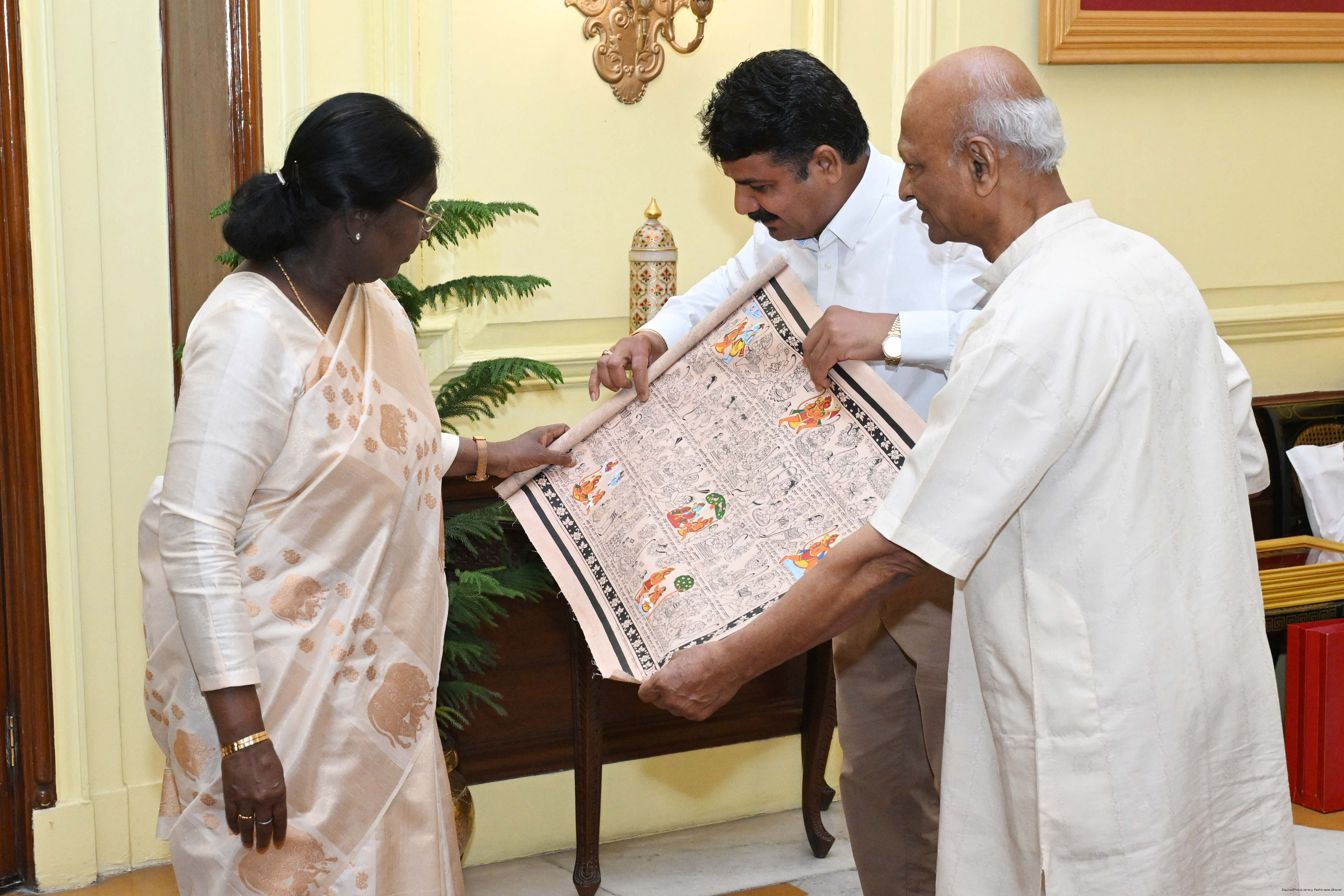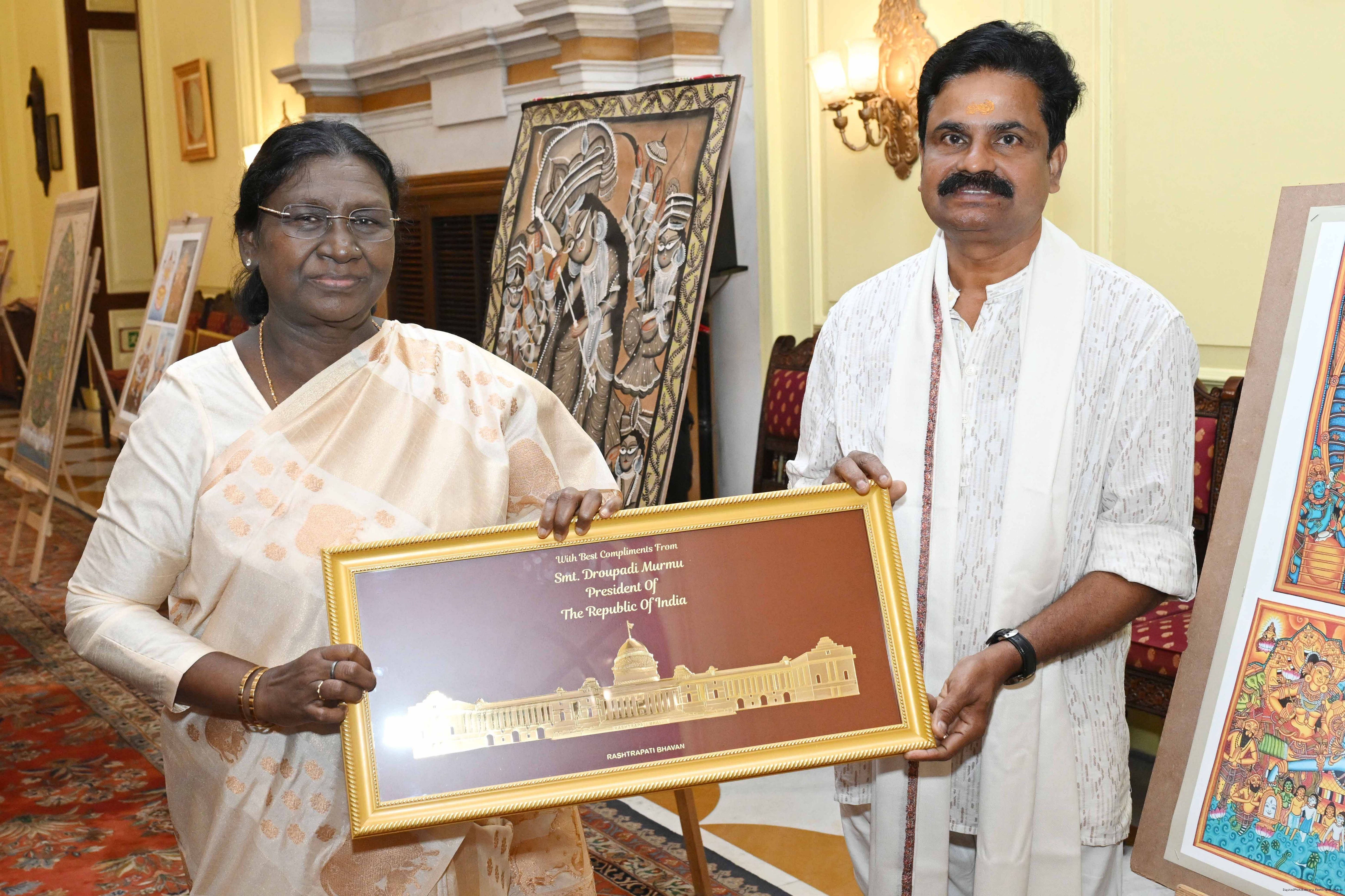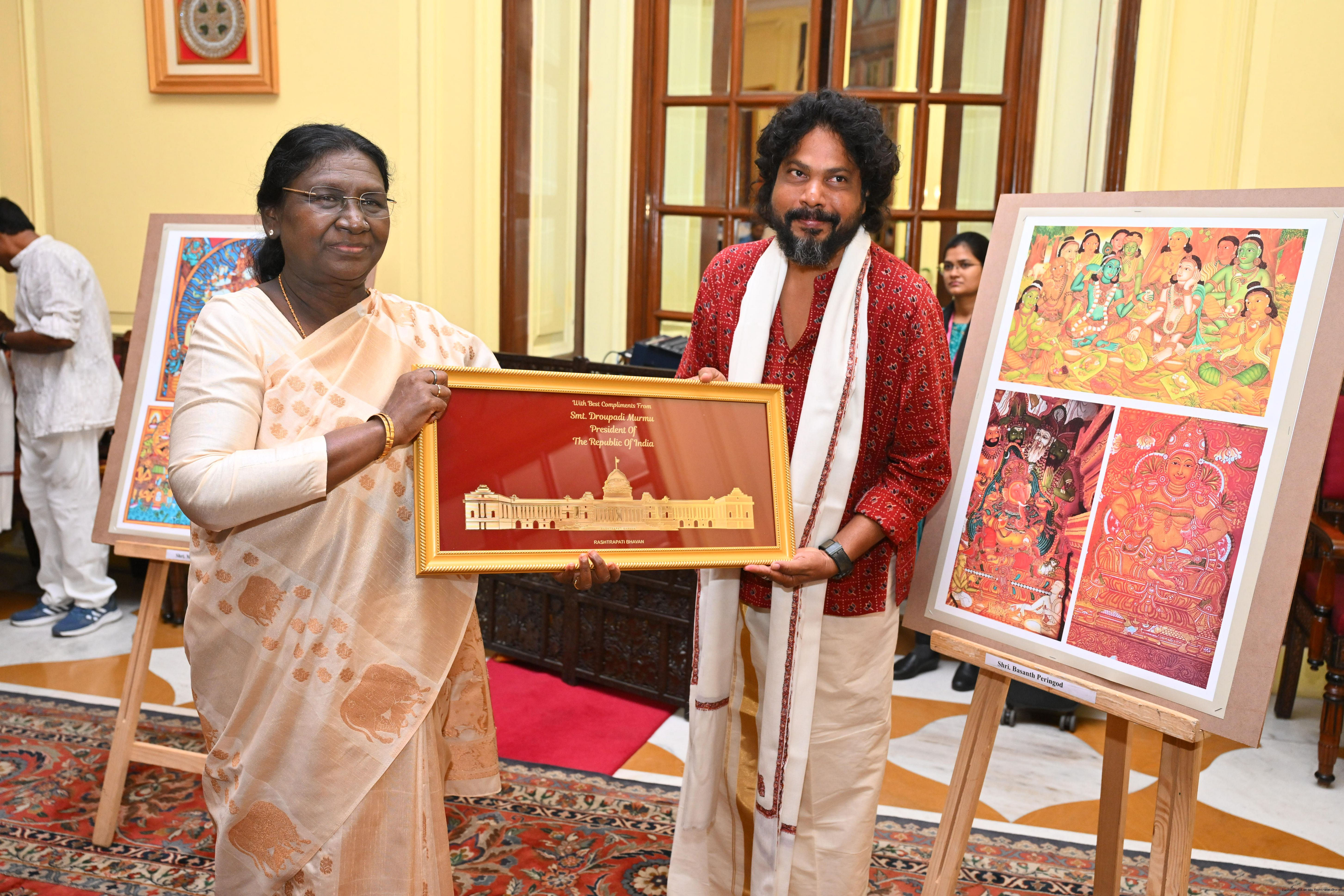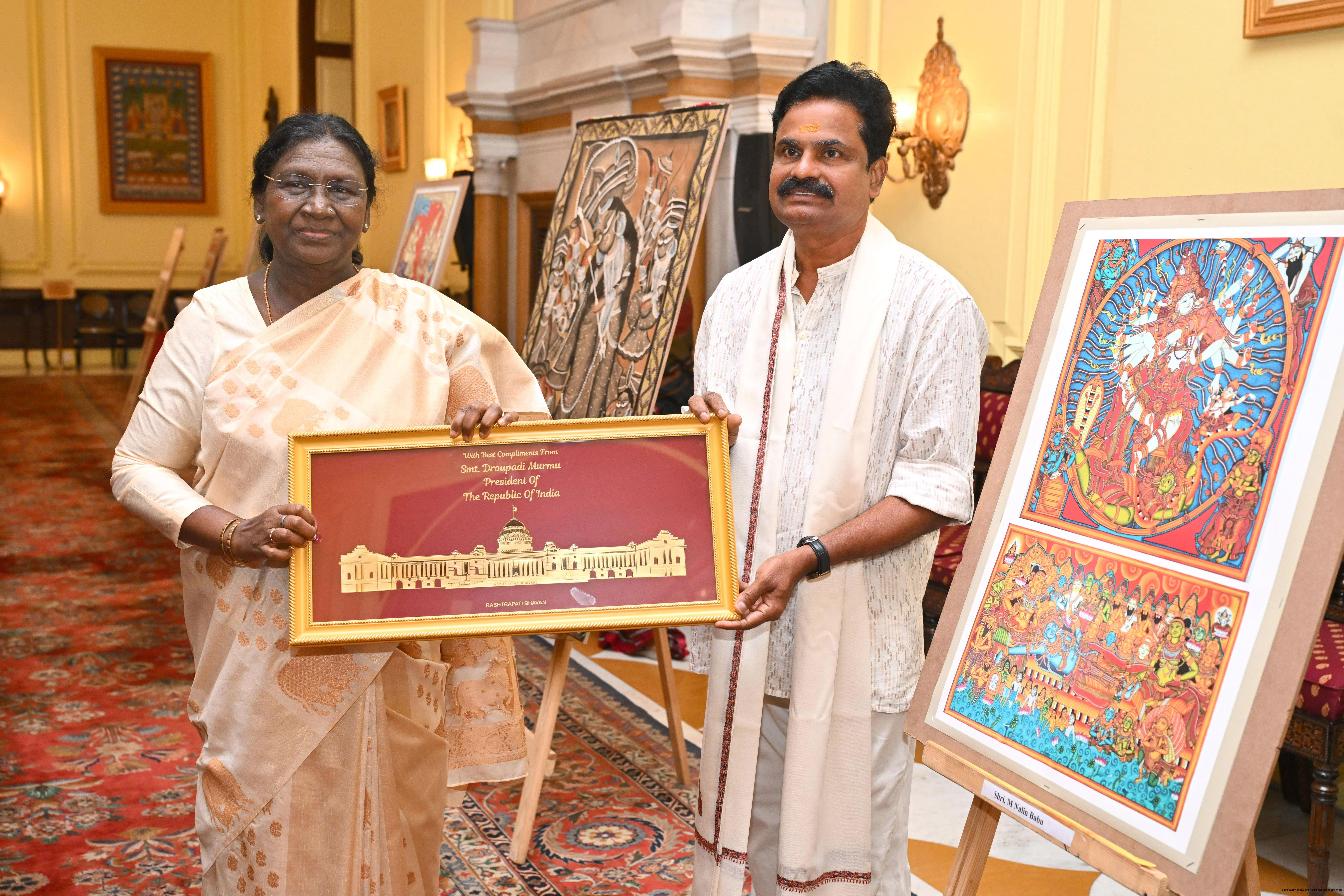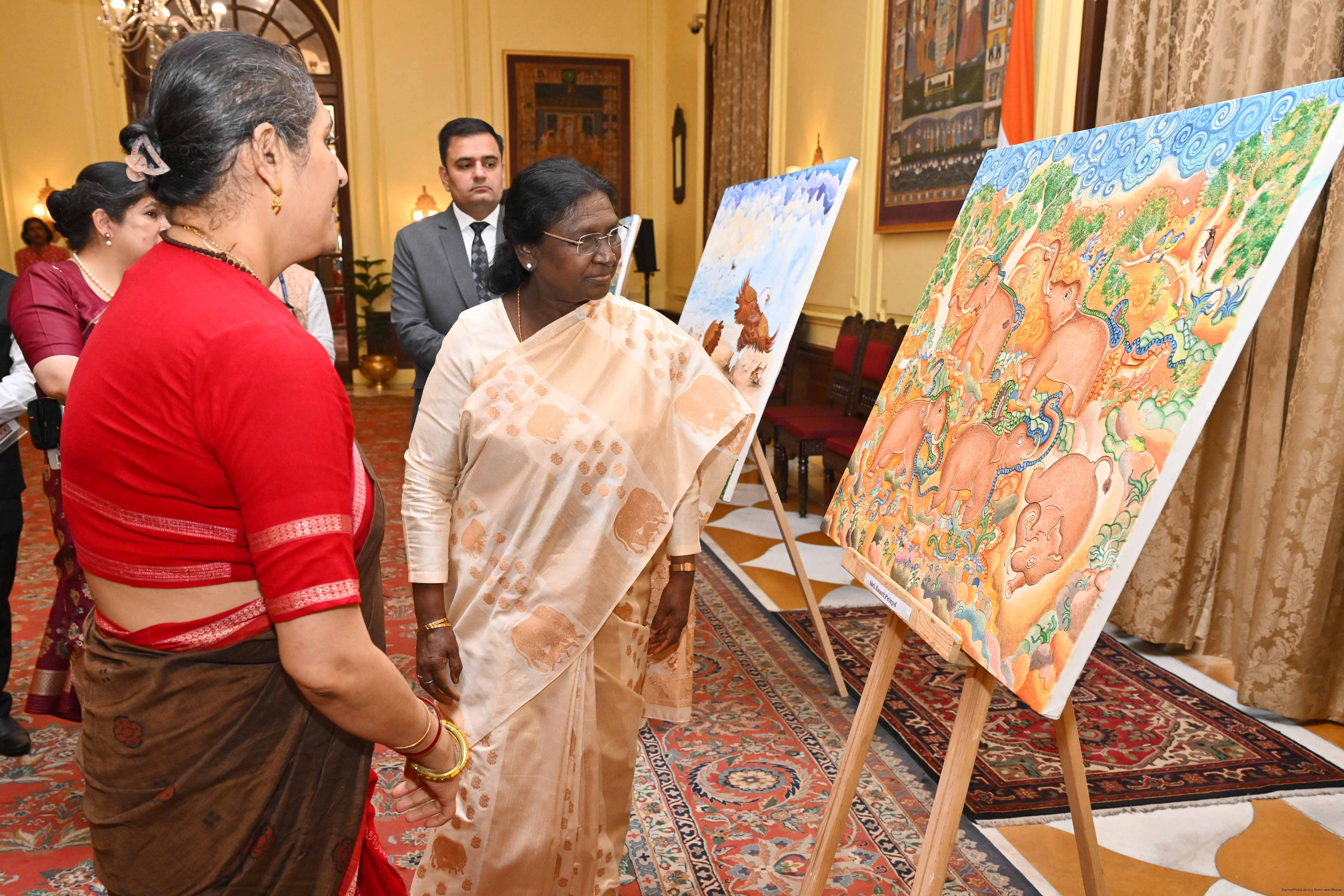 | Caption: | The President of India, Smt Droupadi Murmu met a group of artists of traditional paintings and mural art forms and witnessed their artworks at Rashtrapati Bhavan on March 24, 2026. |