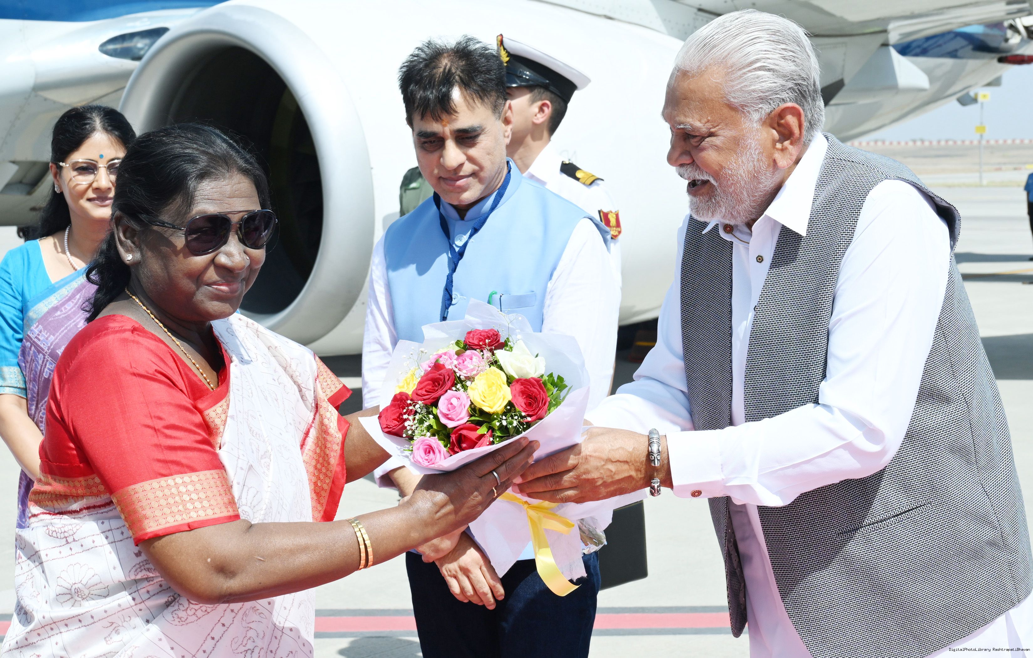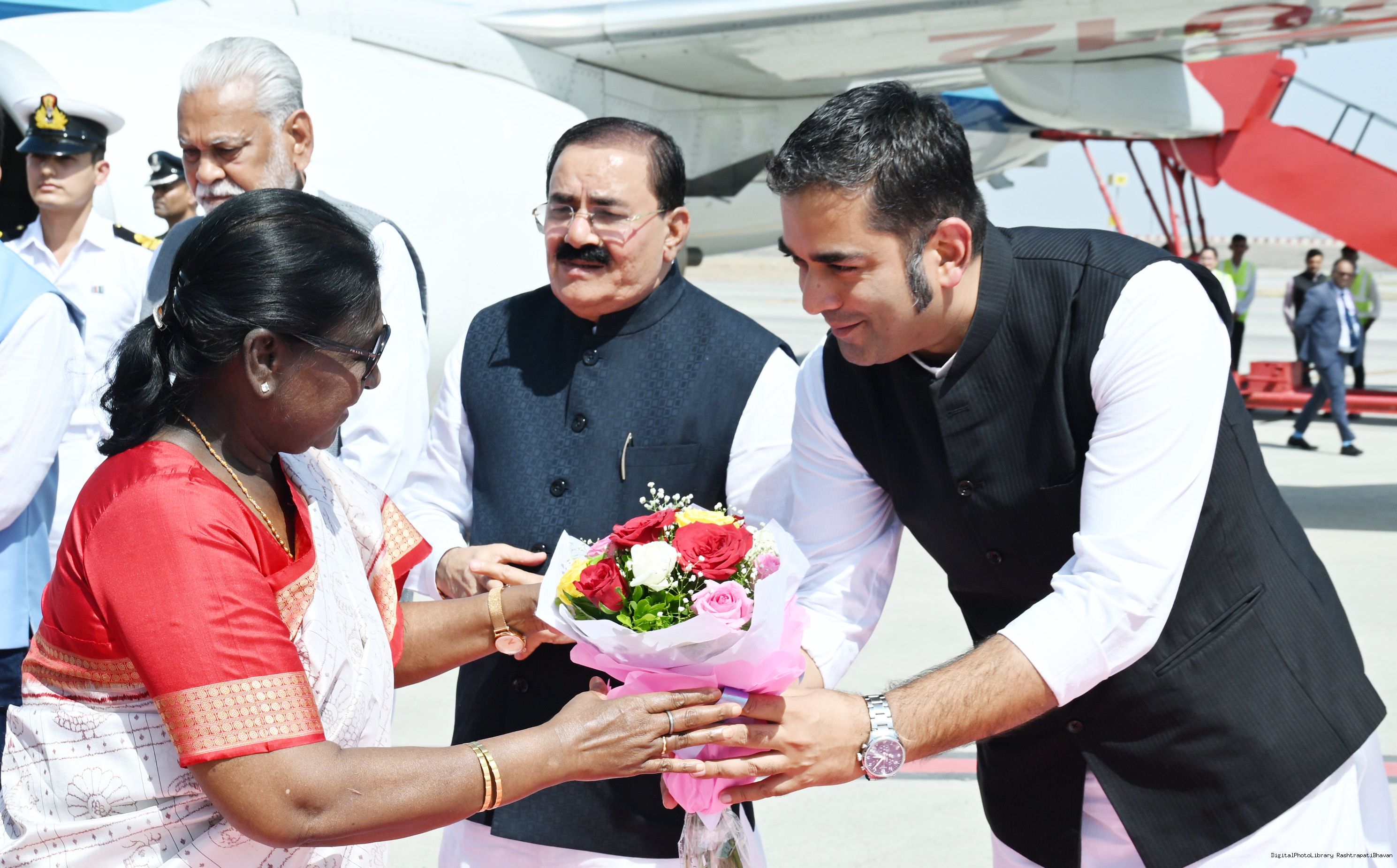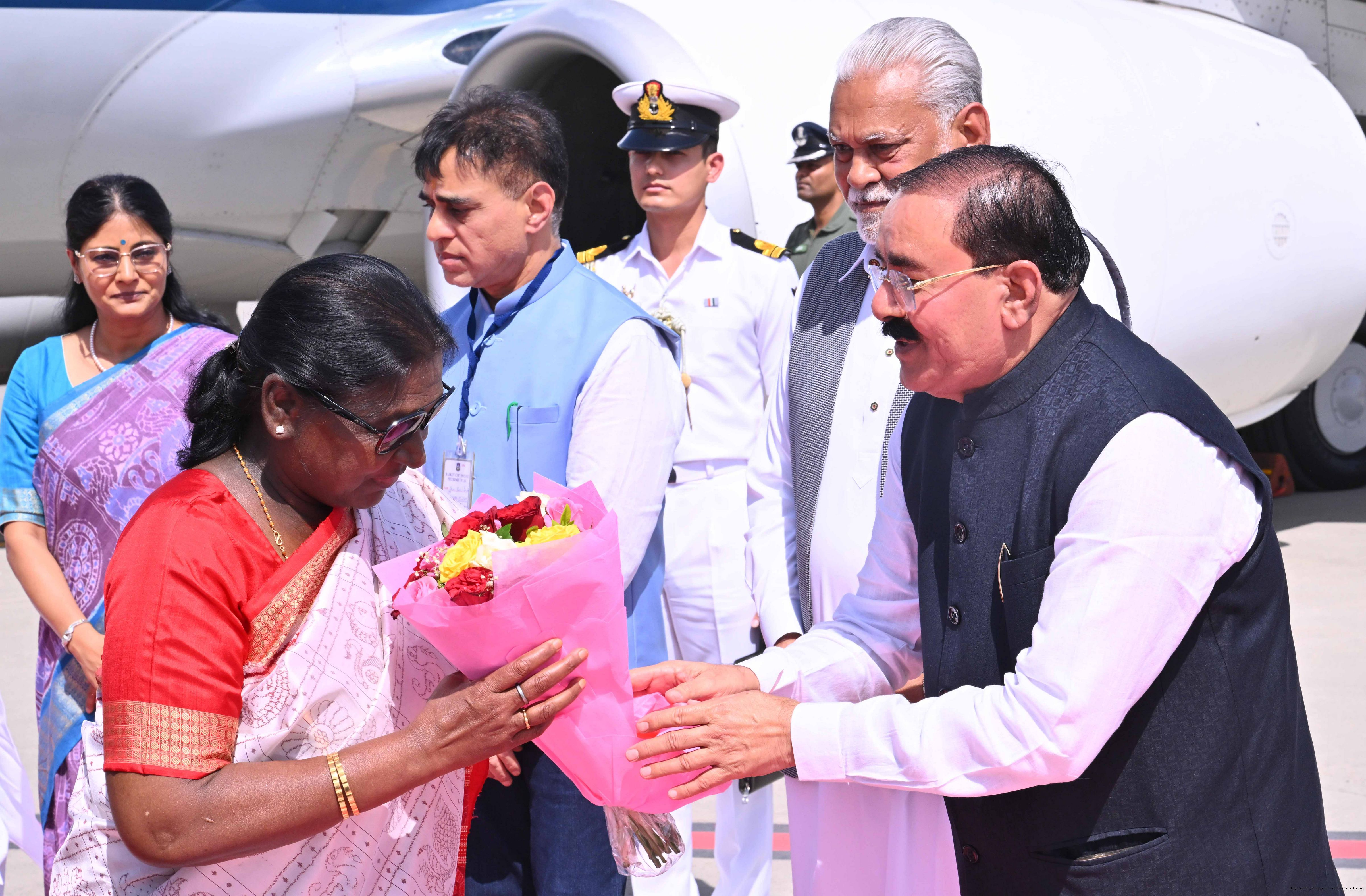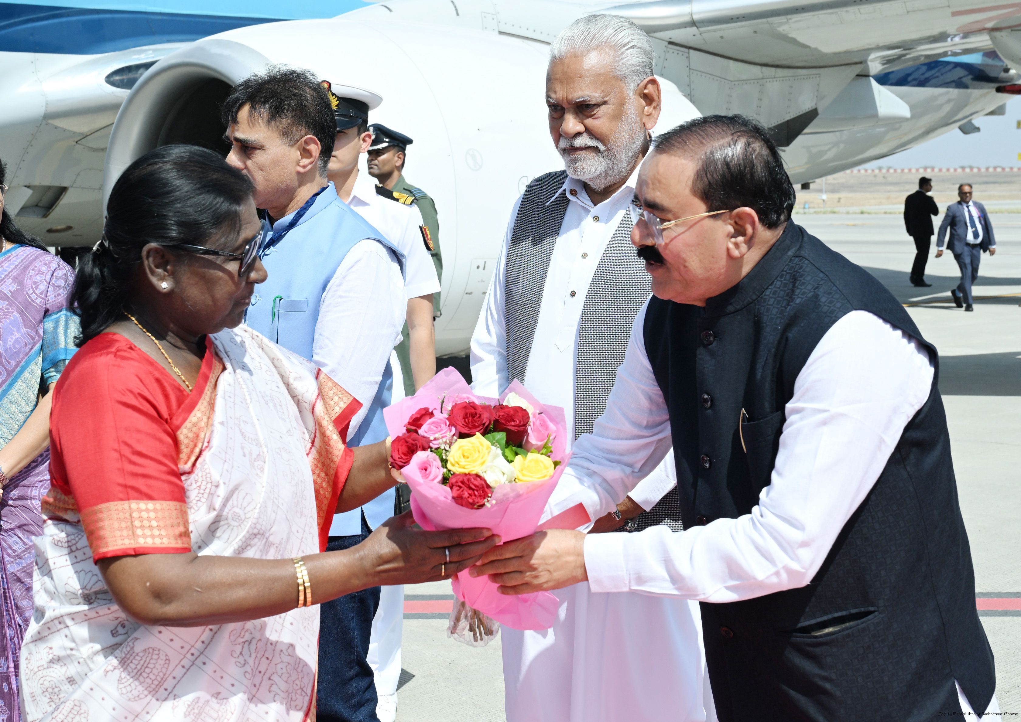 | Caption: | The Governor of Gujarat, Shri Acharya Devvrat, and Union Minister of State for Health Family Welfare, and Chemicals Fertilizers Smt Anupriya Patel received the President of India Smt Droupadi Murmu on her arrival at Rajkot, Gujarat on April 13, 2026. |