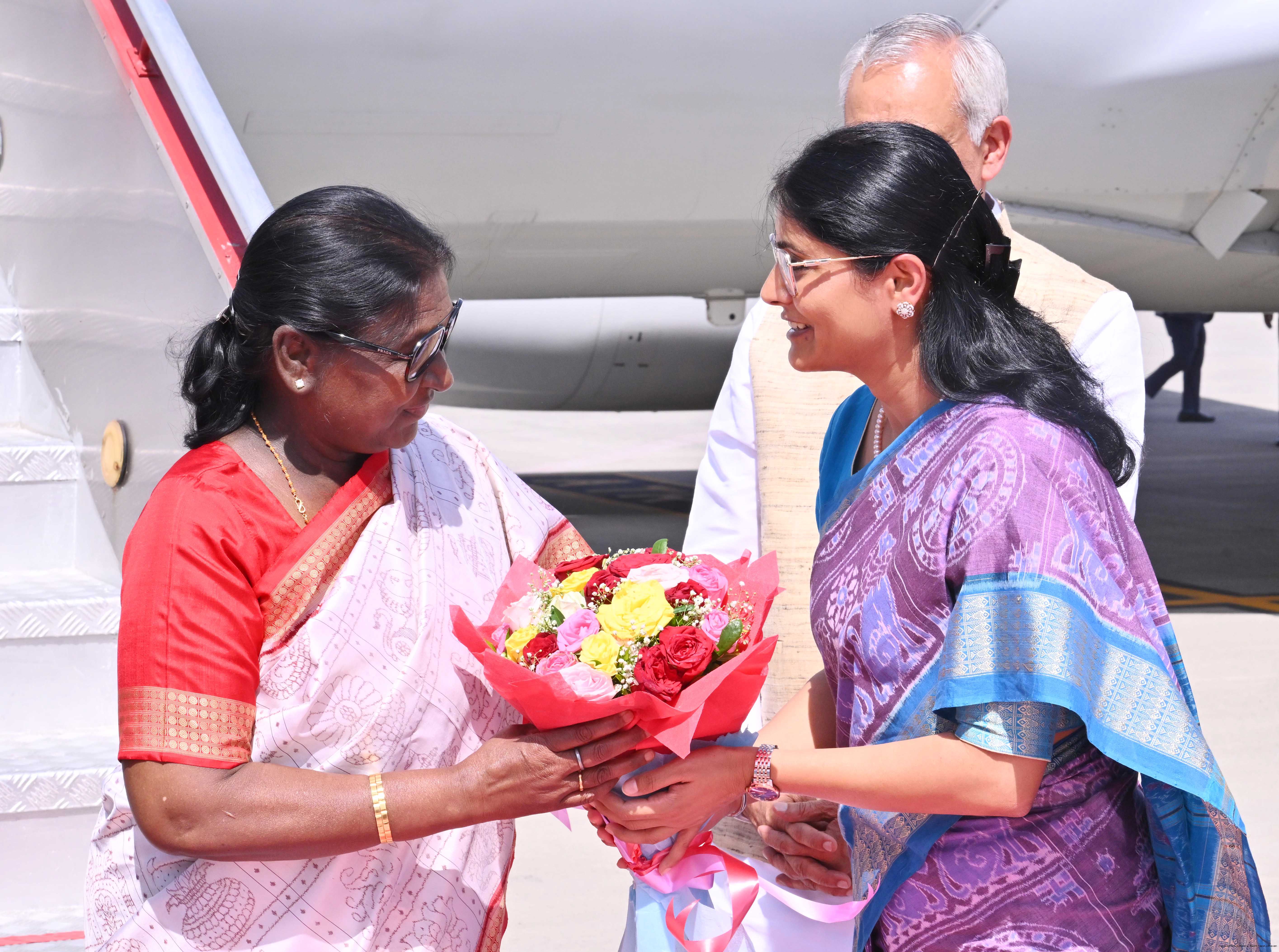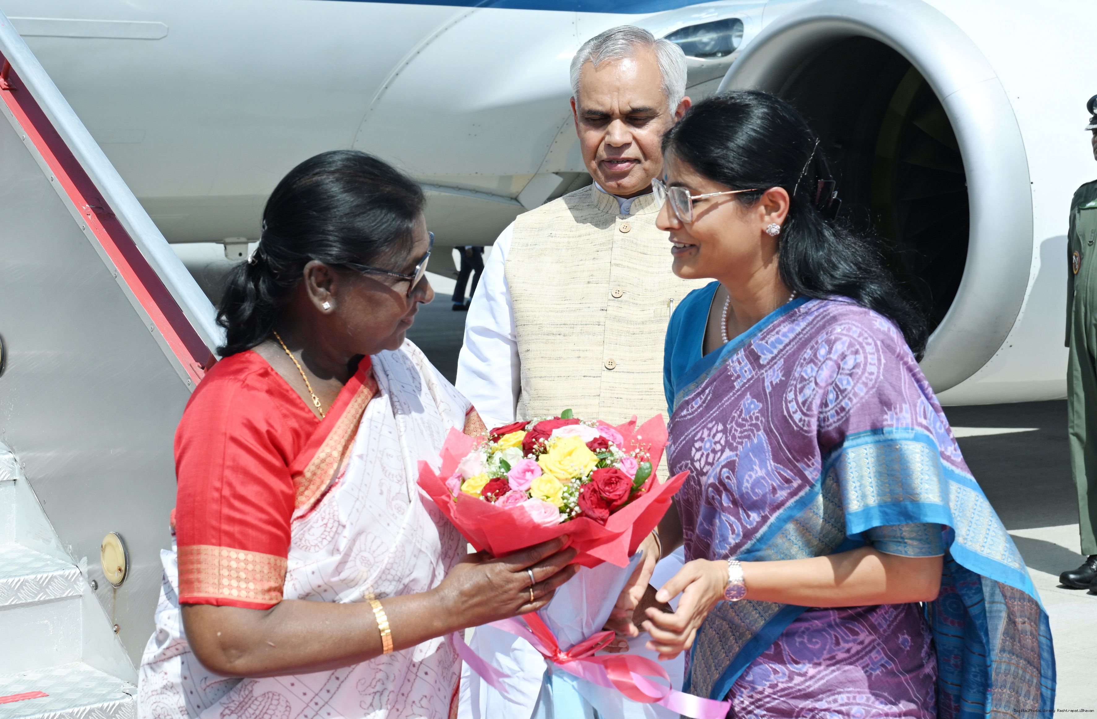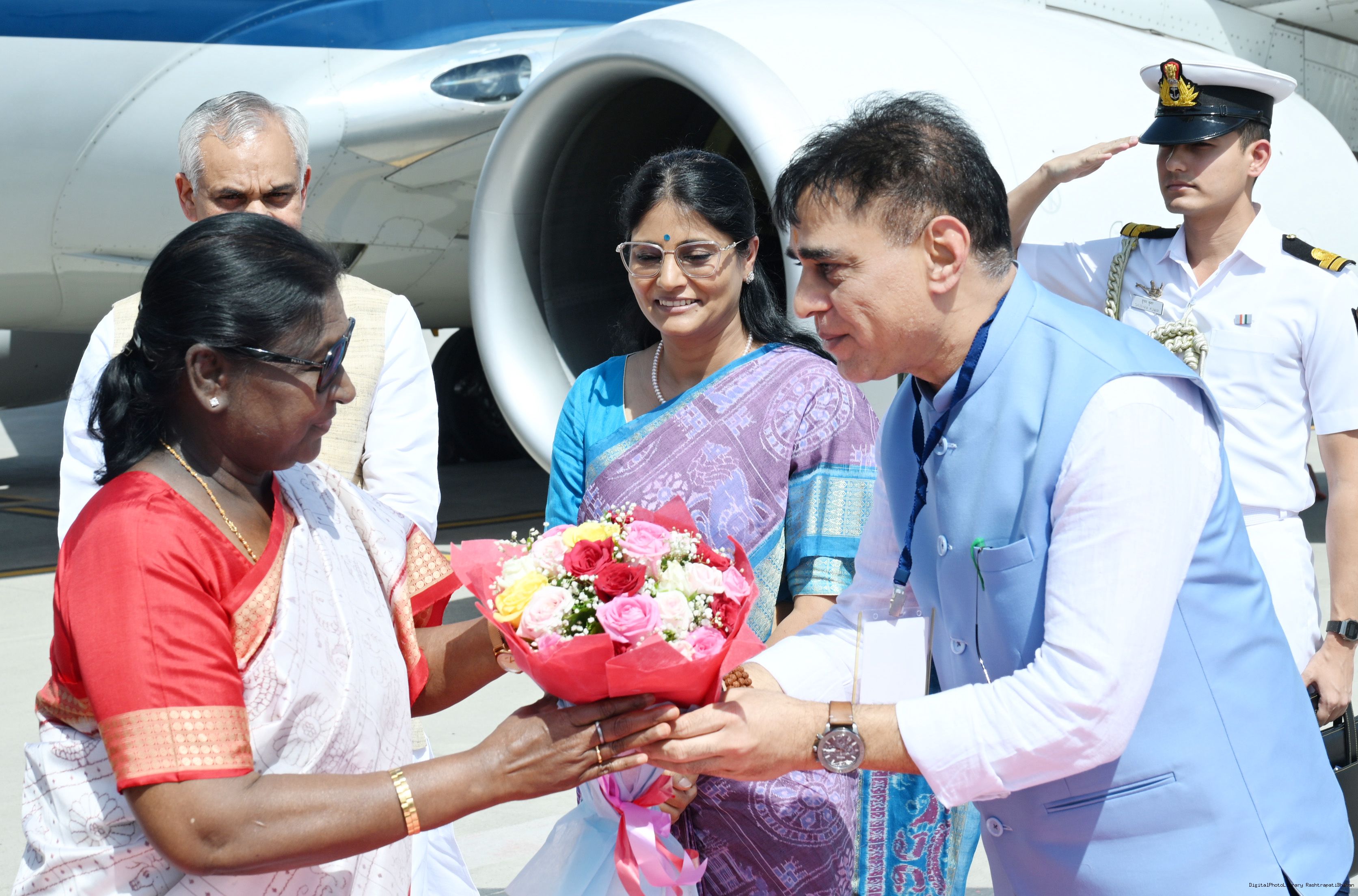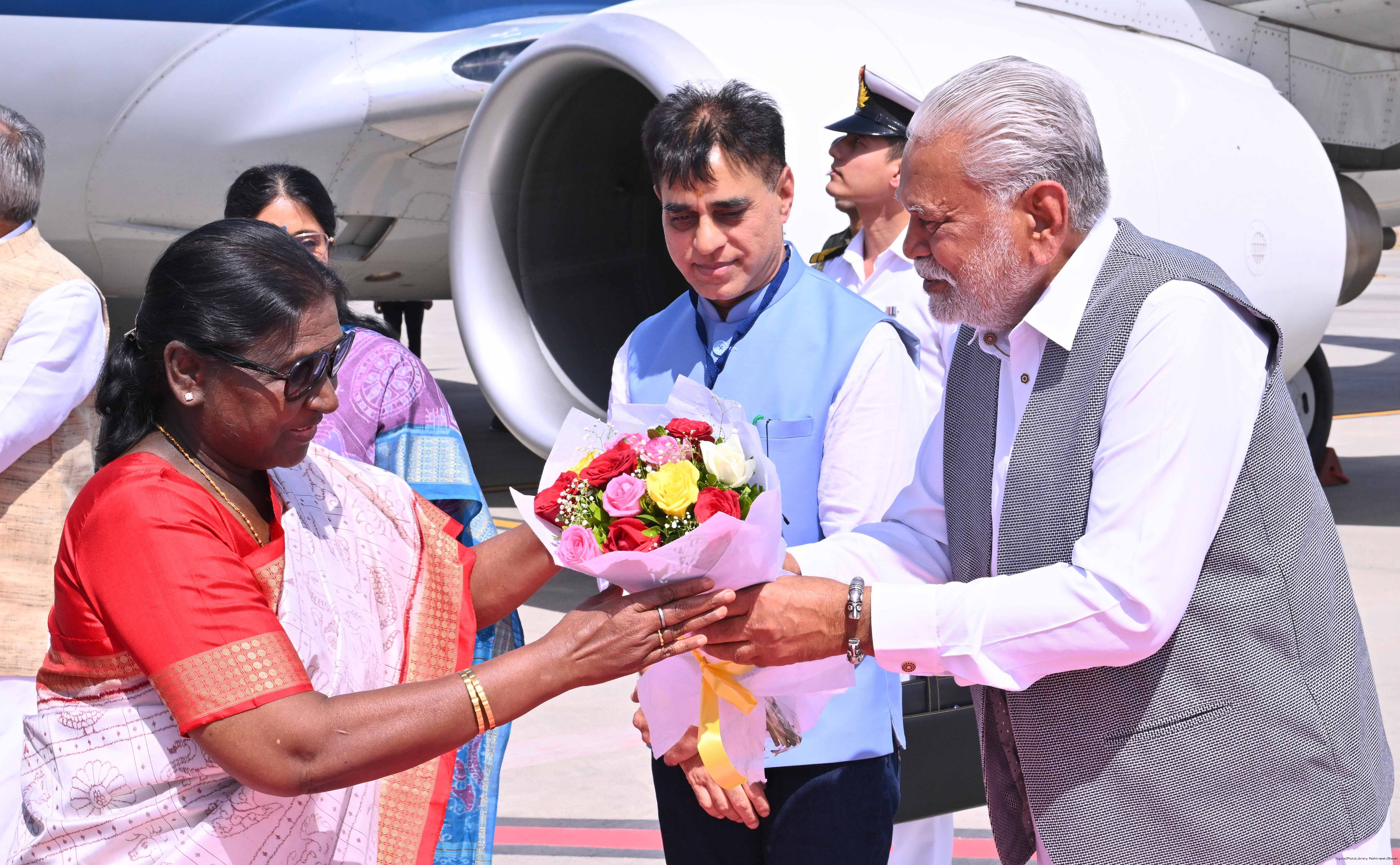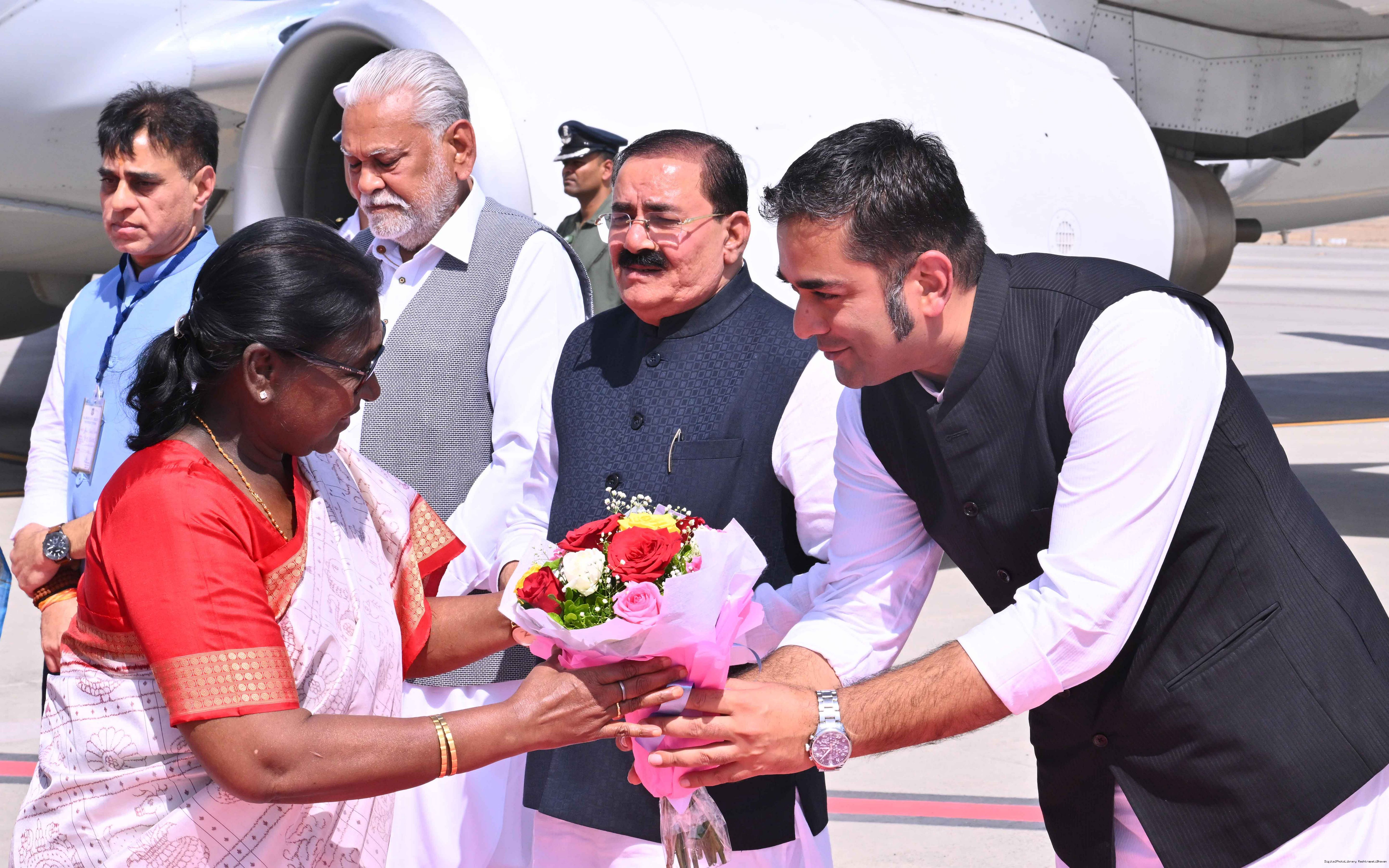 | Caption: | The Governor of Gujarat, Shri Acharya Devvrat, and Union Minister of State for Health Family Welfare, and Chemicals Fertilizers Smt Anupriya Patel received the President of India Smt Droupadi Murmu on her arrival at Rajkot, Gujarat on April 13, 2026. |