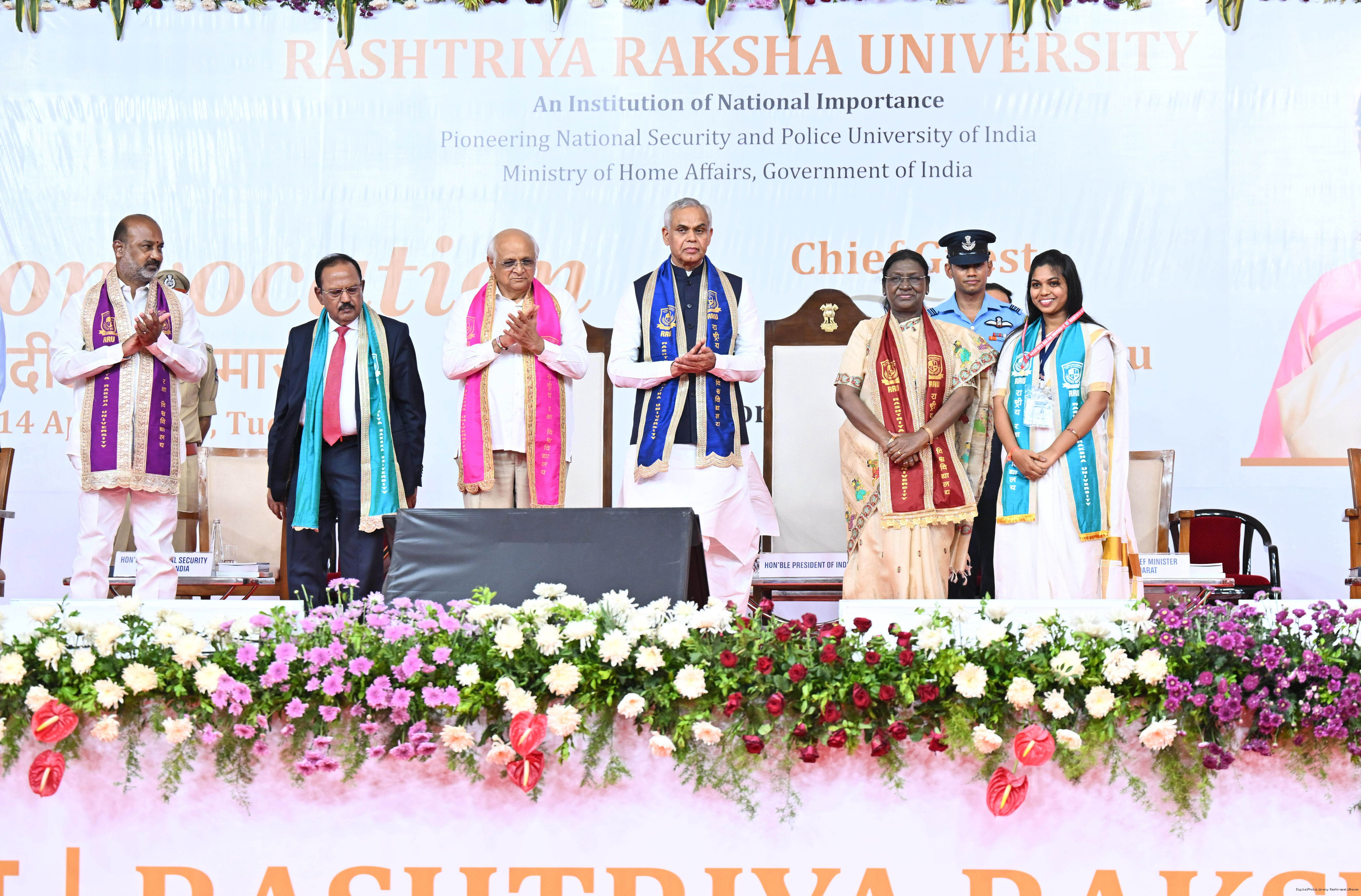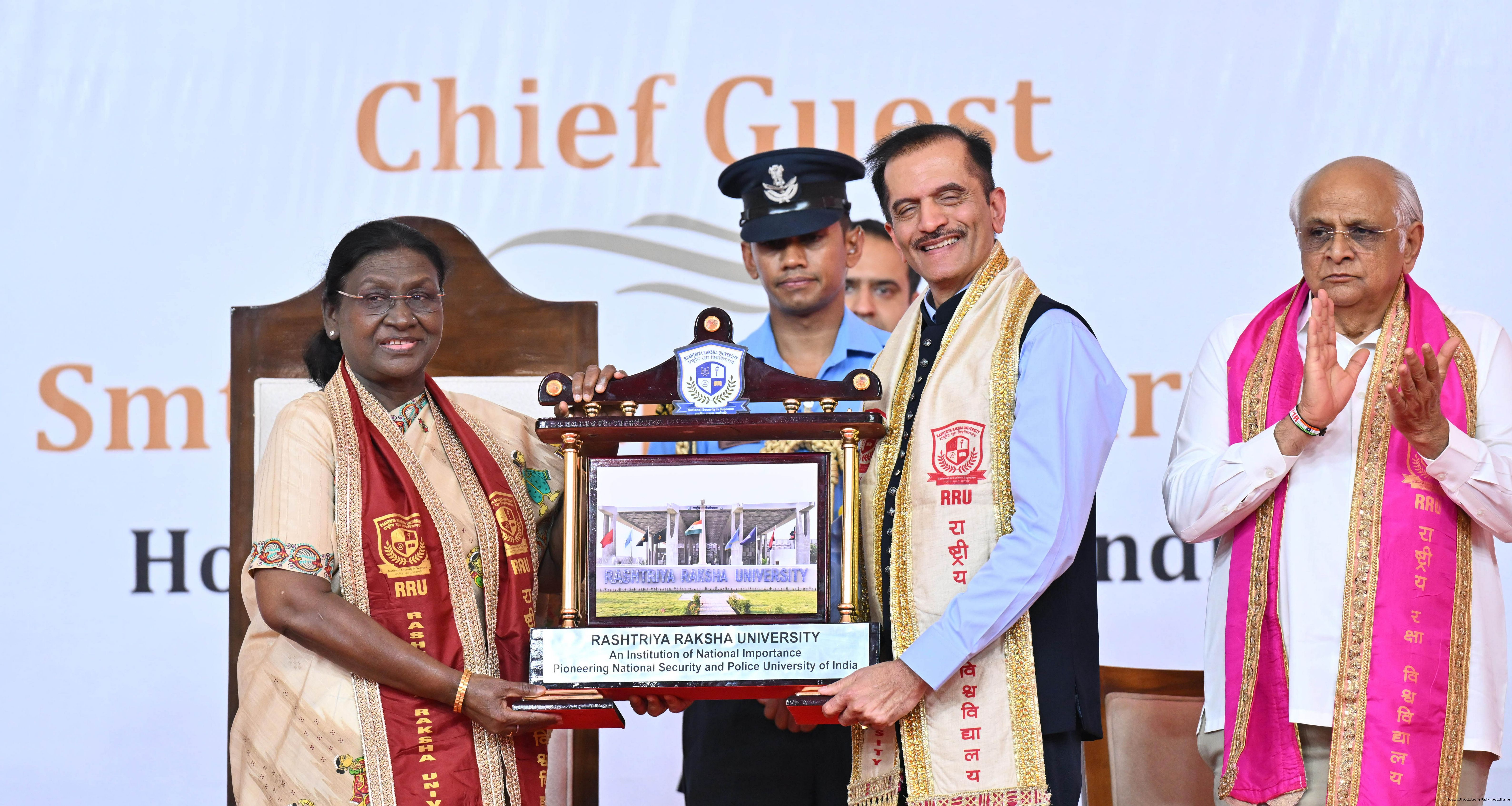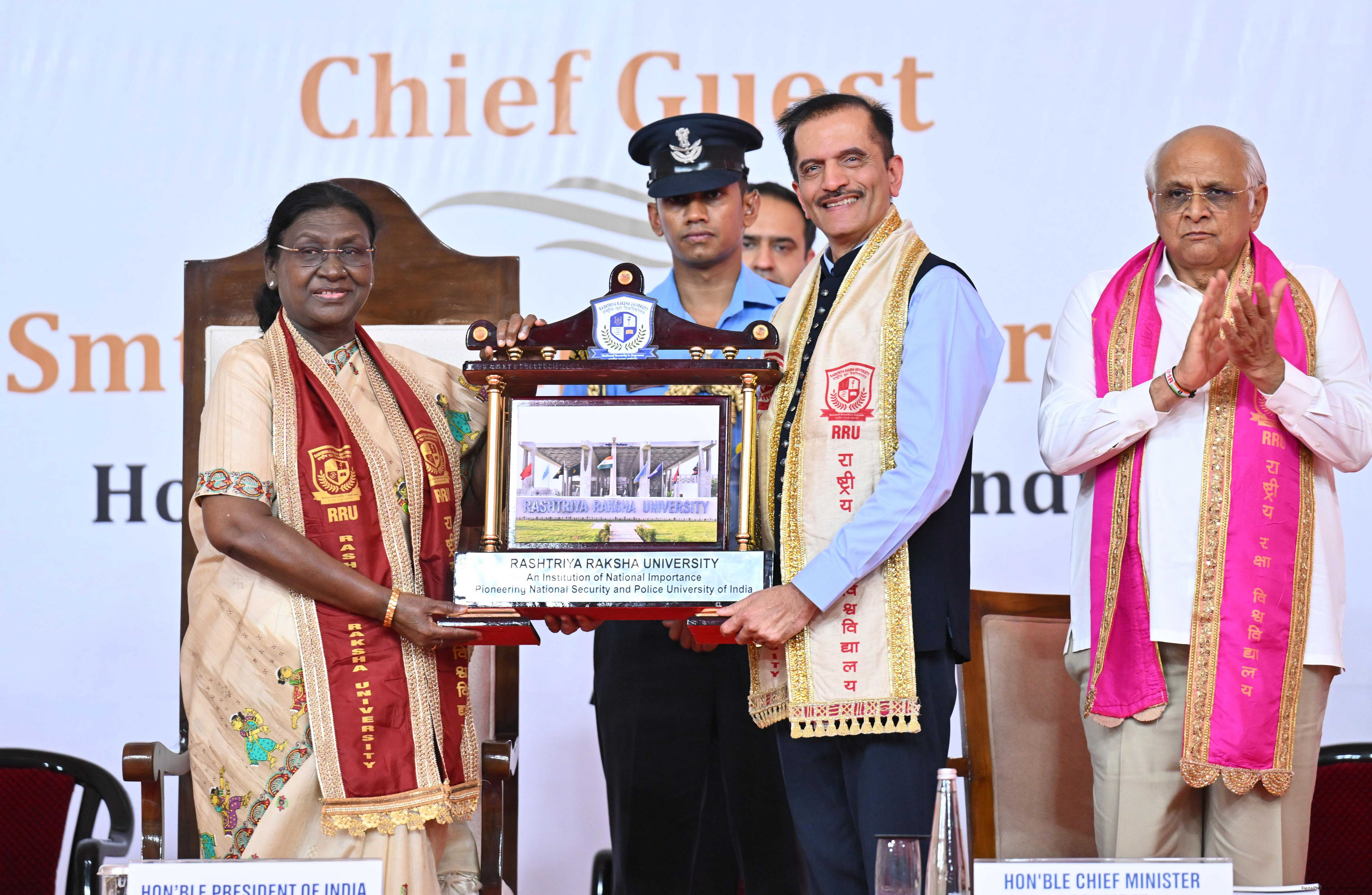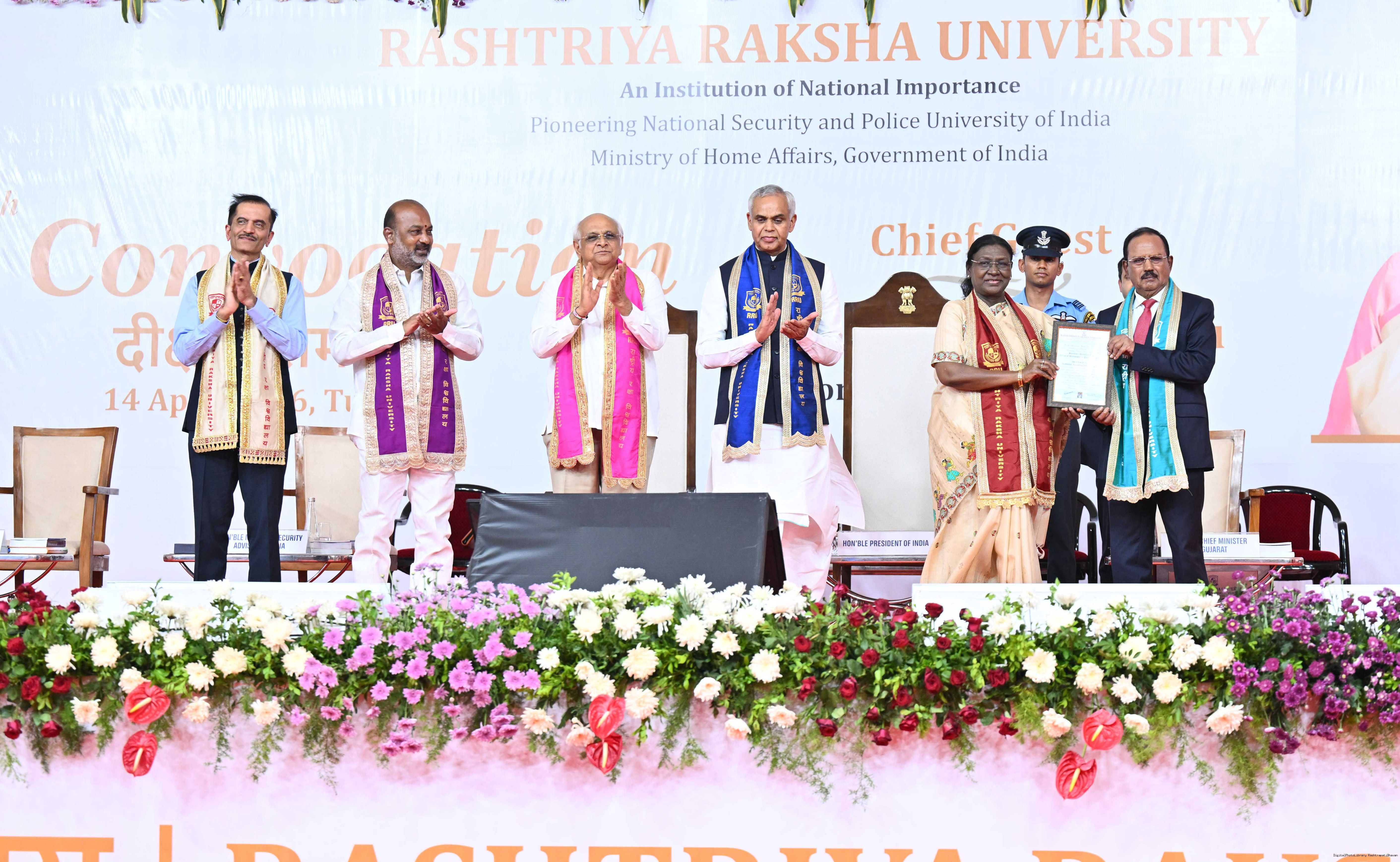Caption: The President of India, Smt Droupadi Murmu graced and addressed the convocation ceremony of Rashtriya Raksha University at Gandhinagar, Gujarat on April 14, 2026.