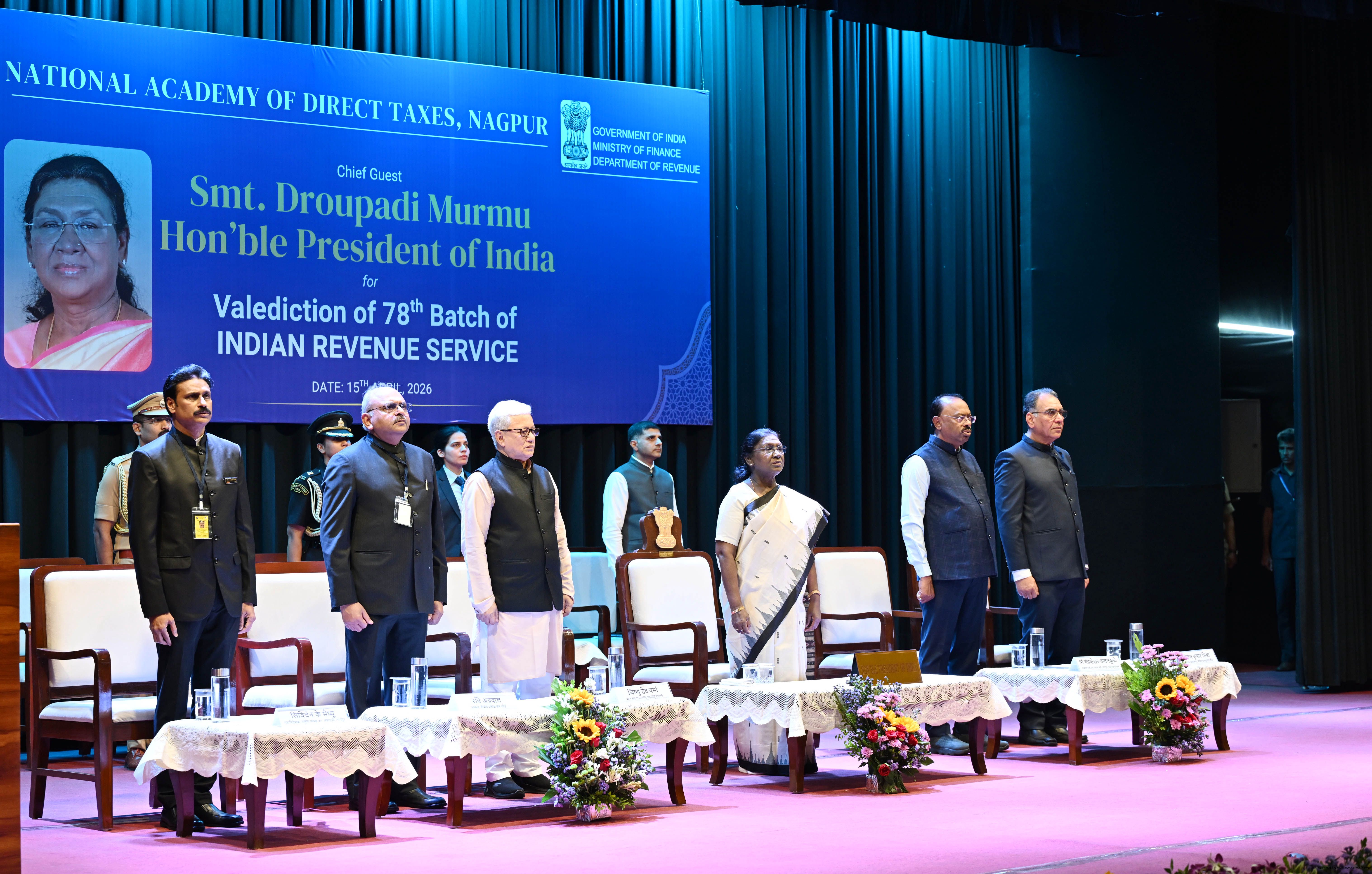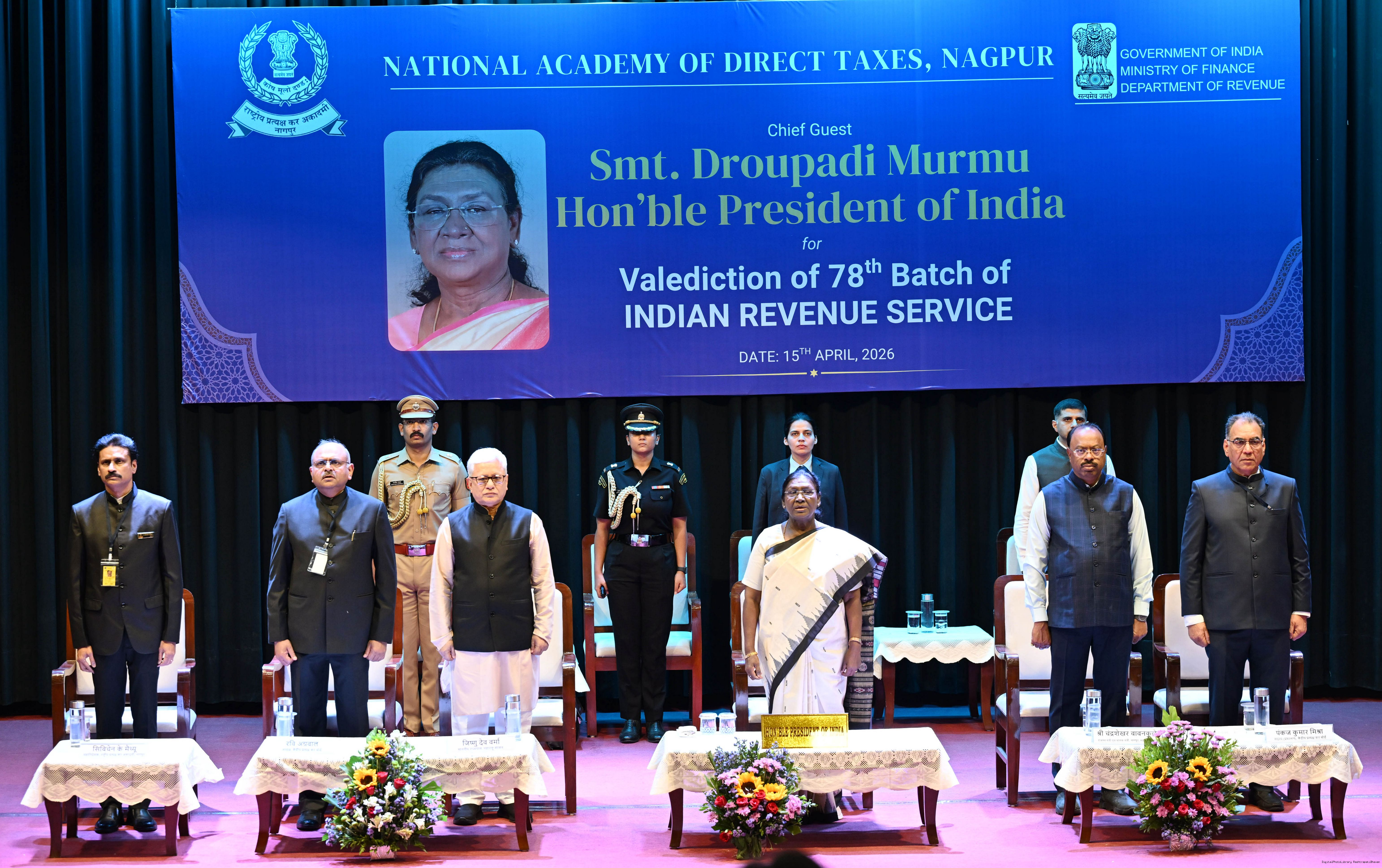 | Caption: | The President of India, Smt Droupadi Murmu graced the valediction ceremony of the 78th batch of Indian Revenue Service (Income Tax) Officer Trainees at the National Academy of Direct Taxes, Nagpur, Maharashtra on April 15, 2026. |