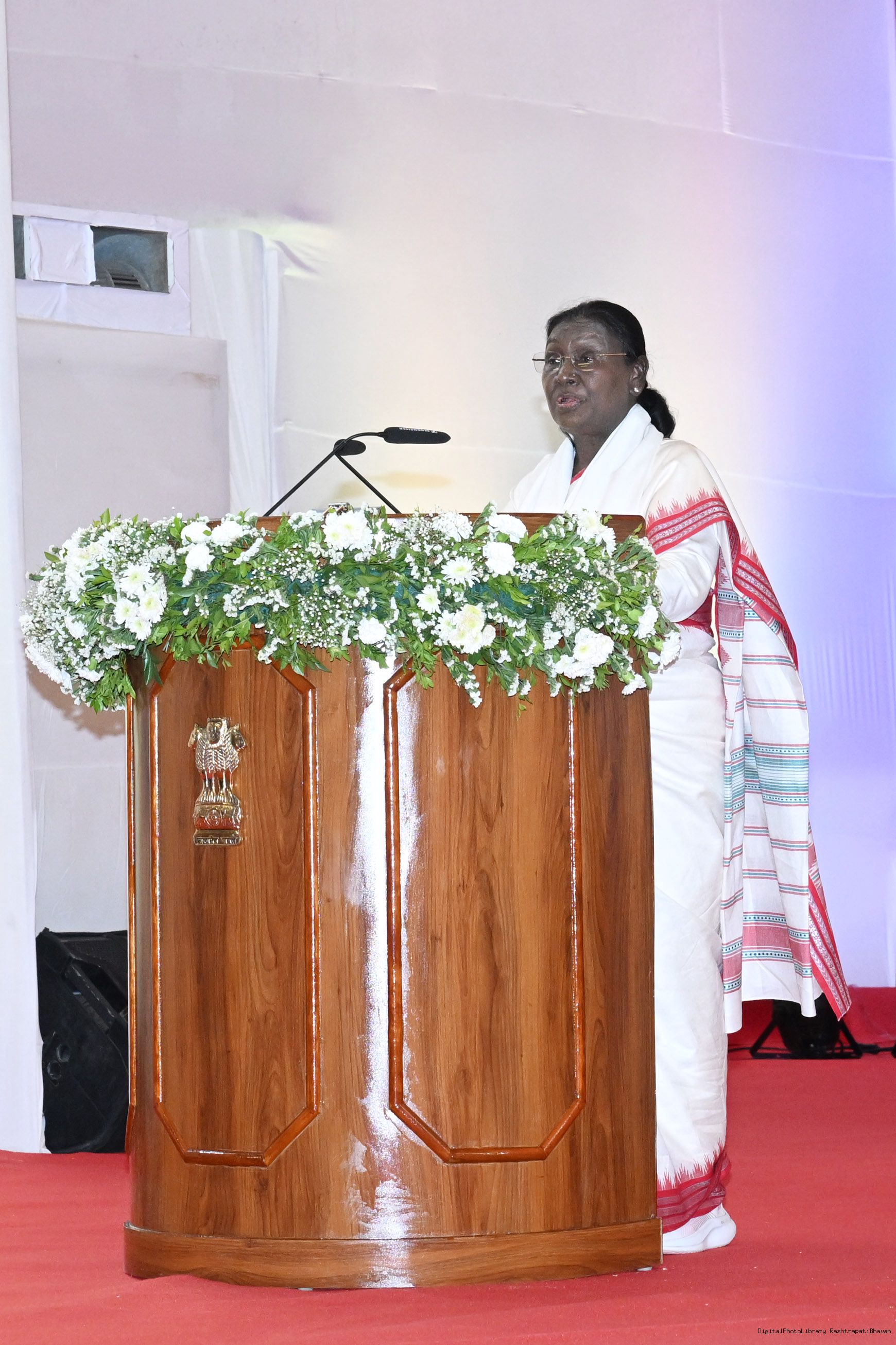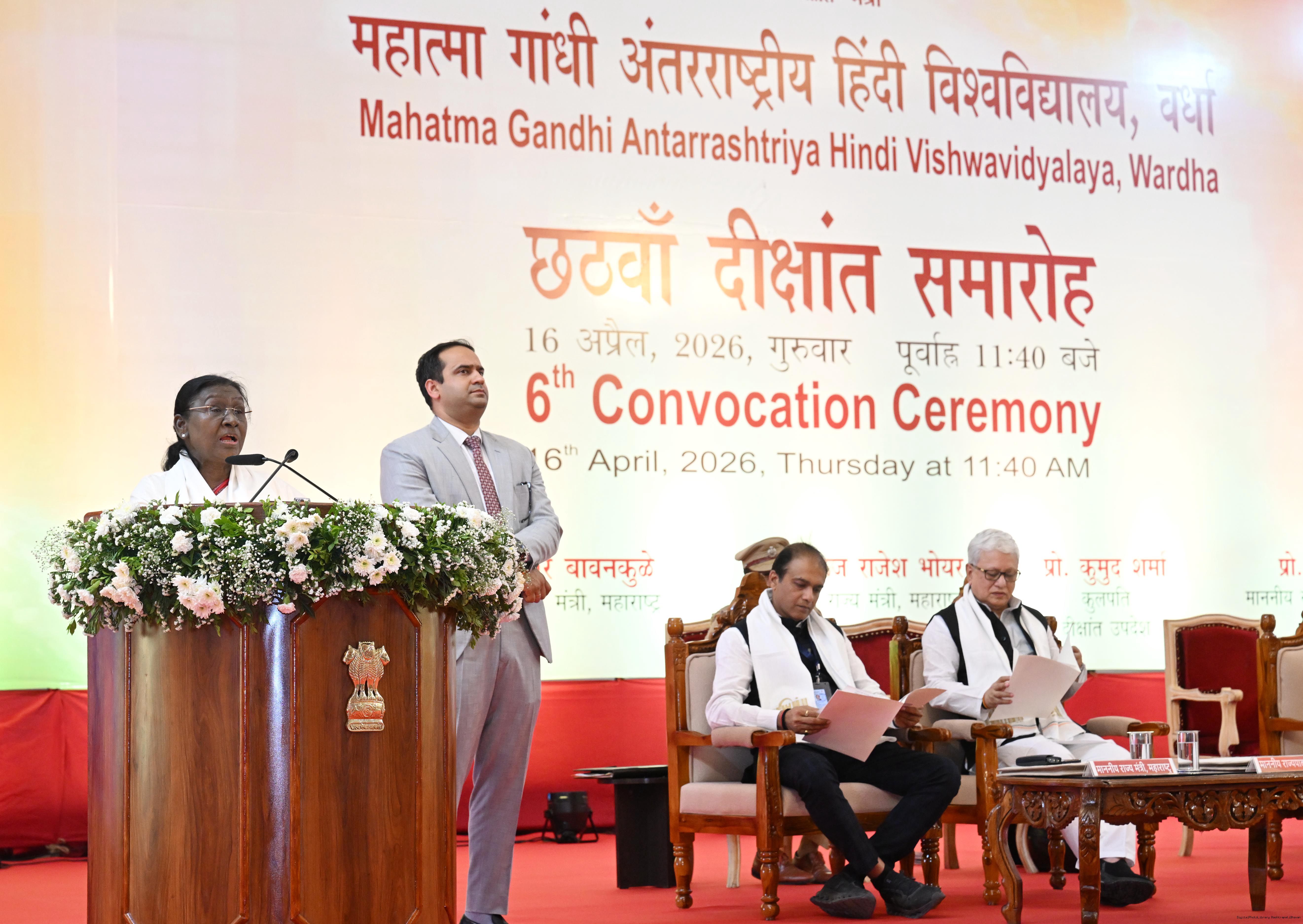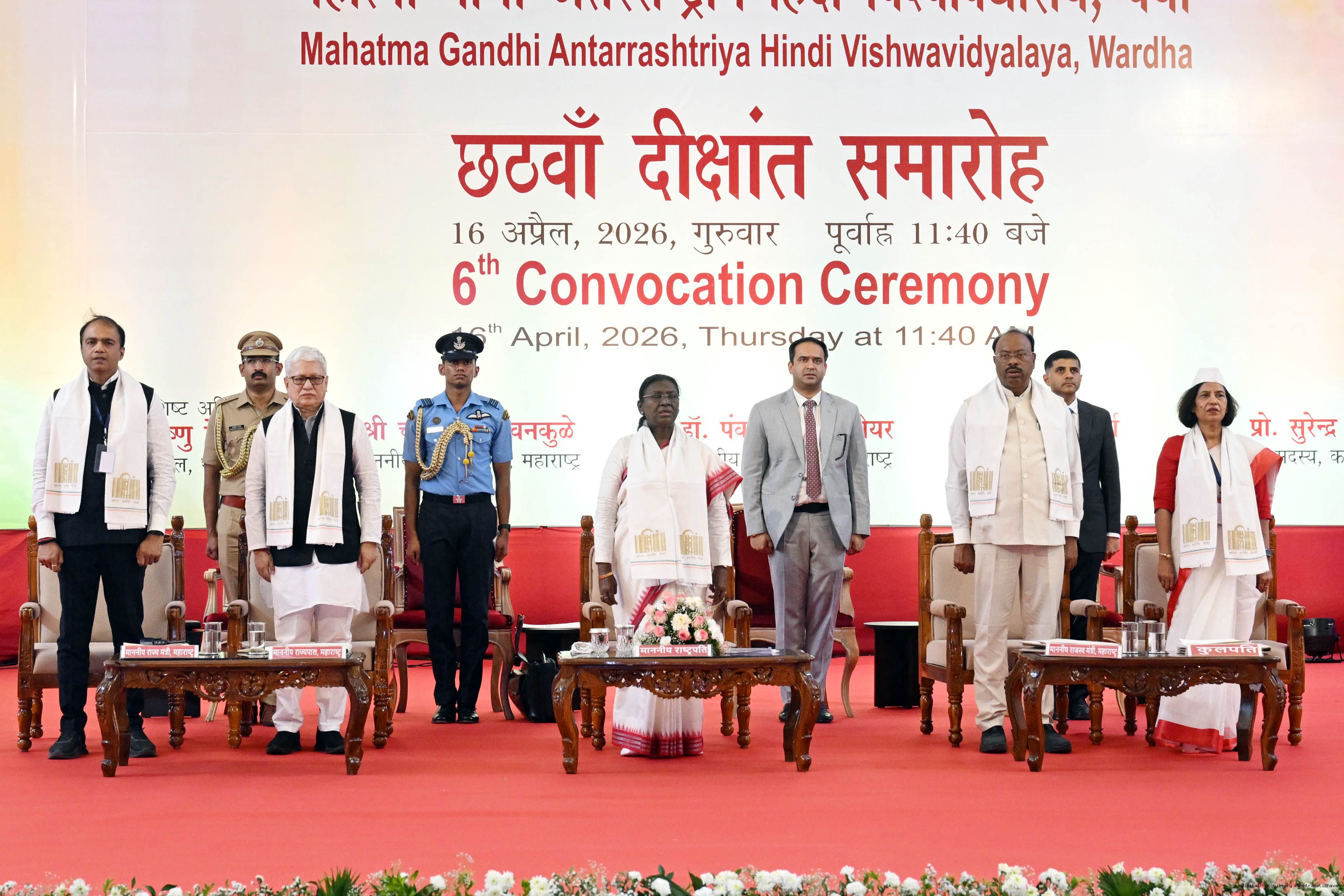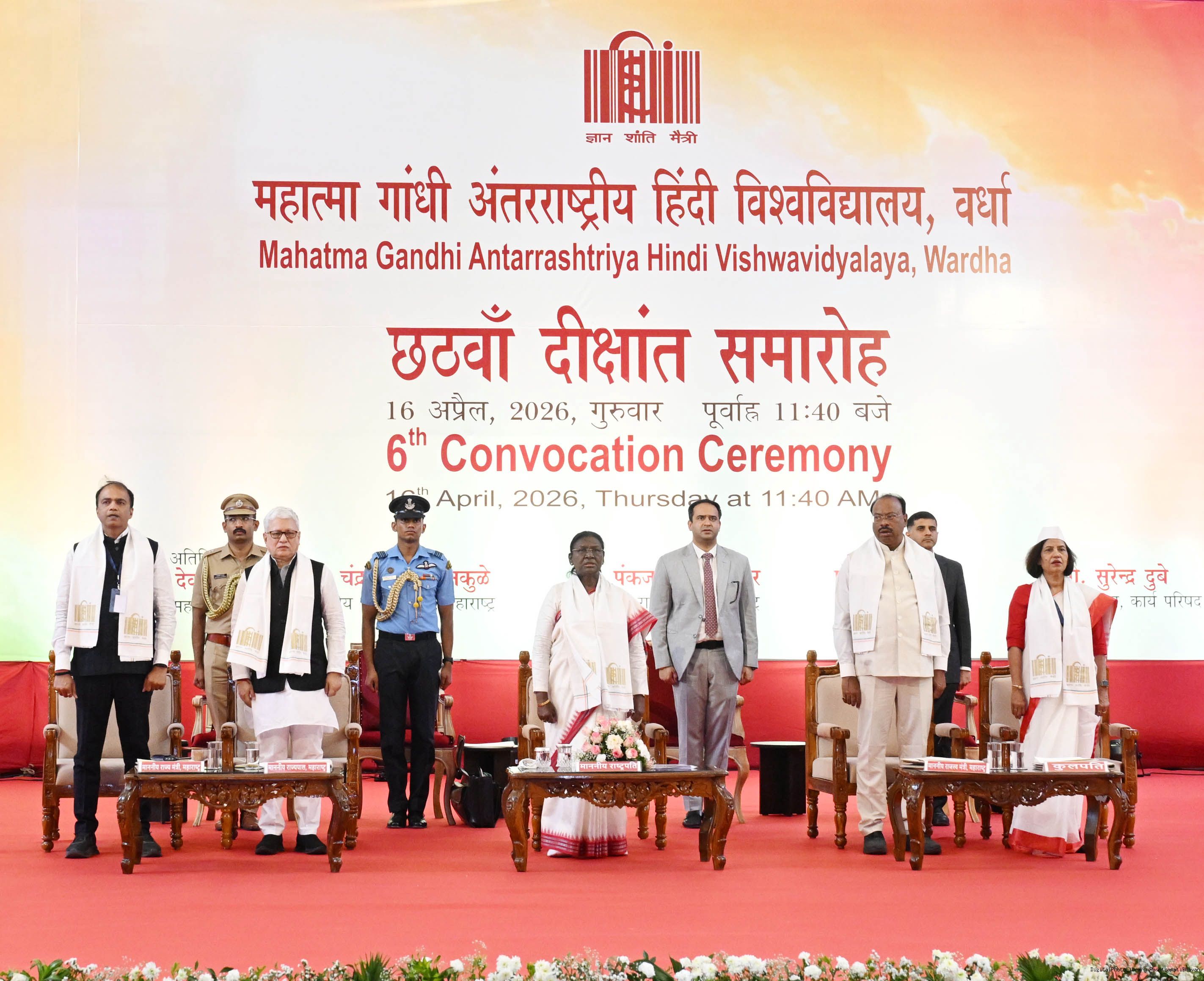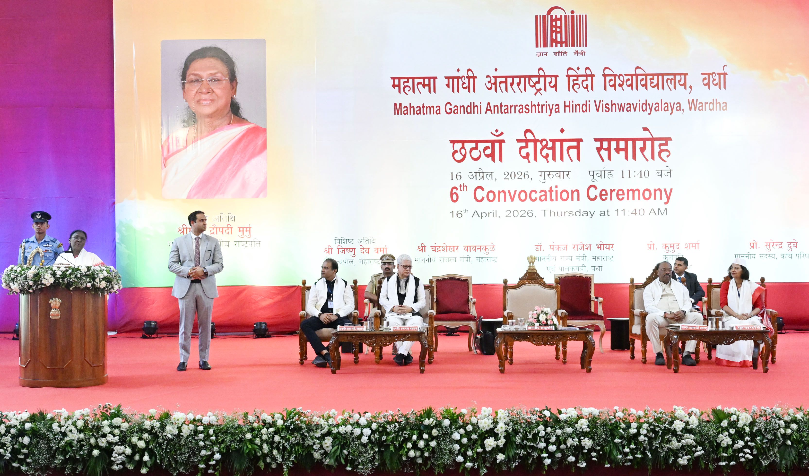 Caption: The President of India, Smt Droupadi Murmu graced the sixth convocation ceremony of Mahatma Gandhi Antarrashtriya Hindi Vishwavidyalaya at Wardha, Maharashtra on April 16, 2026.