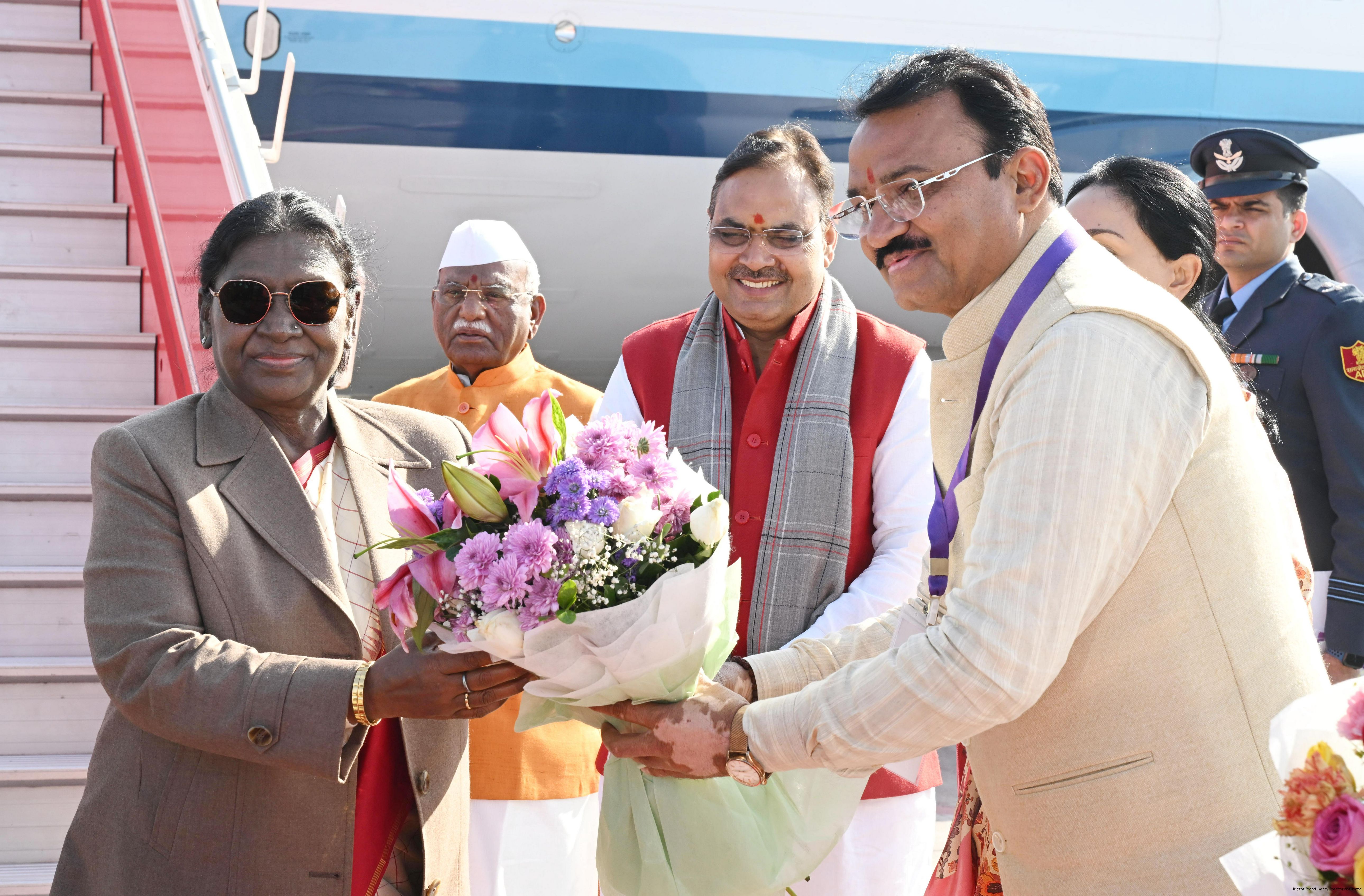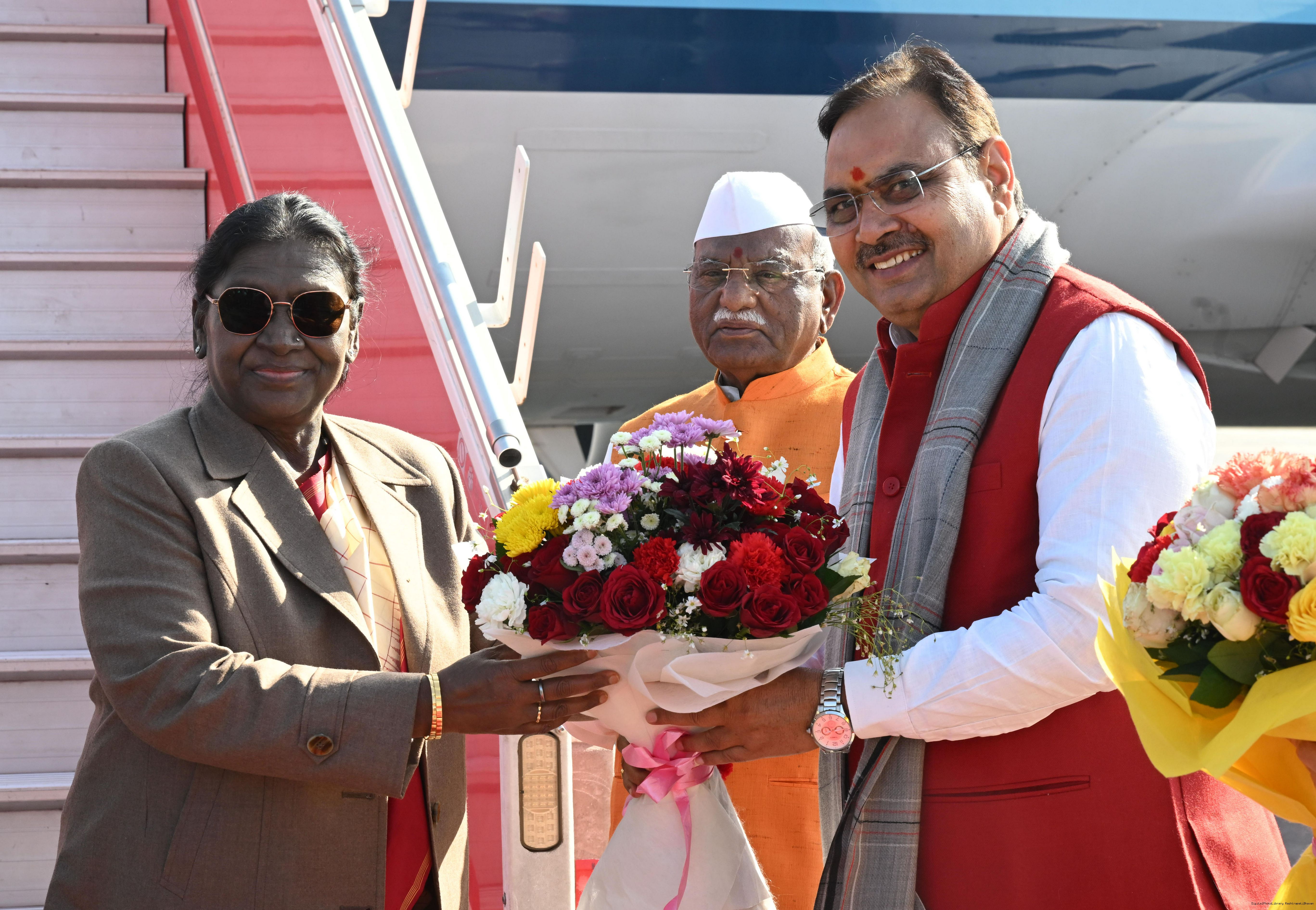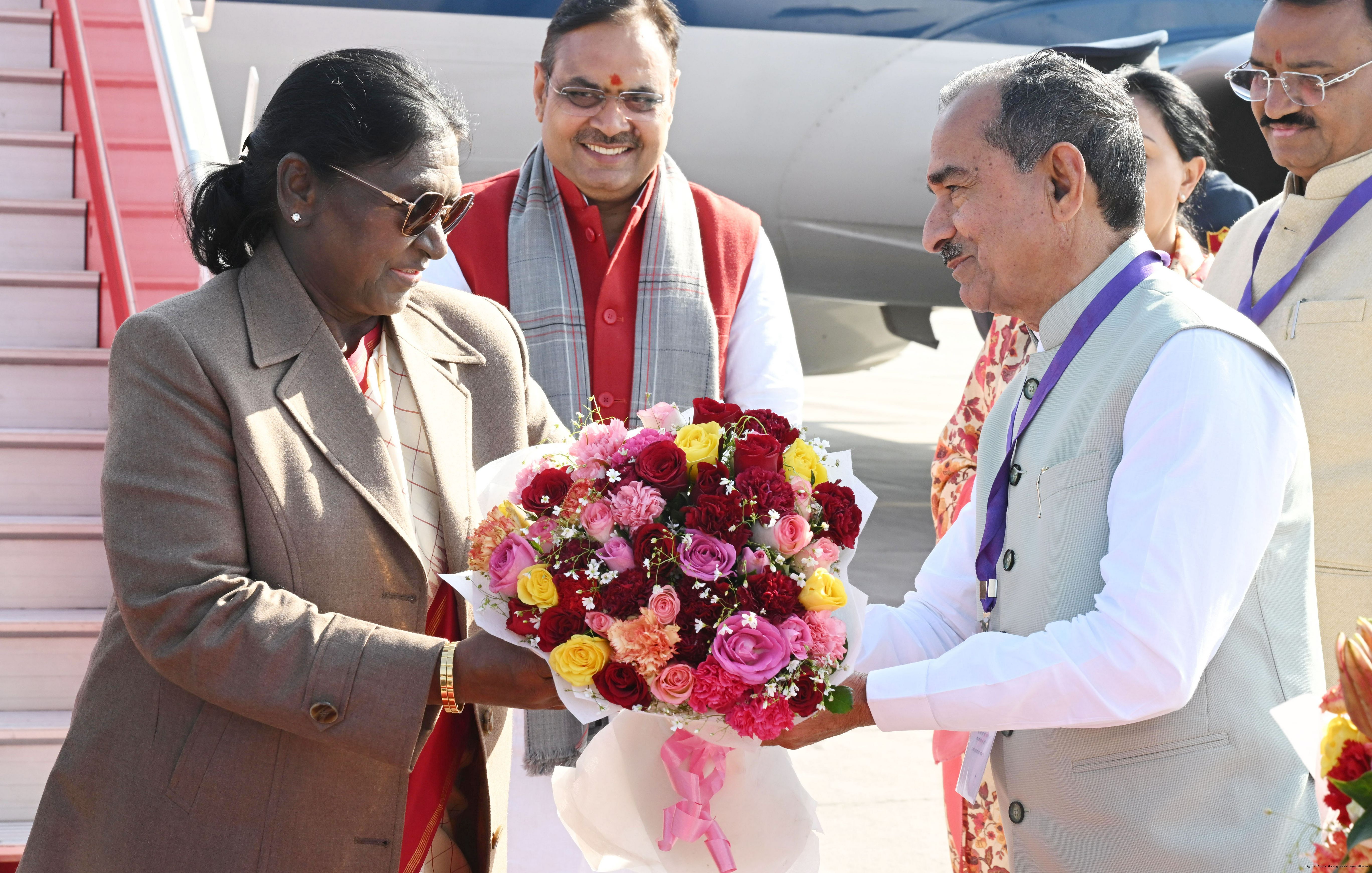 | Caption: | The Governor of Rajasthan, Shri Haribhau Kisanrao Bagde, Chief Minister Shri Bhajanlal Sharma and Deputy Chief Ministers Smt Diya Kumari and Dr. Prem Chand Bairwa received the President of India, Smt Droupadi Murmu on her arrival in Jaipur, Rajasthan on January 16, 2026. |
