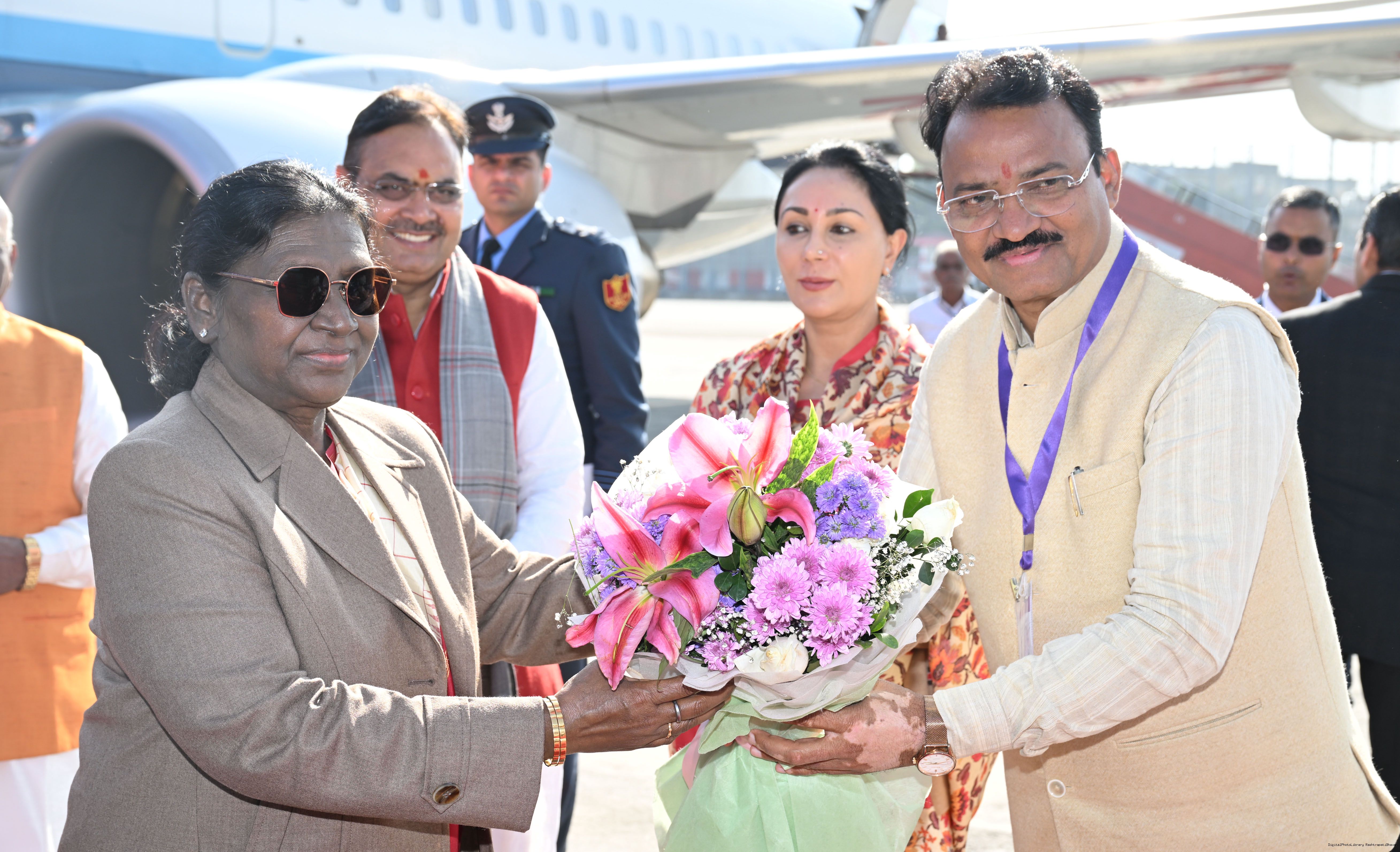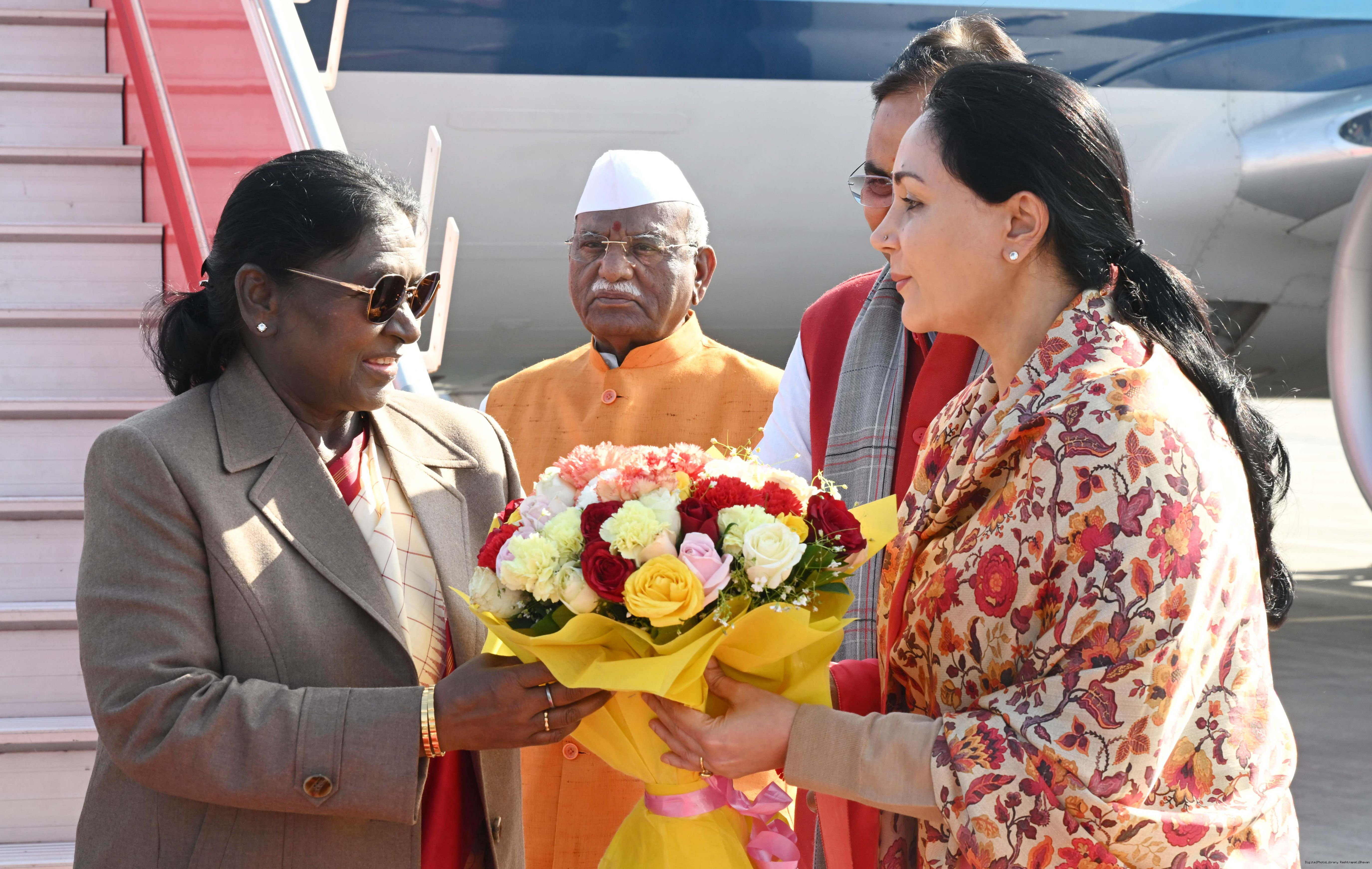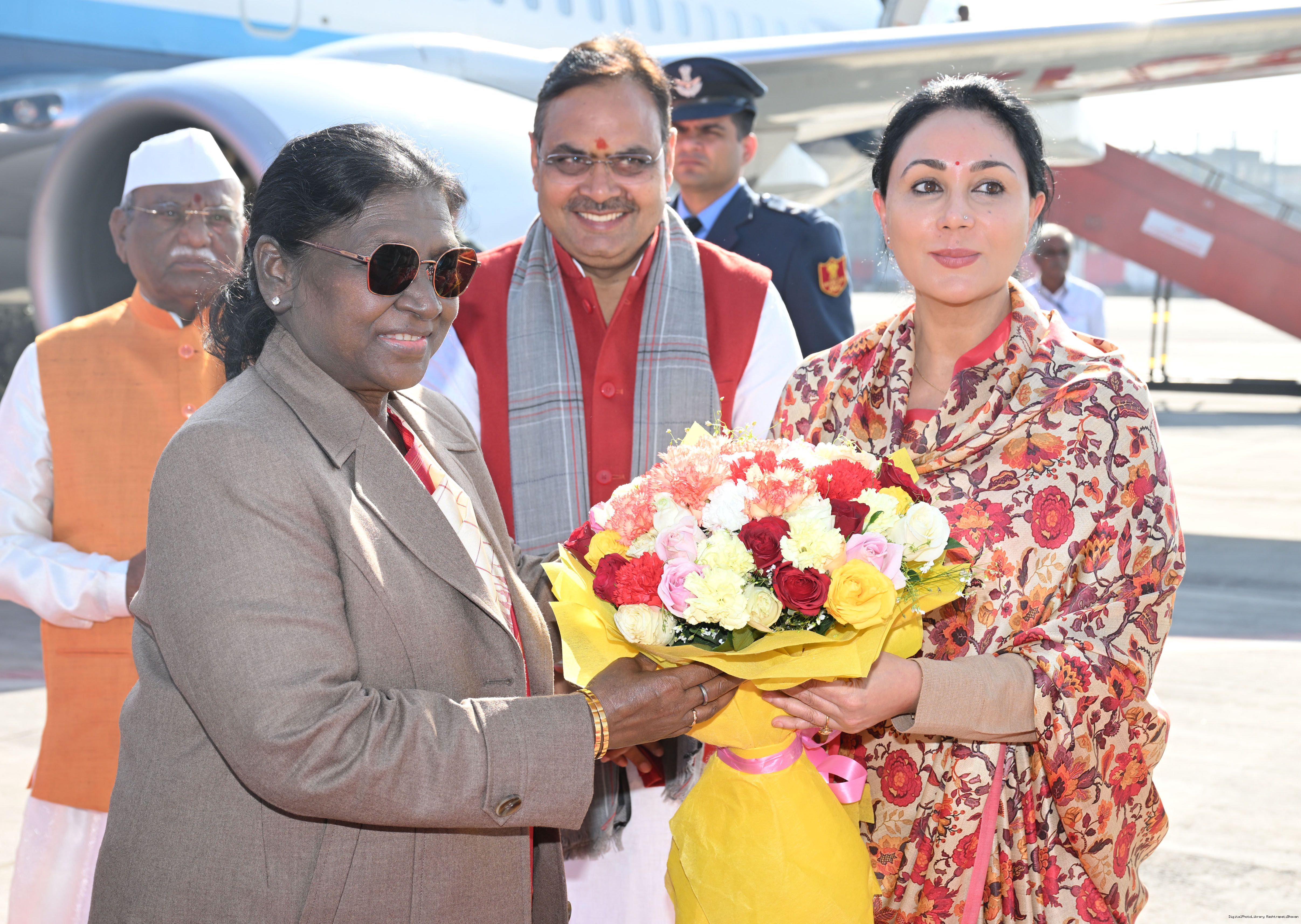 | Caption: | The Governor of Rajasthan, Shri Haribhau Kisanrao Bagde, Chief Minister Shri Bhajanlal Sharma and Deputy Chief Ministers Smt Diya Kumari and Dr. Prem Chand Bairwa received the President of India, Smt Droupadi Murmu on her arrival in Jaipur, Rajasthan on January 16, 2026. |