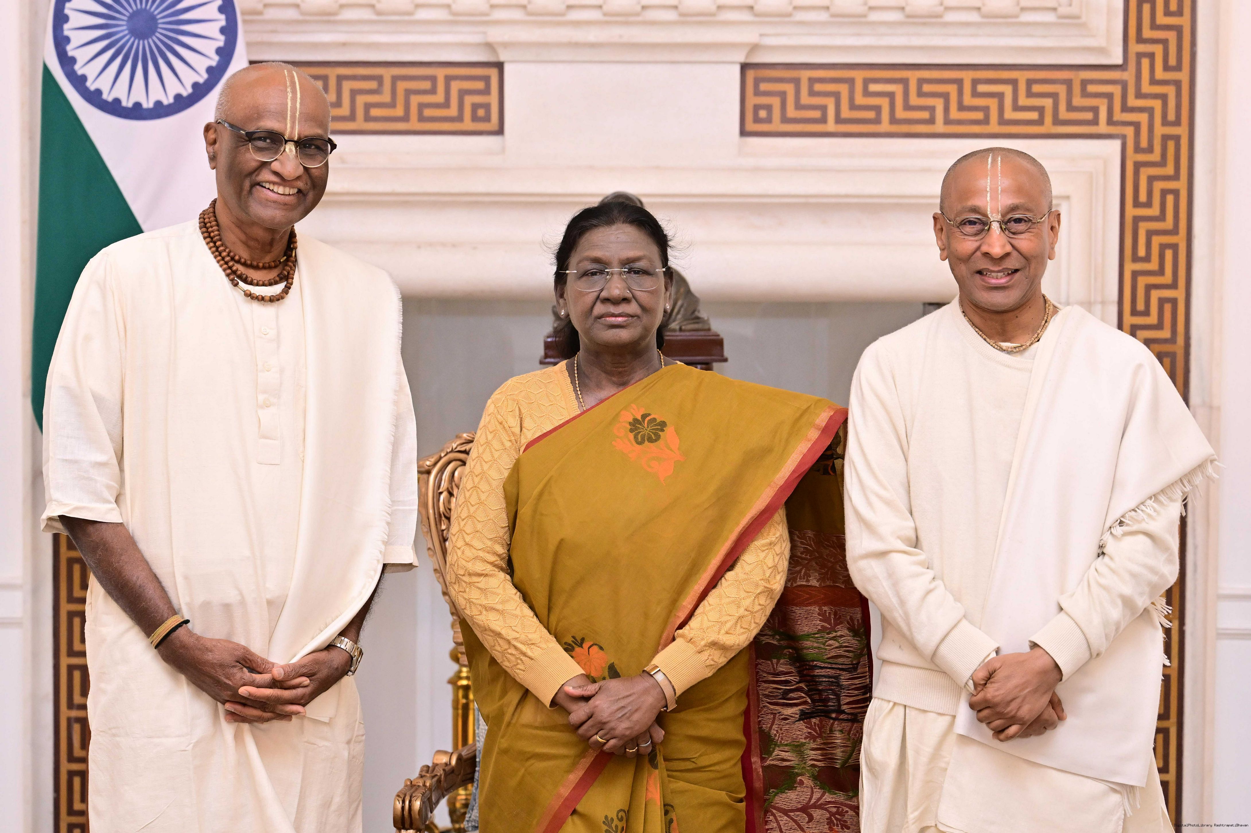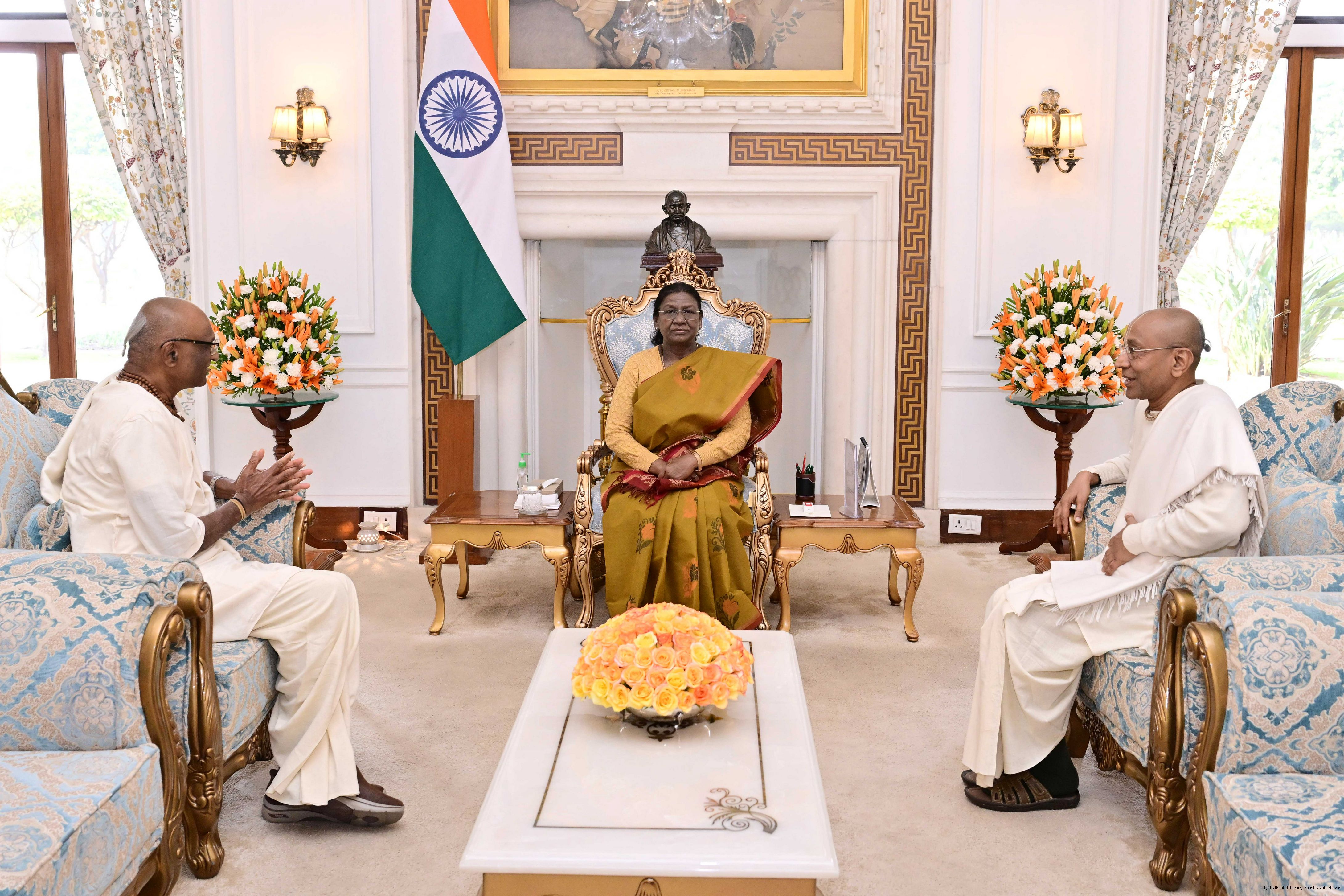 | Caption: | Shri Madhu Pandit Dasa, Founder Chairperson, The Akshaya Patra Foundation and Shri Chanchalapathi Das, Vice Chairman and Co-Founder meeting with the President of India, Smt Droupadi Murmu at Rashtrapati Bhavan on January 22, 2026. |