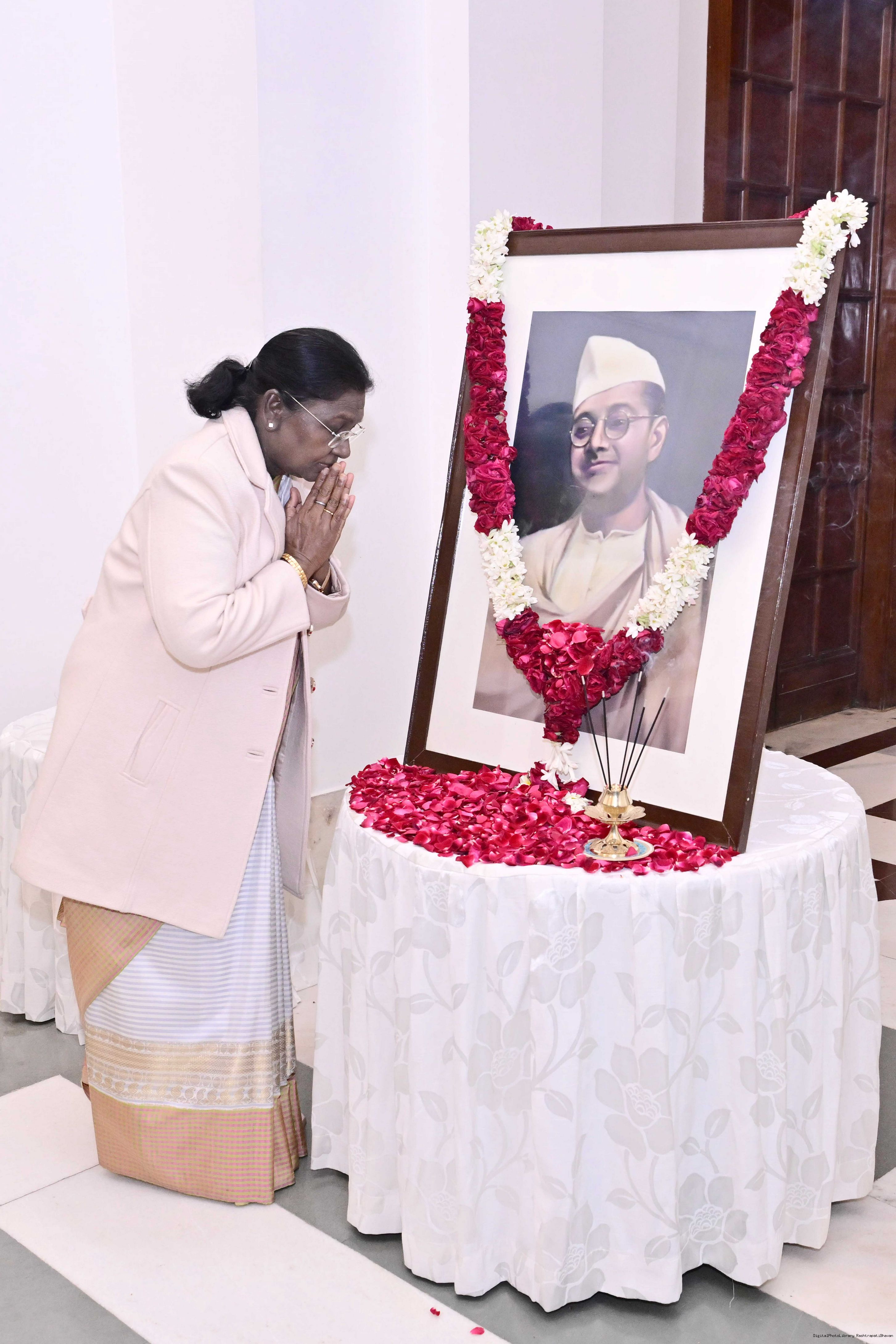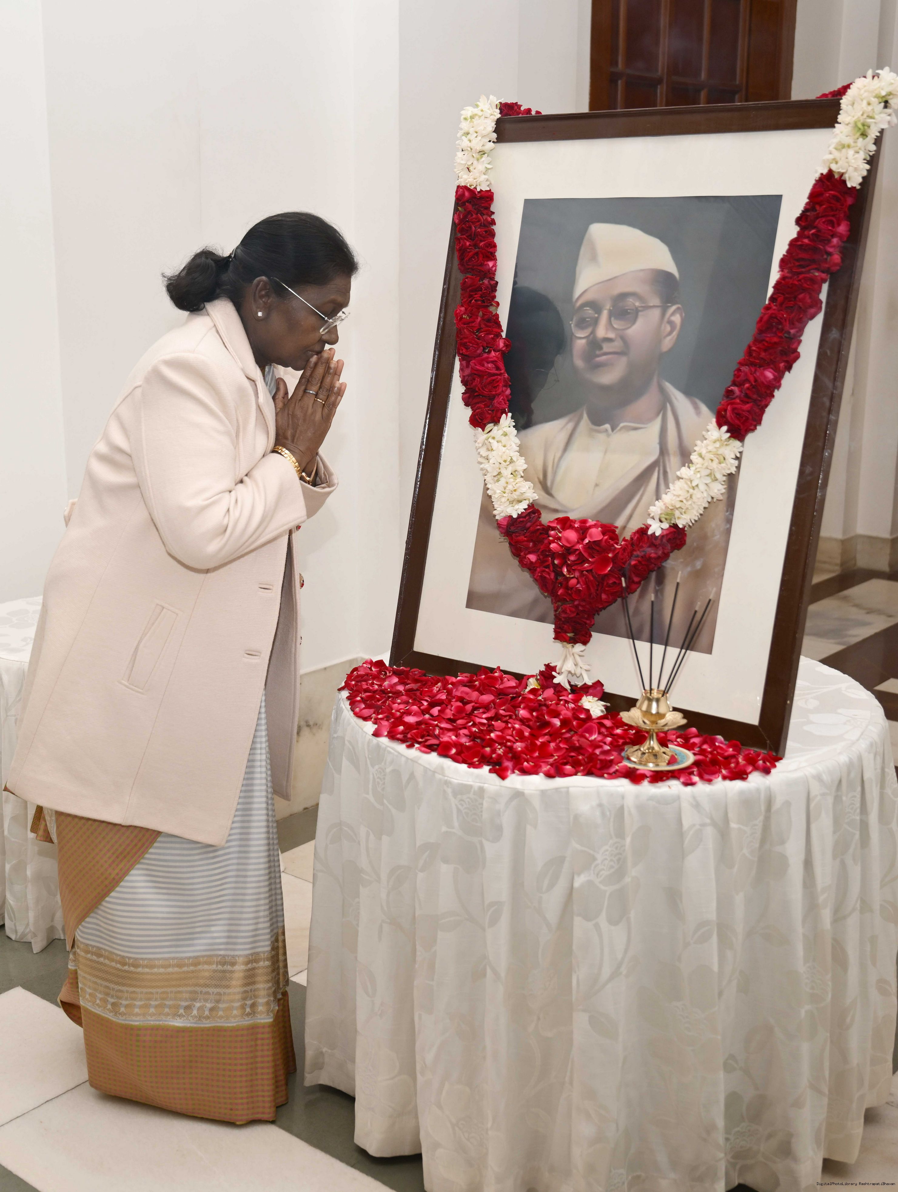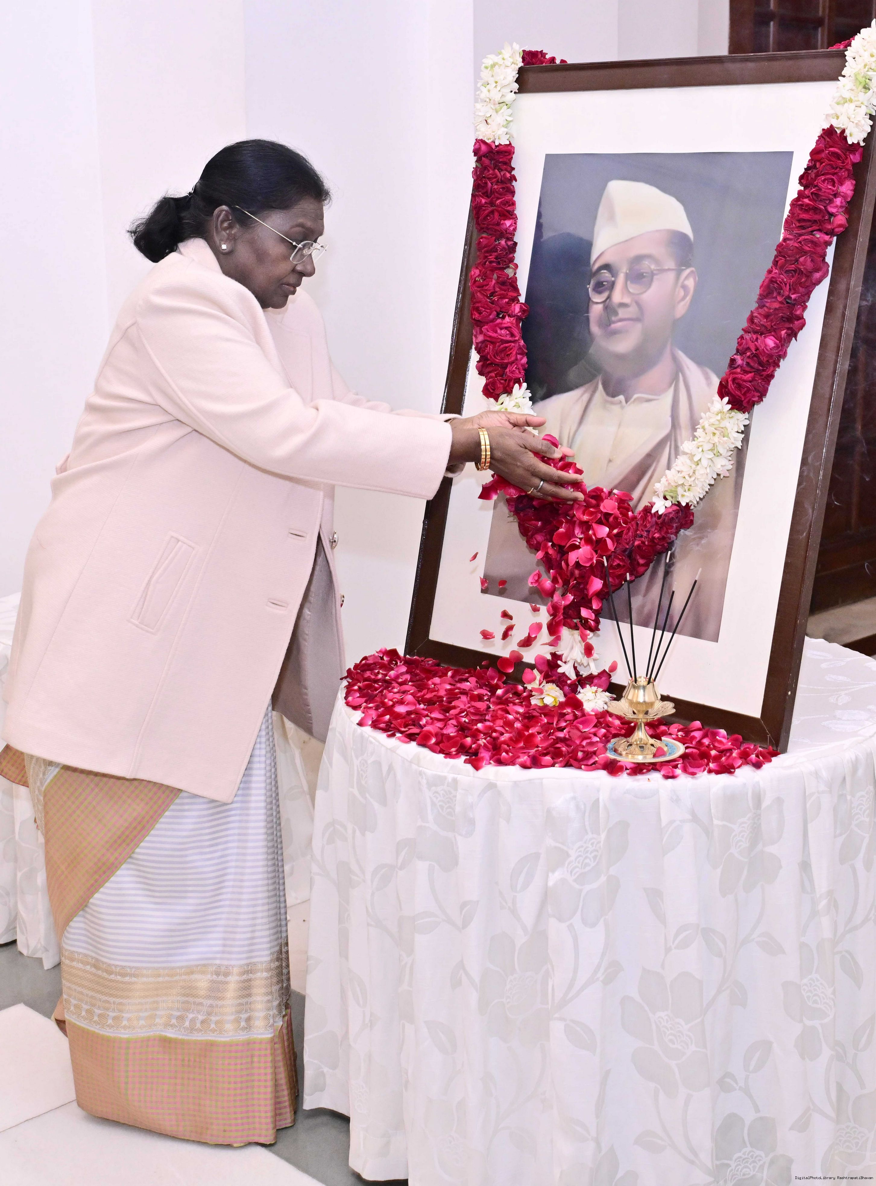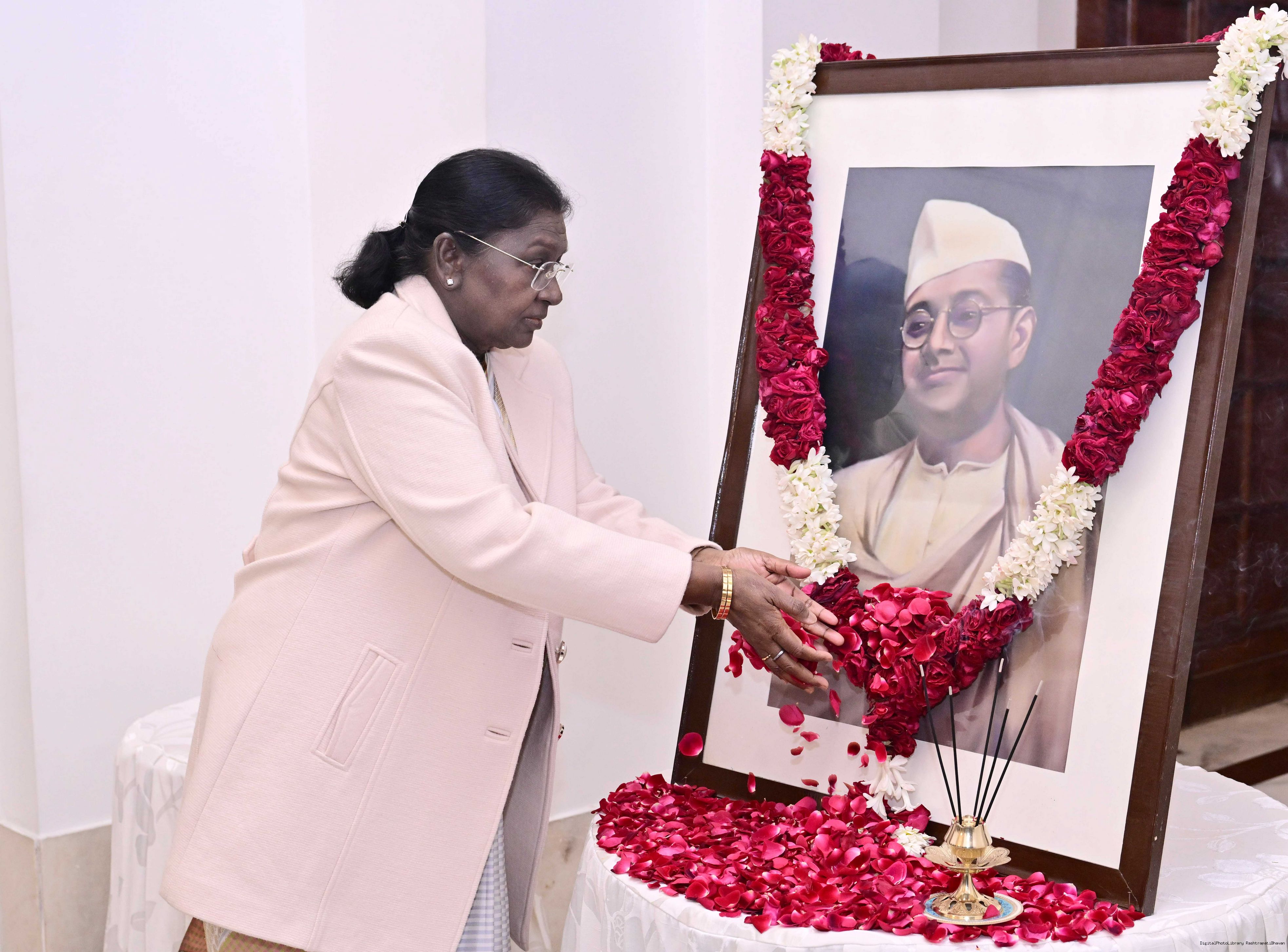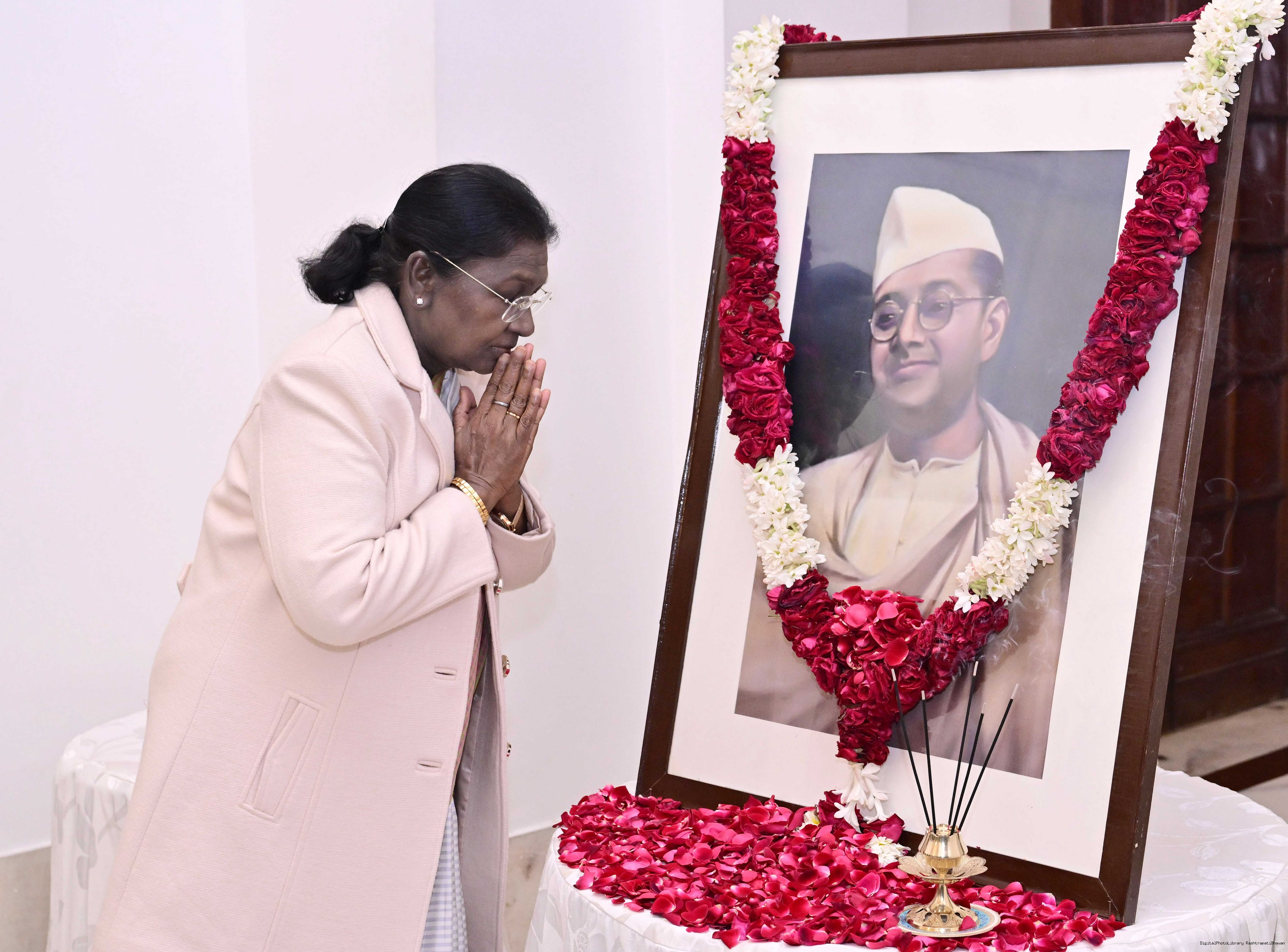 | Caption: | The President of India, Smt Droupadi Murmu, paid floral tributes to Netaji Subhas Chandra Bose on his birth anniversary, observed as Parakram Diwas, at Rashtrapati Bhavan on January 23, 2026. |