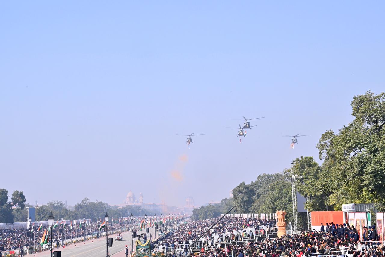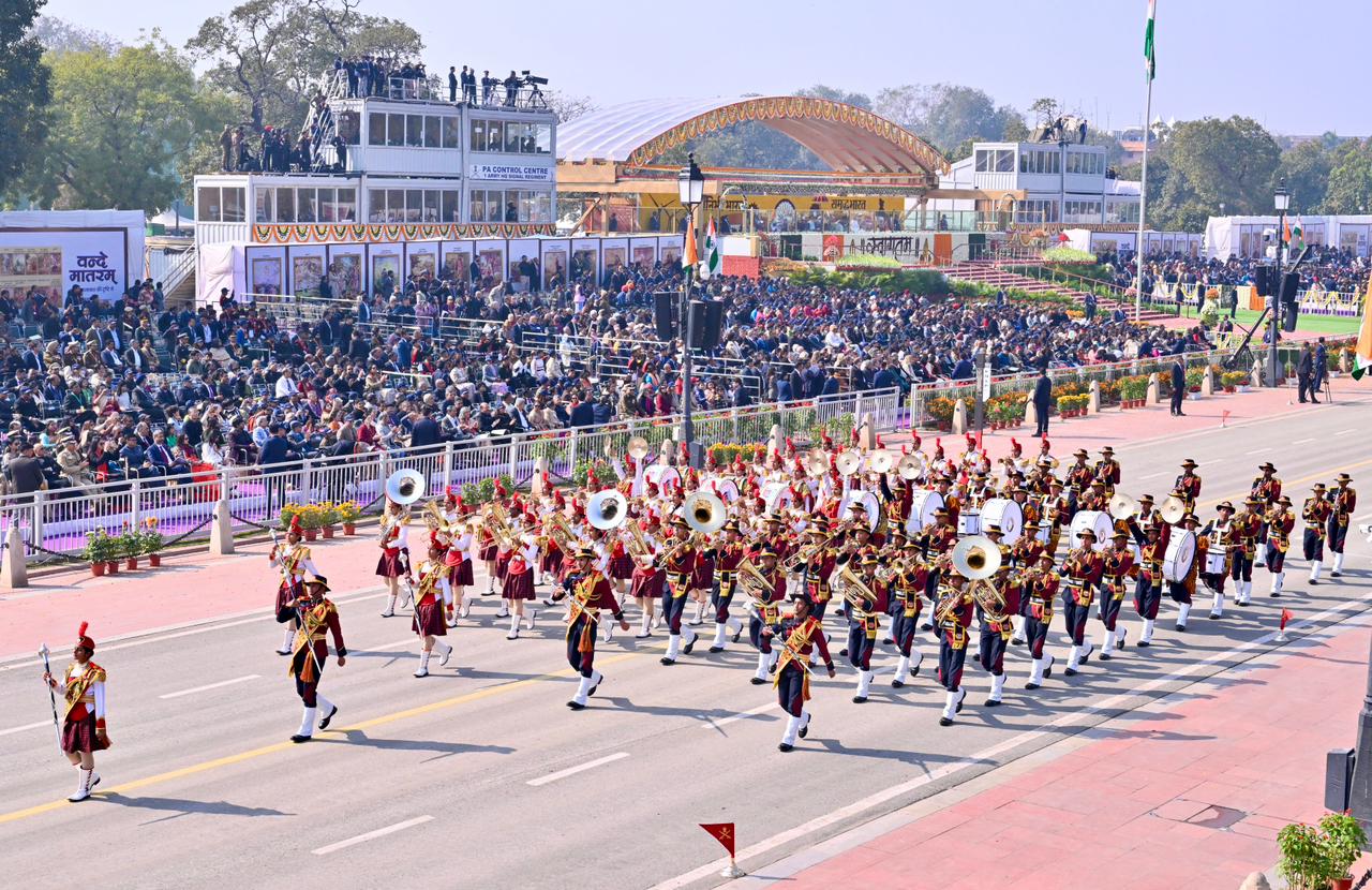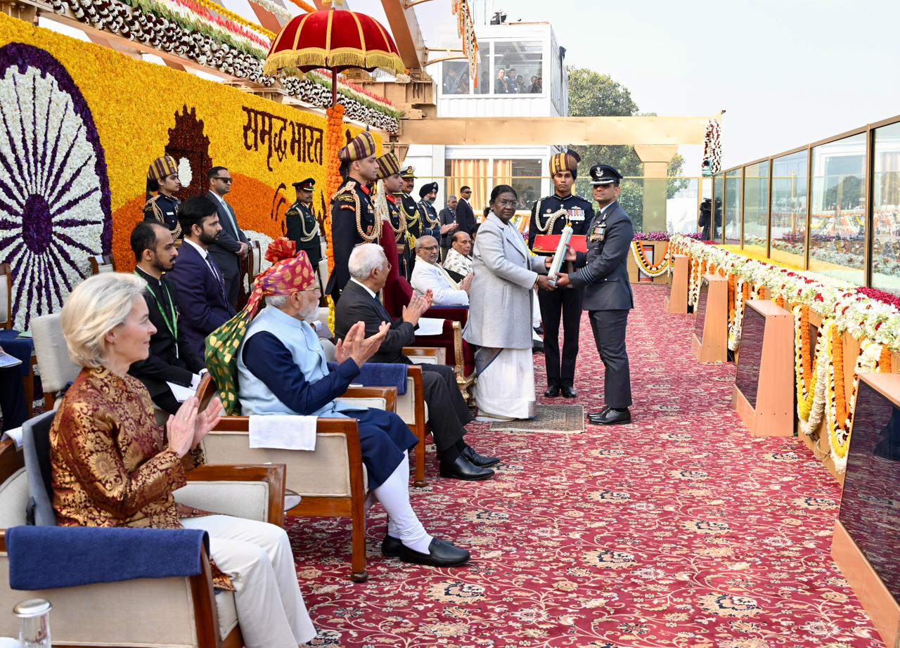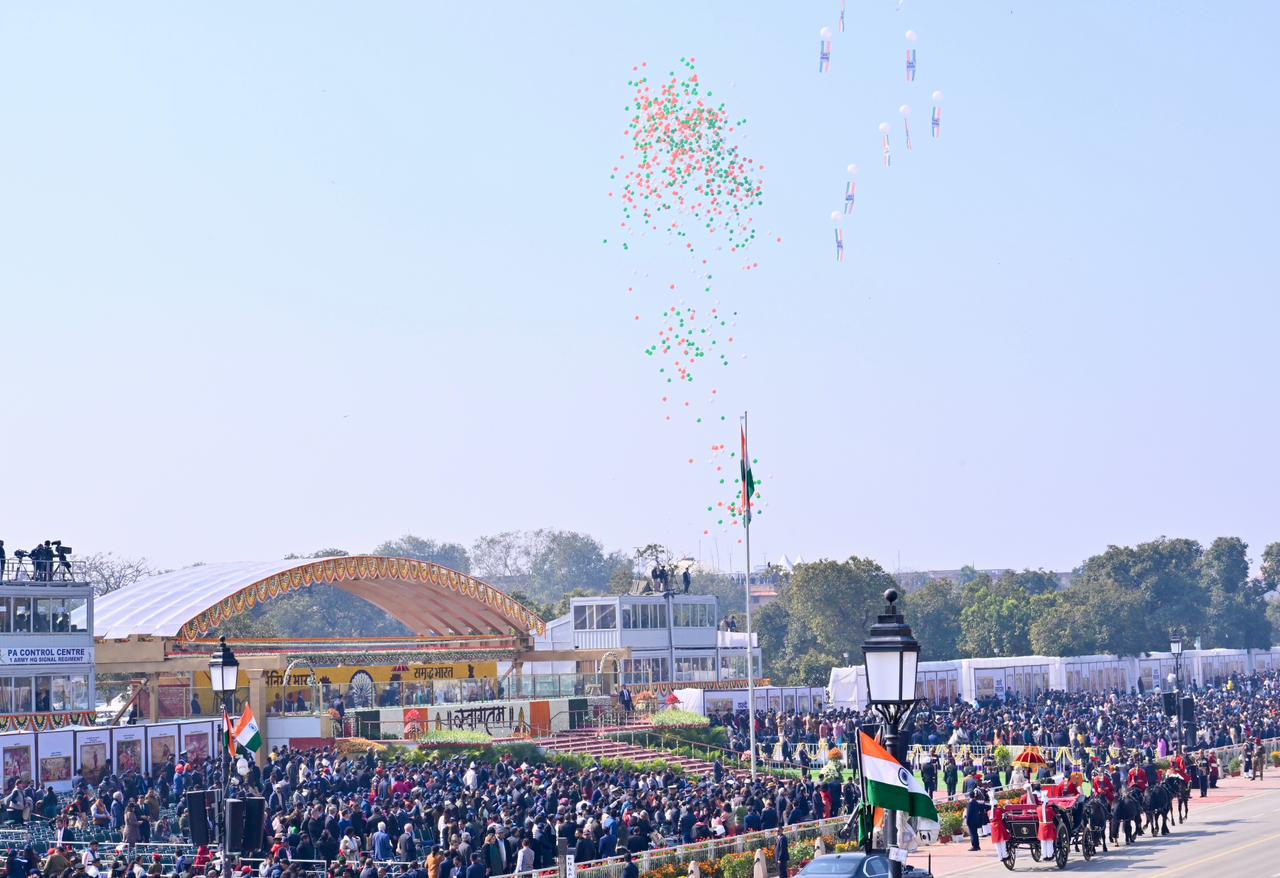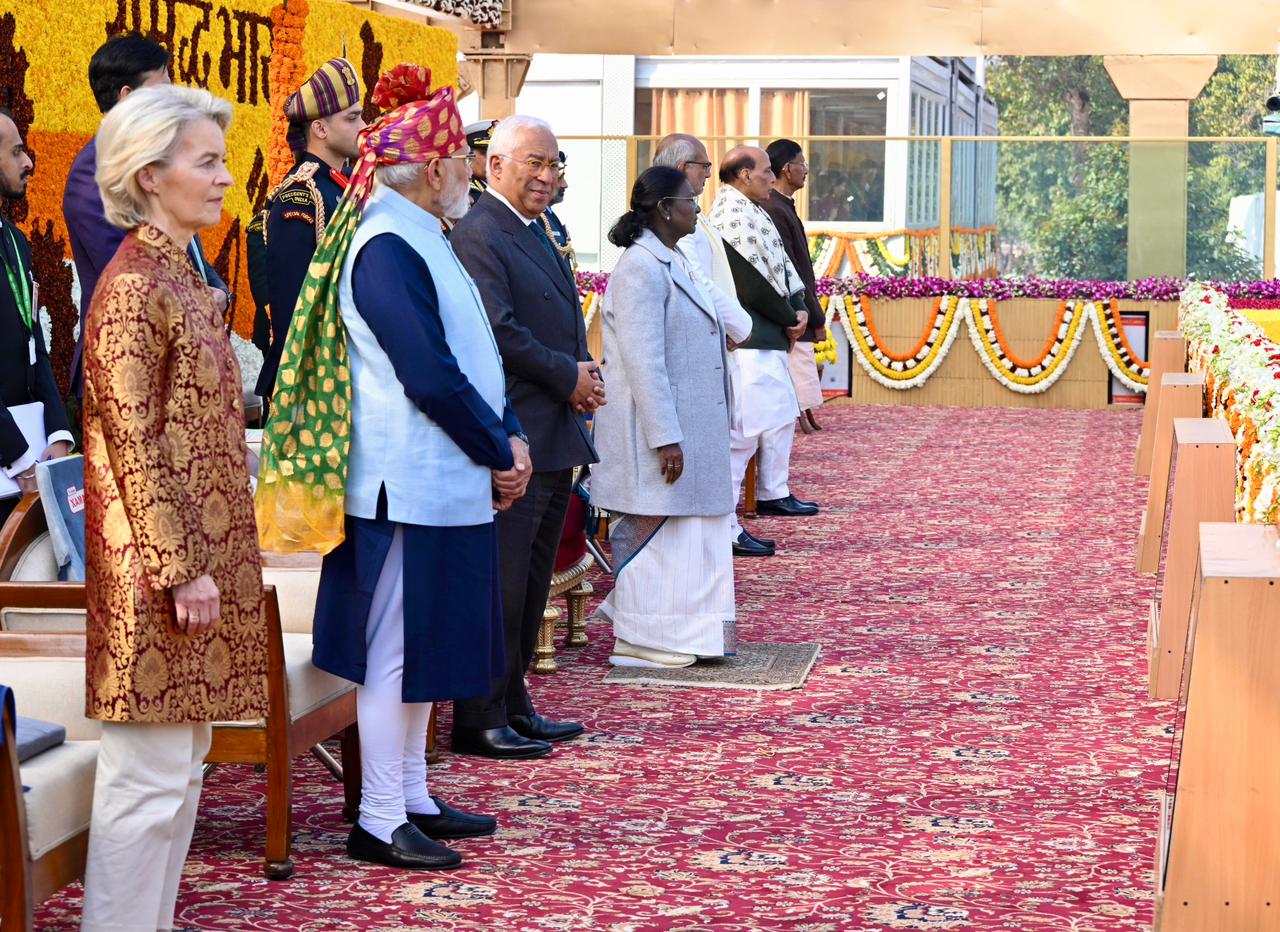 | Caption: | The President of India, Smt Droupadi Murmu, along with the Chief Guests, the President of the European Council Mr. Antonio Costa, and the President of the European Commission Ms. Ursula von der Leyen, witnessed the 77th Republic Day Parade at Kartavya Path on January 26, 2026. |
