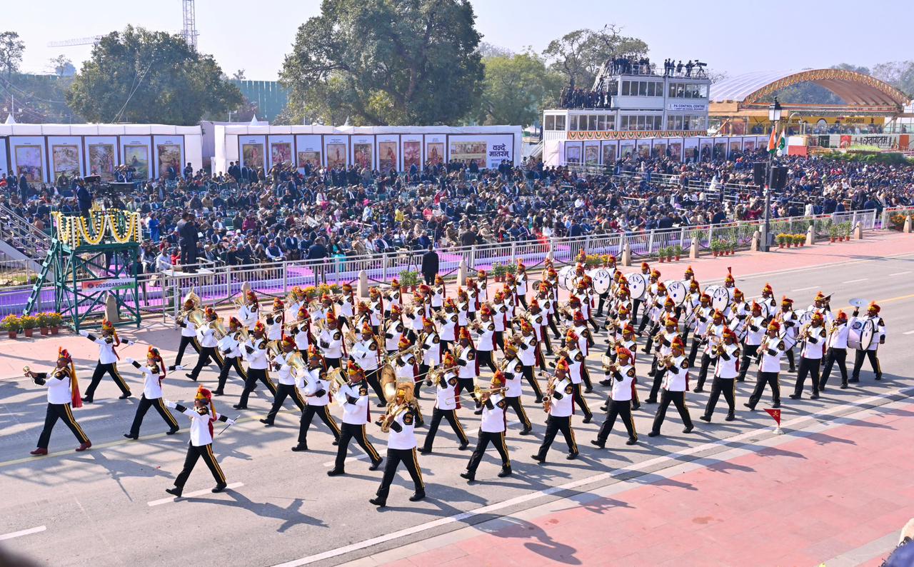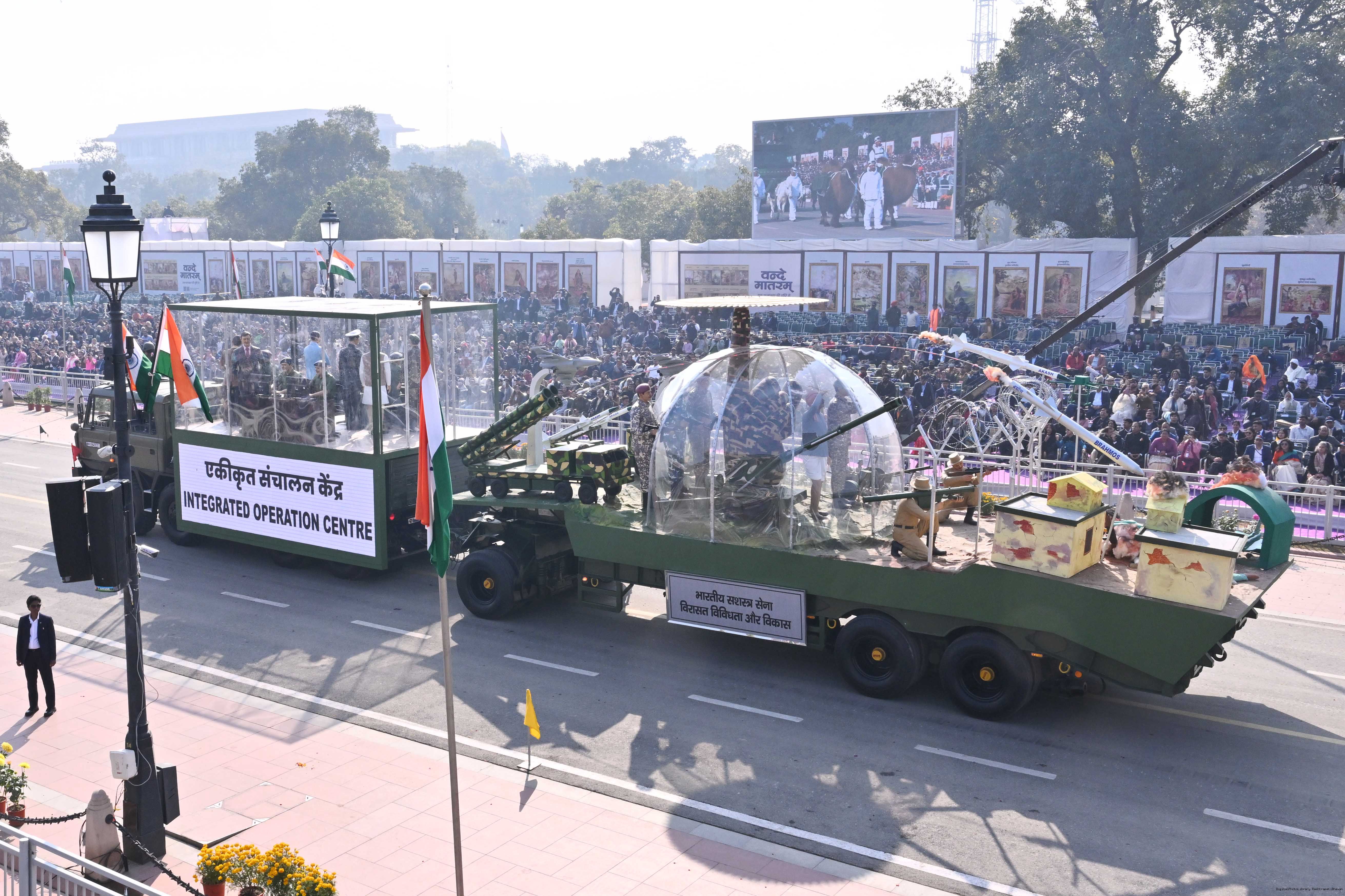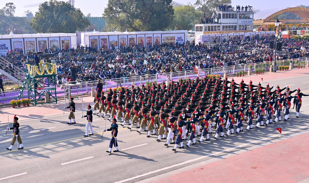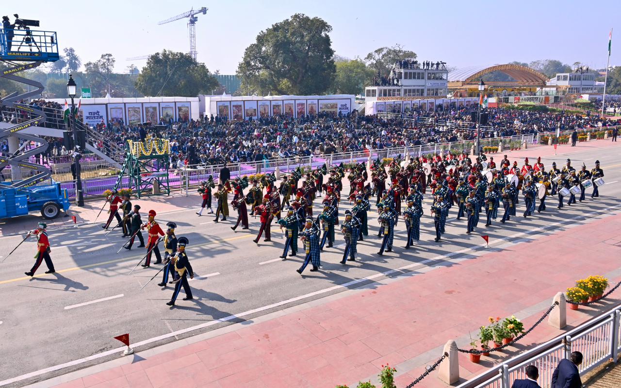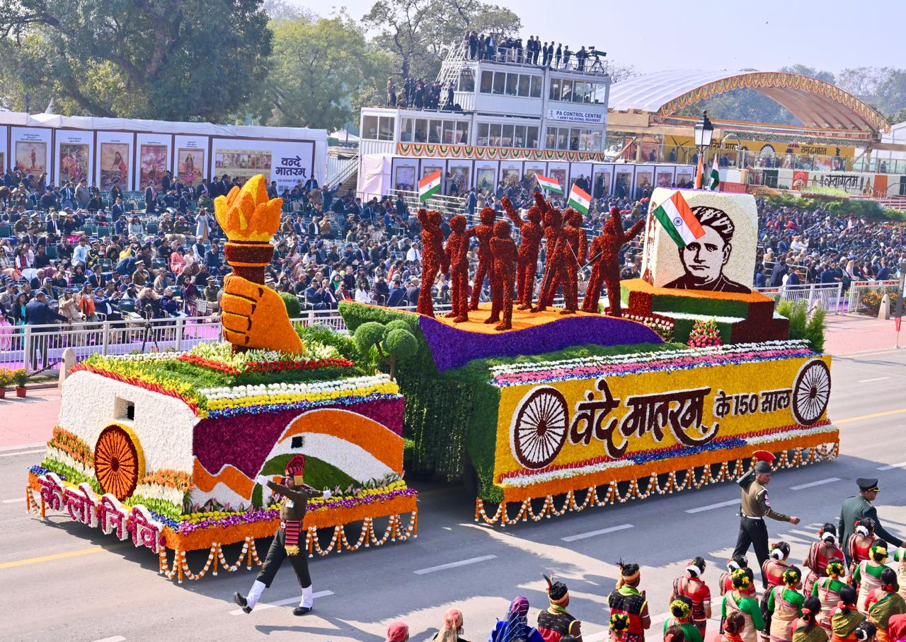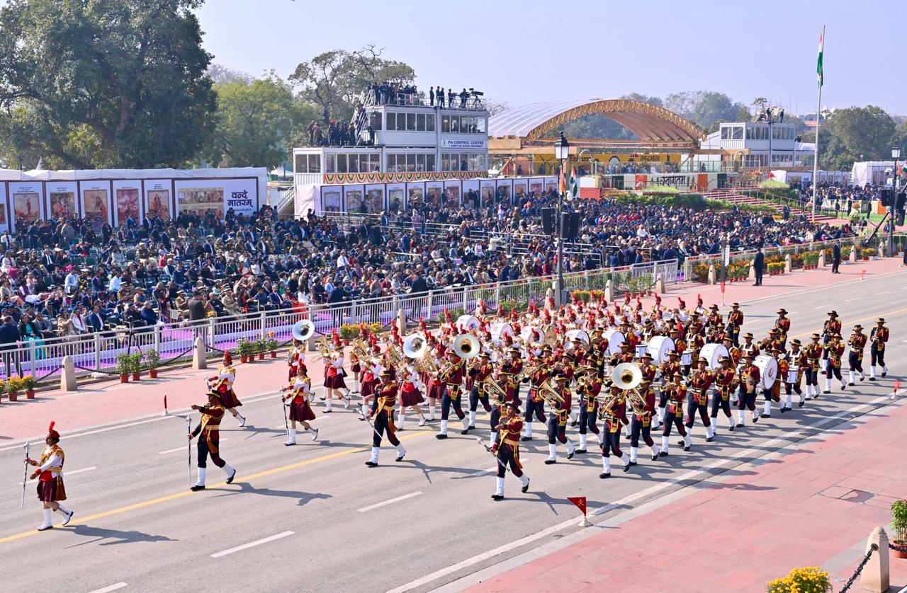 | Caption: | The President of India, Smt Droupadi Murmu, along with the Chief Guests, the President of the European Council Mr. Antonio Costa, and the President of the European Commission Ms. Ursula von der Leyen, witnessed the 77th Republic Day Parade at Kartavya Path on January 26, 2026. |