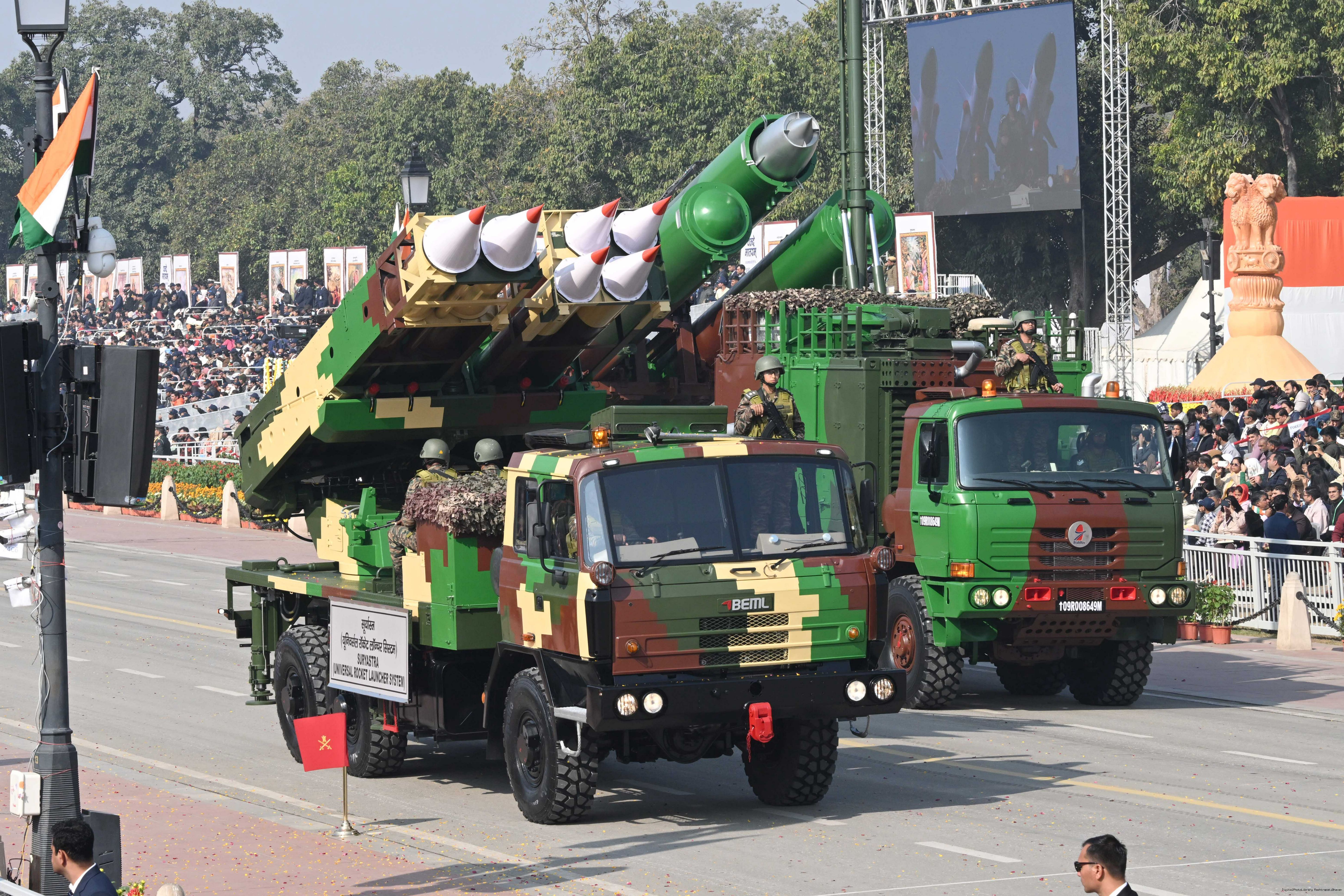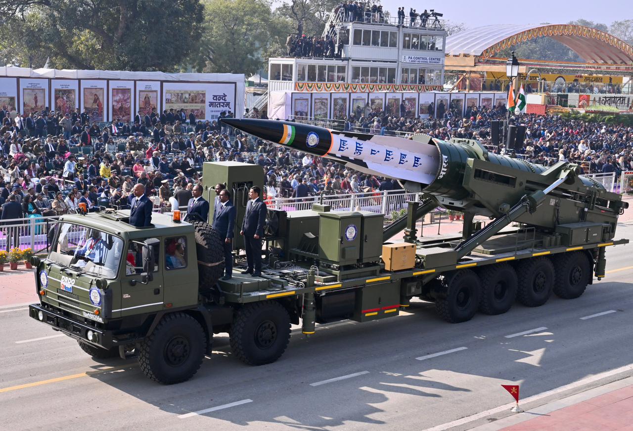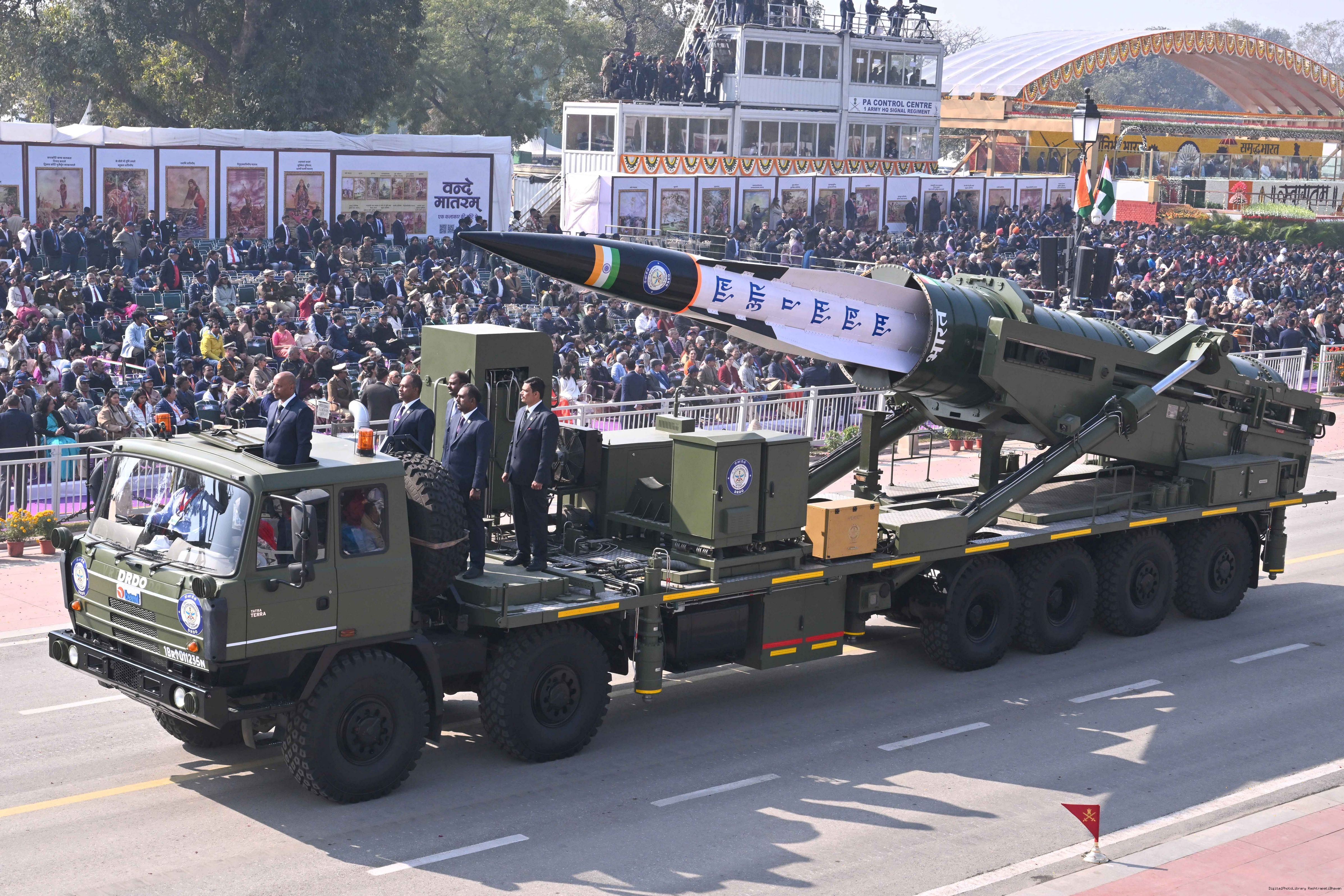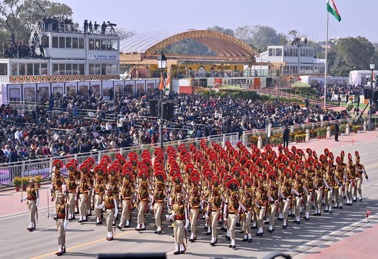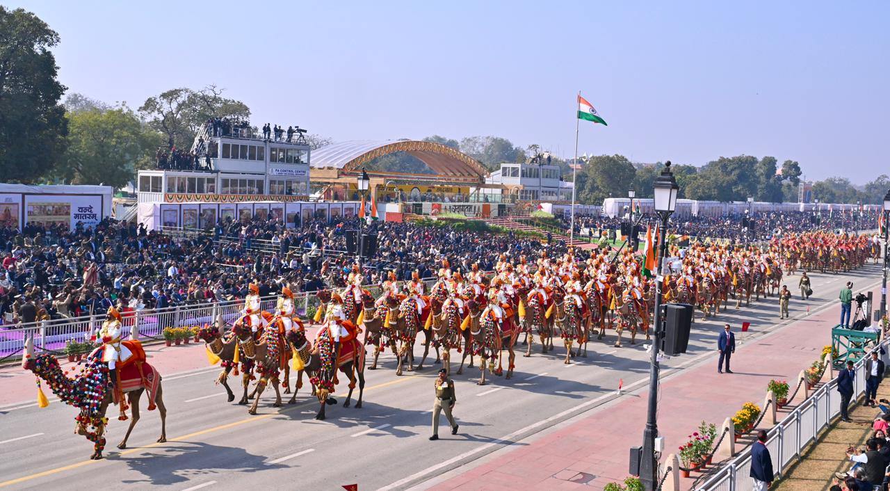 | Caption: | The President of India, Smt Droupadi Murmu, along with the Chief Guests, the President of the European Council Mr. Antonio Costa, and the President of the European Commission Ms. Ursula von der Leyen, witnessed the 77th Republic Day Parade at Kartavya Path on January 26, 2026. |