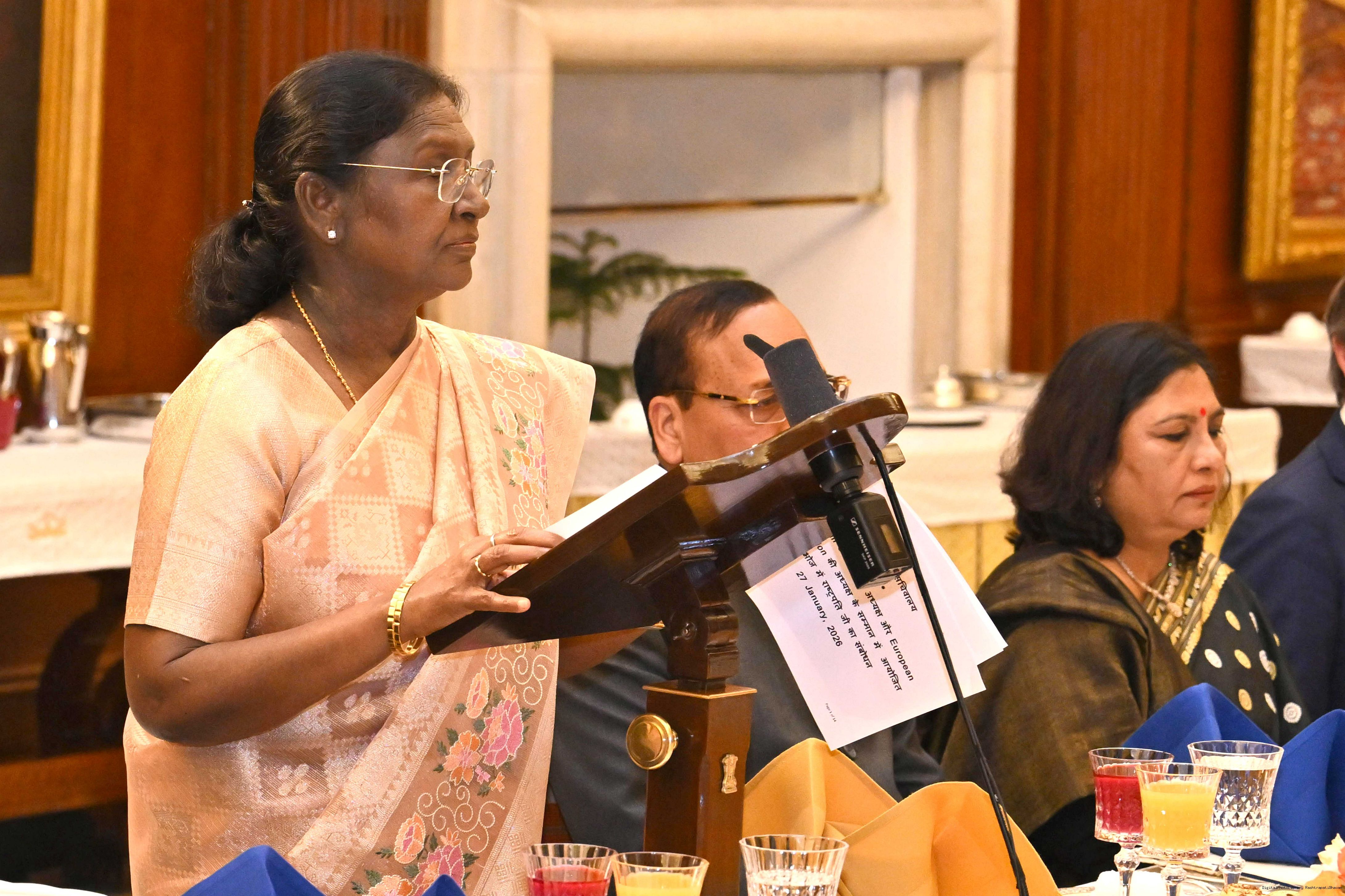| Caption: | The President of India, Smt Droupadi Murmu hosted a banquet in the honour of the Chief Guests of the 77th Republic Day Celebrations, H. E. António Costa, President of the European Council and H. E. Ms Ursula von der Leyen, President of the European Commission at Rashtrapati Bhavan on January 27, 2026. |