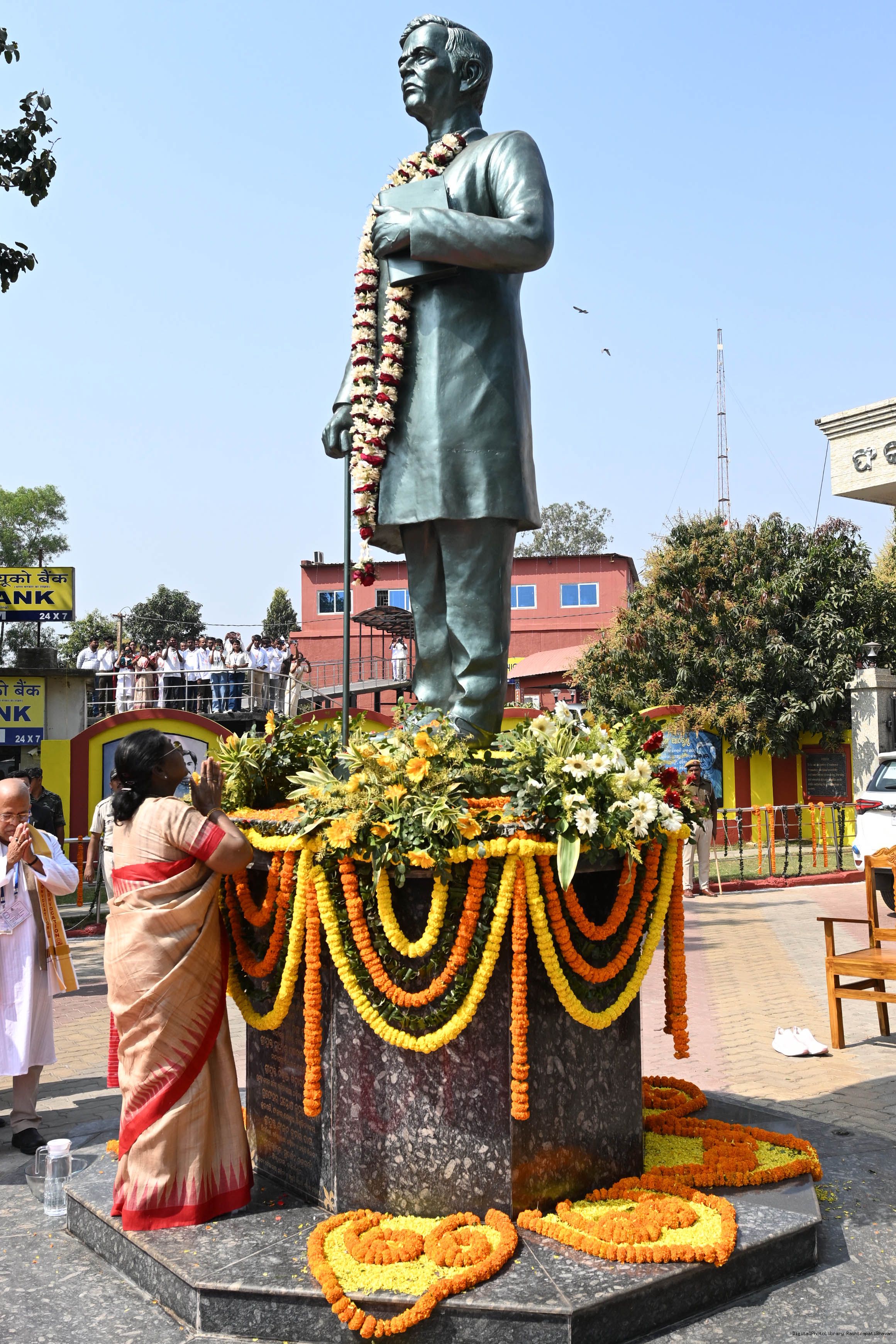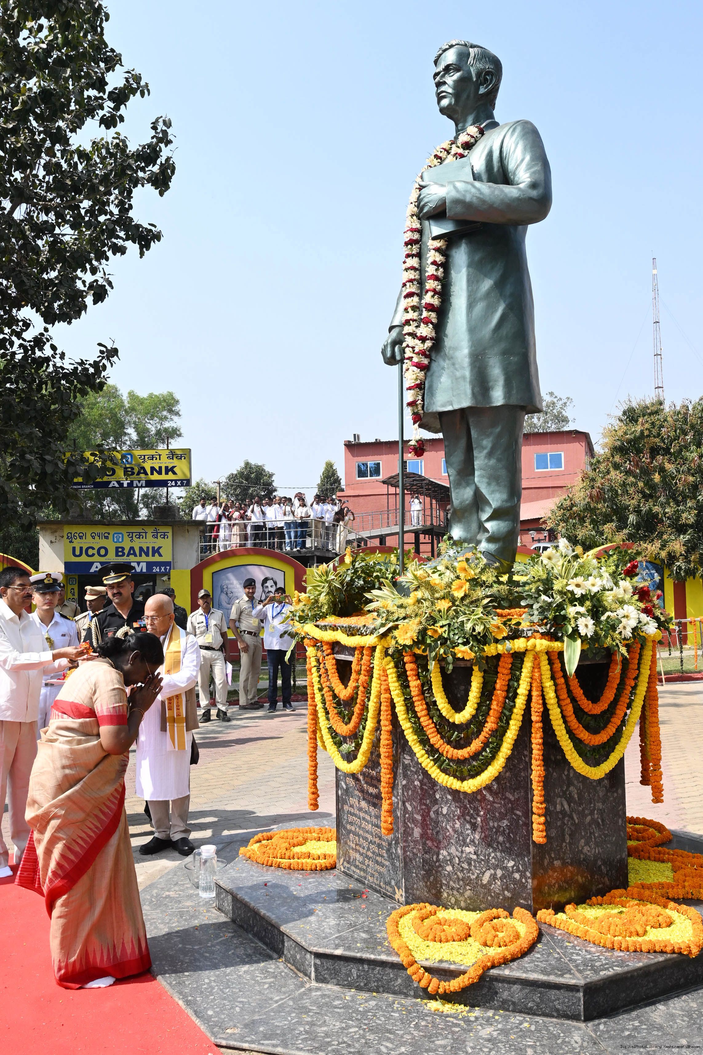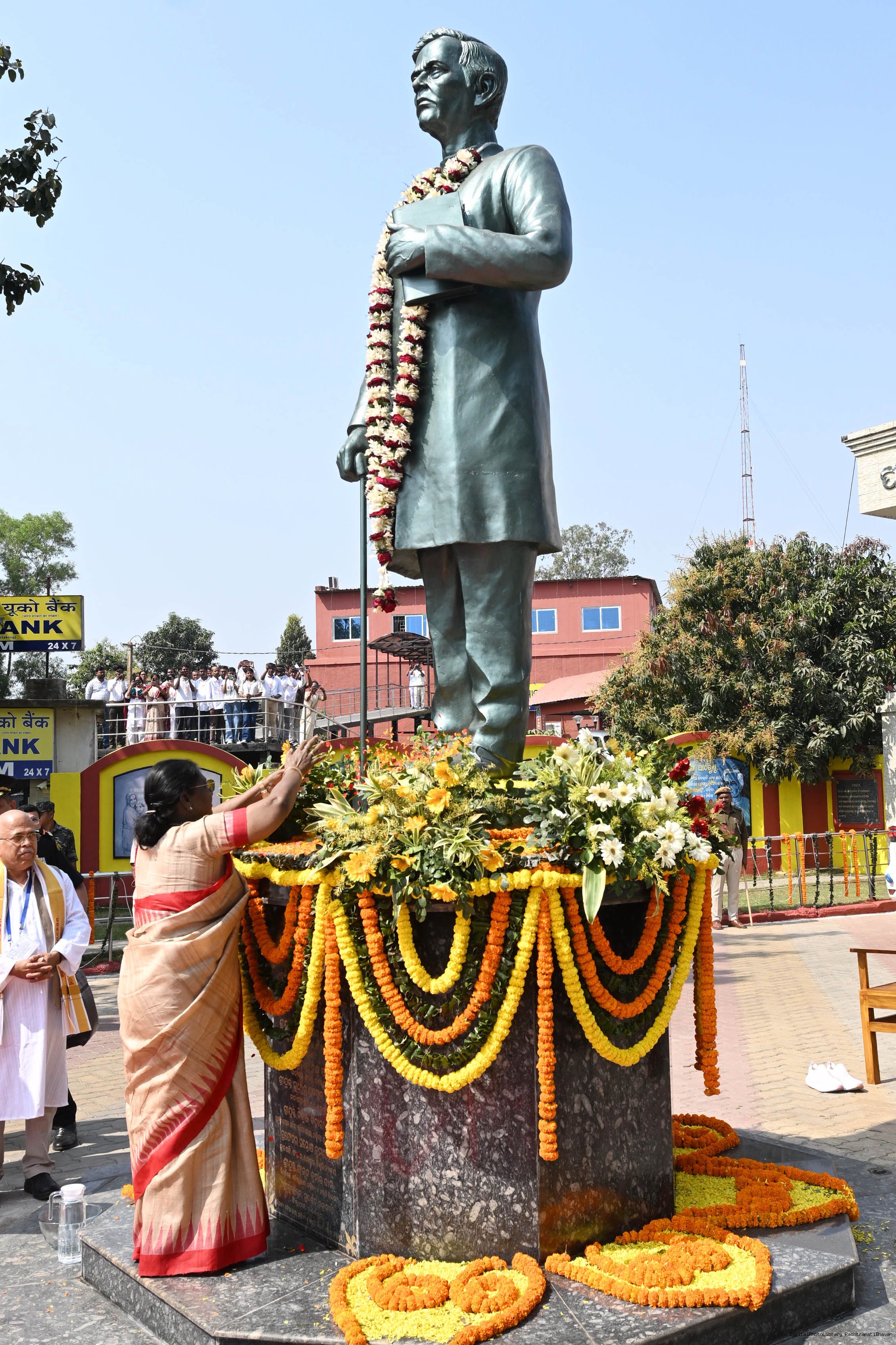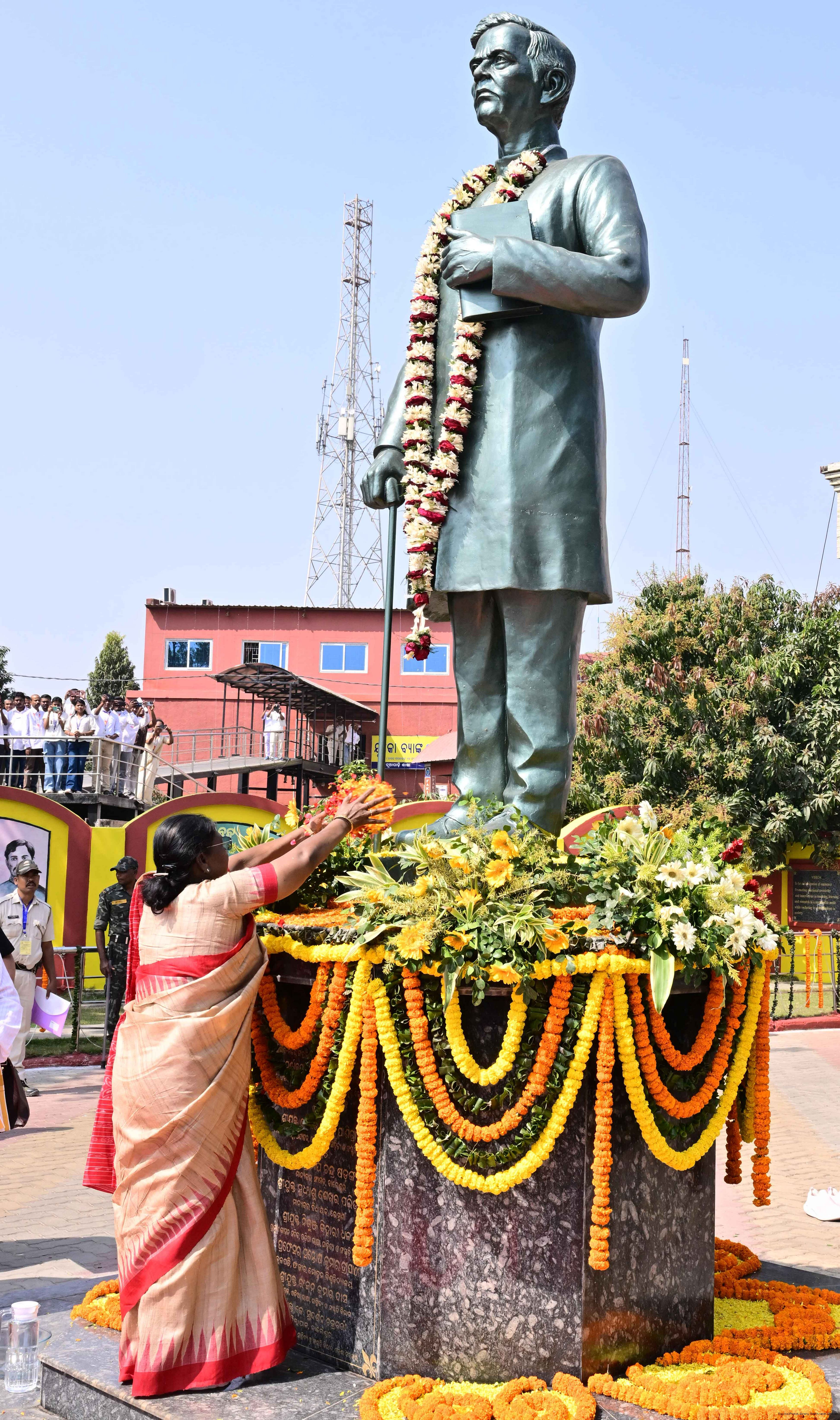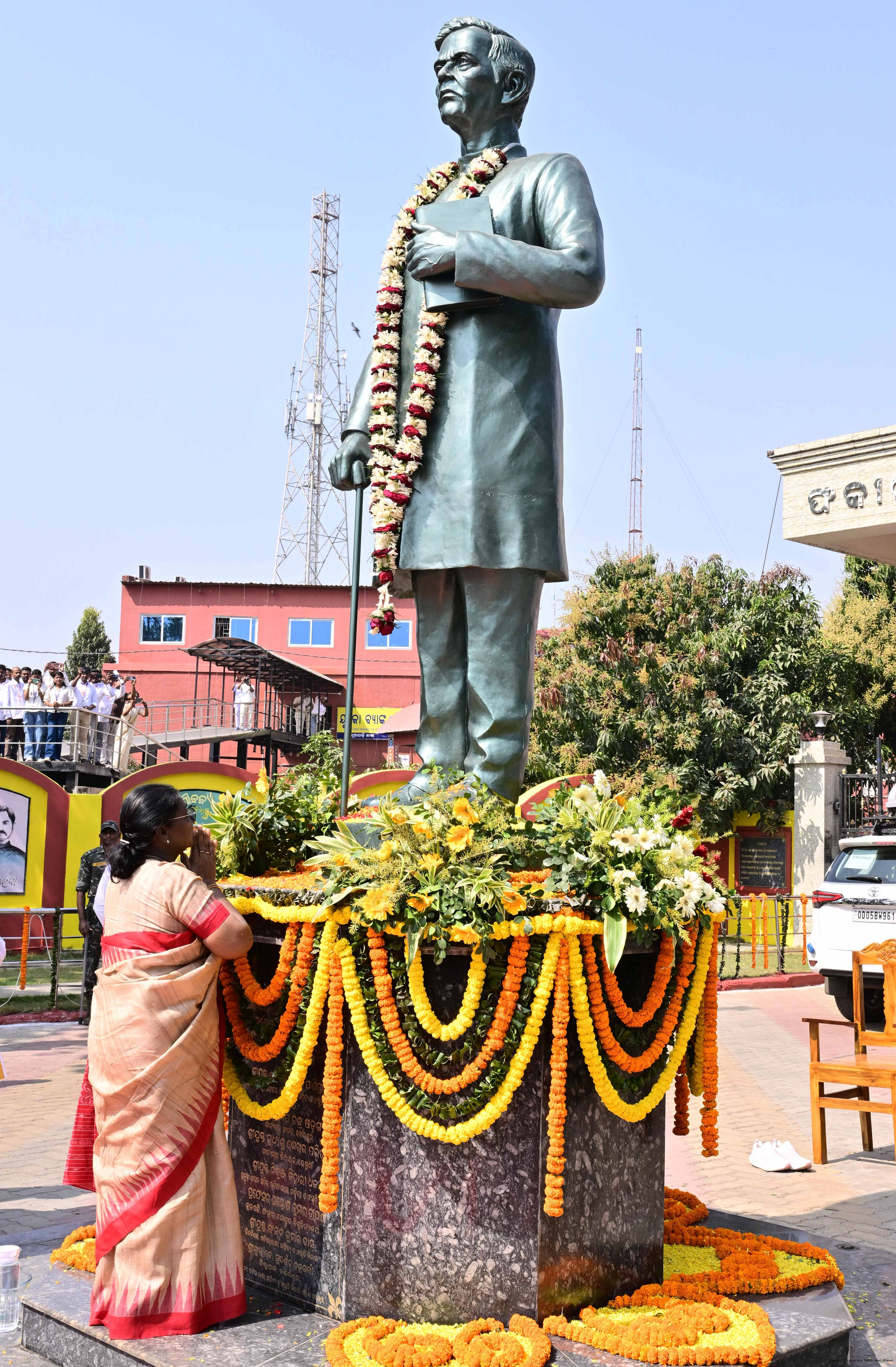 | Caption: | The President of India, Smt Droupadi Murmu paid floral tribute at the statue of fakir mohan senapati at the main gate of the university at Balasore, Odisha on February 3, 2026. |